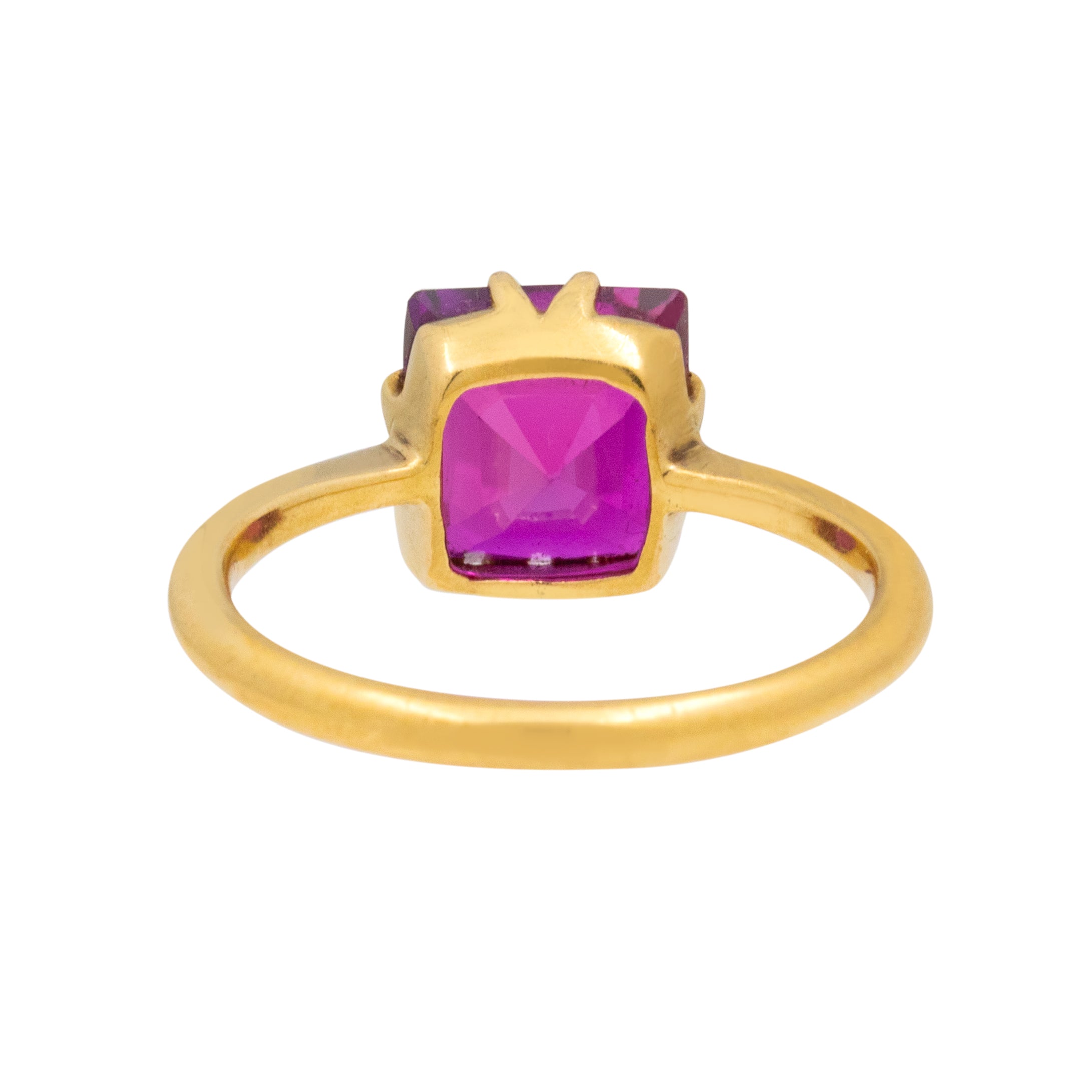 VERY GOOD-EXCELLENT. This antique 18ct Gold Ruby solitaire ring is in wonderful condition. The Ruby is set securely within her claw settings and has an admirable hot pink hue throughout. The is a small surface mark on the culet of the Ruby, but this is only noticeable under a jeweller's loupe. The ring band has retained a well rounded form and glides onto your hand a dream. This Victorian ring is the perfect pick to add an instant pop of colour to any attire!