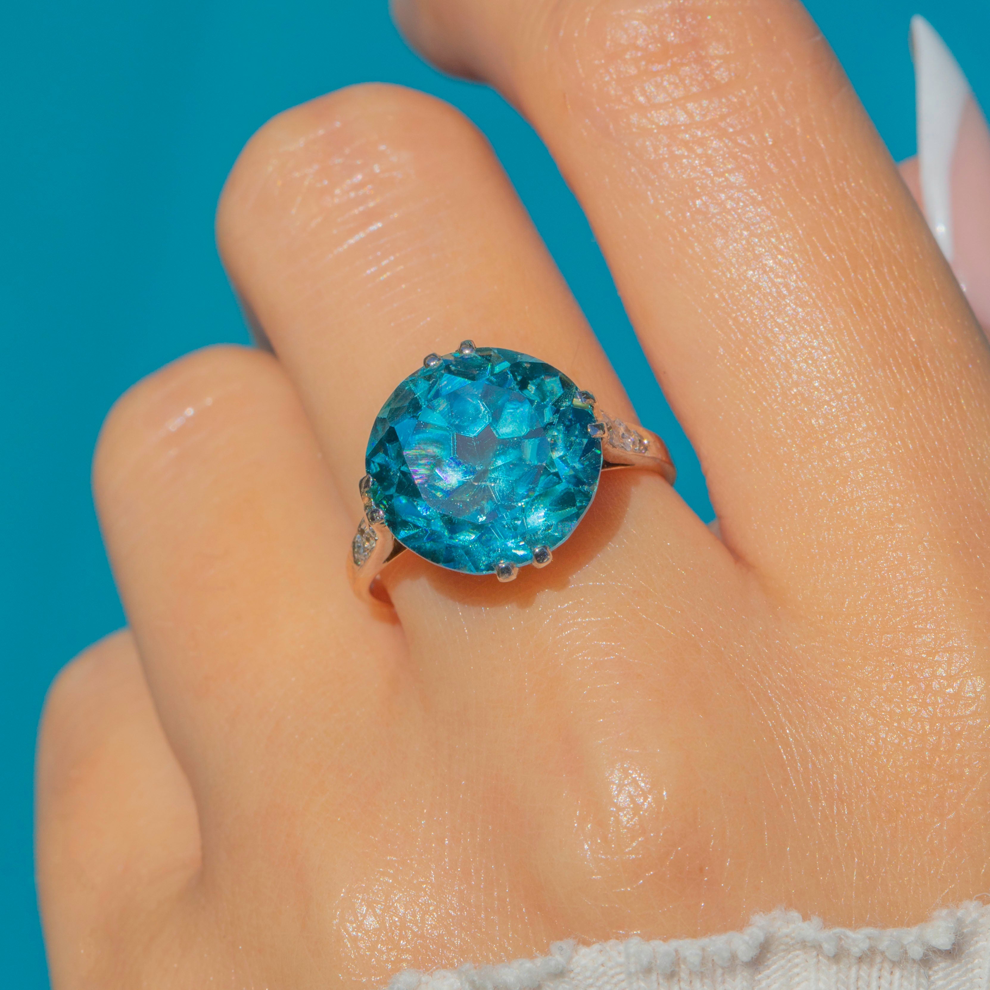 This spectacular Art Deco ring is set with a dazzling Zircon of approximately 11 carats. The Zircon’s intense teal blue hue glitters with brilliance and fire, displaying the remarkable dispersion that makes this gemstone so prized. Its impressive size and radiant sparkle make it a true statement piece.