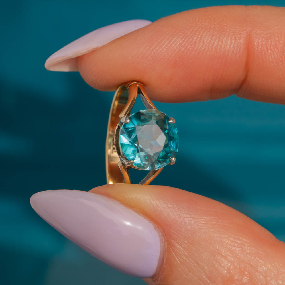 Add a touch of antique glamour to your repertoire with this glowing Art Deco 9ct Gold blue Zircon solitaire ring! The vibrant 2.21ct Zircon boasts electric blue hues, held proudly within a high gallery allowing the light to stream through from every angle creating a spectacular display of twinkling facets as she adorns your hand.