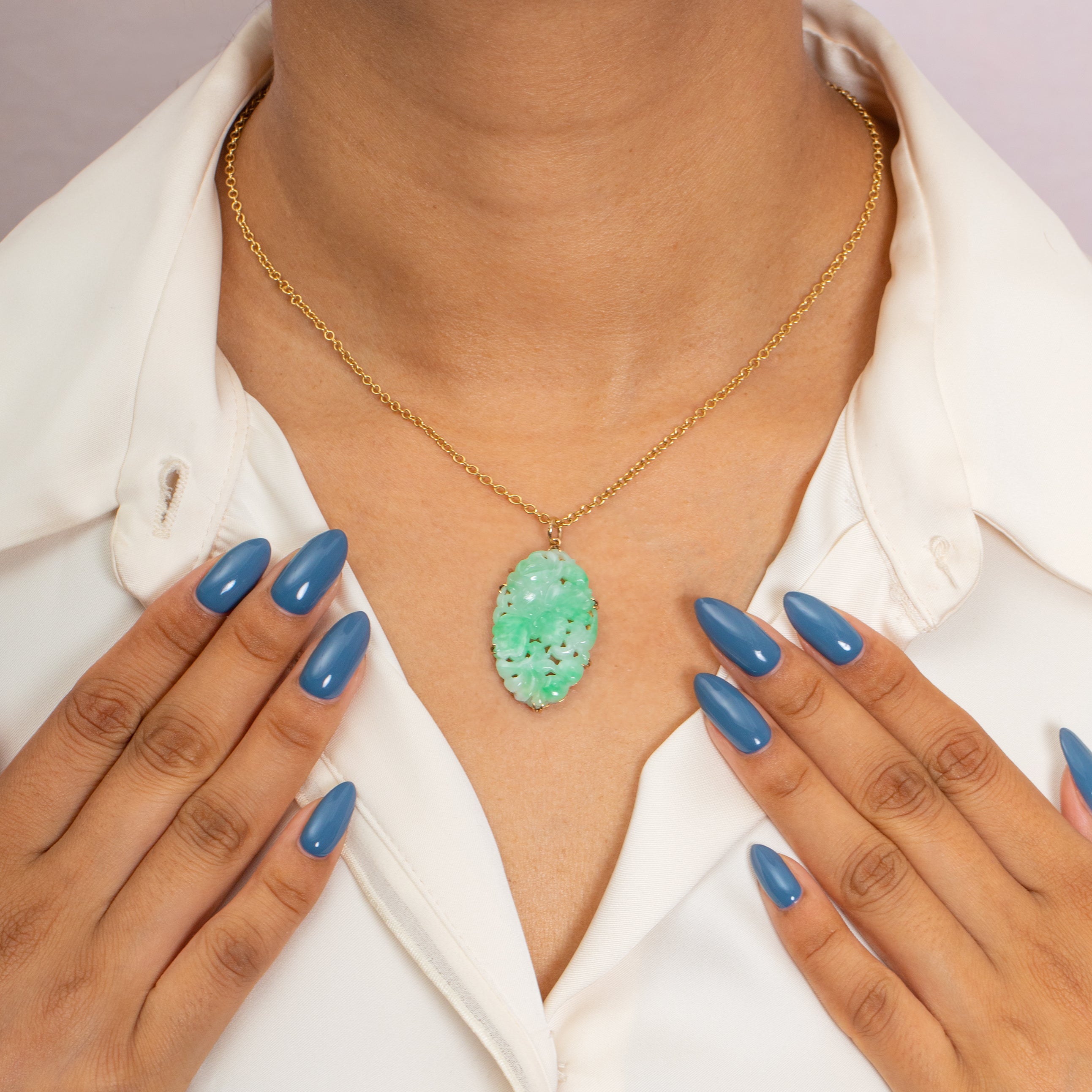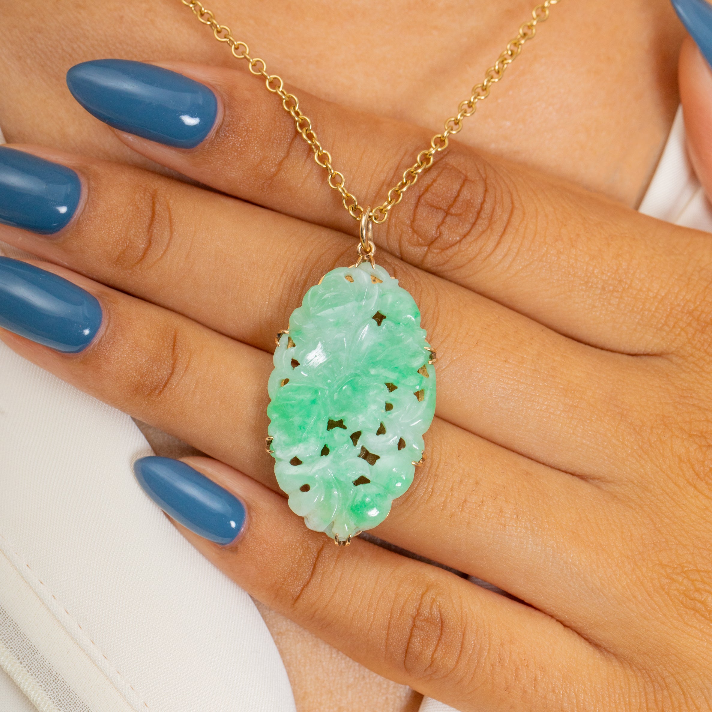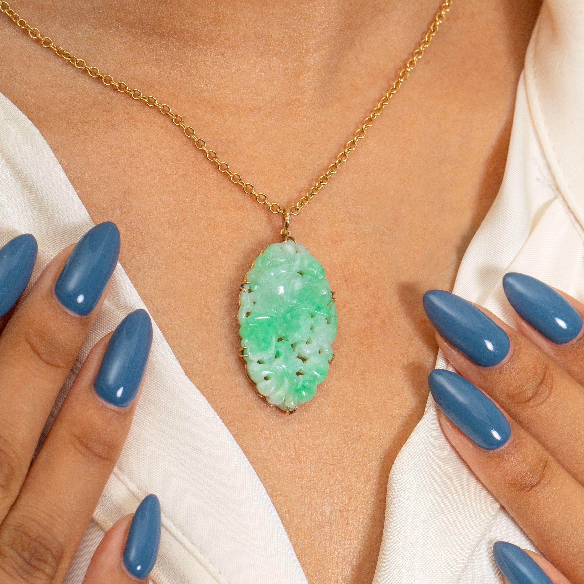 Hugged by six tapered claw settings crafted from buttery 9ct Gold, they complement the Jade perfectly, adding a luxurious finish. This is the perfect antique Gold pendant to make a statement and will become a firm favourite in the upcoming summer months!
