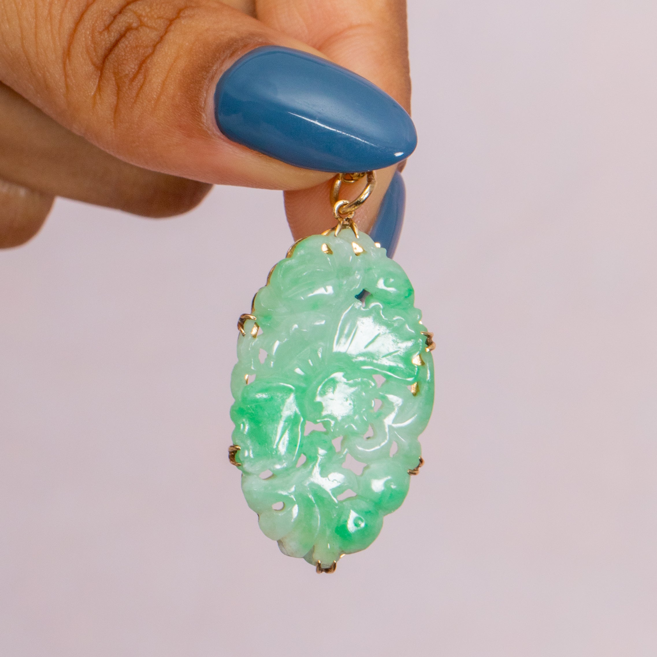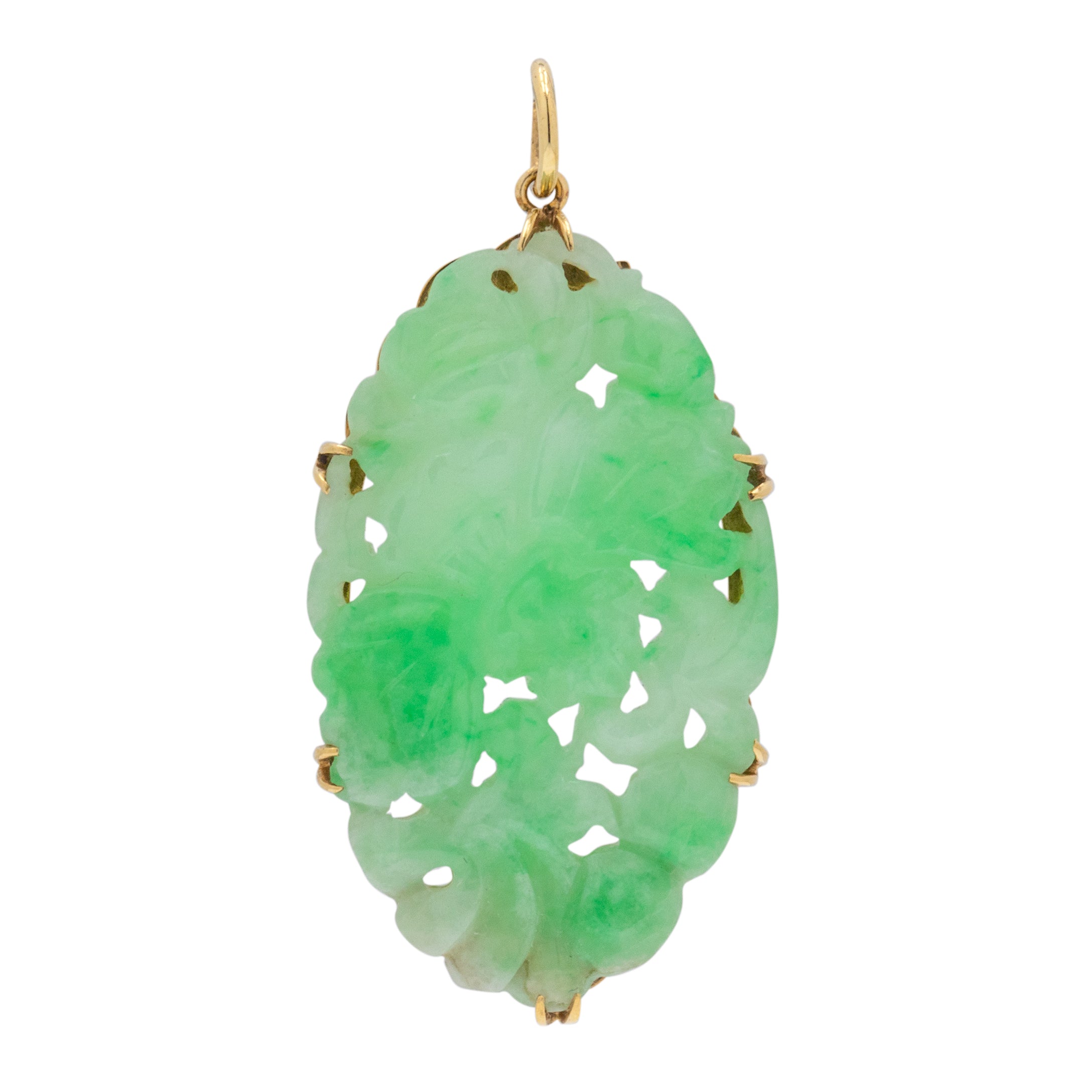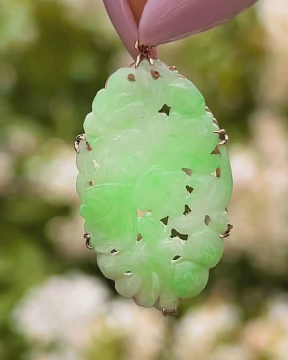 Floral and feminine, this pretty Art Deco 9ct Gold carved Jade pendant is everything you need! The green Jade gemstone is dabbled with seafoam and minty greens, carved to feature foliate motifs.