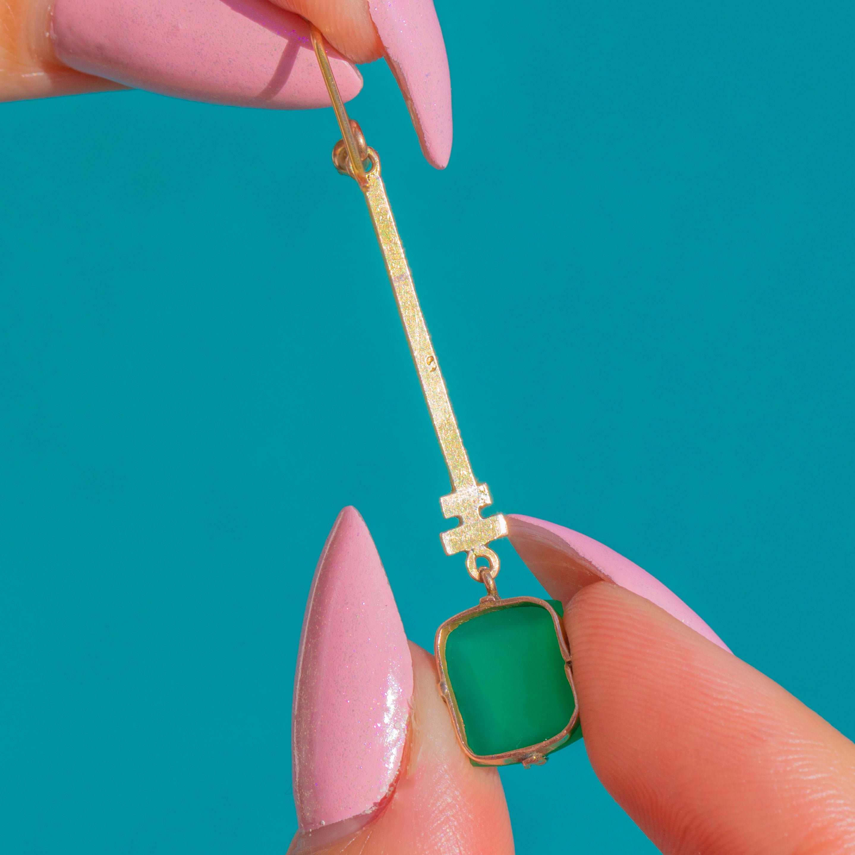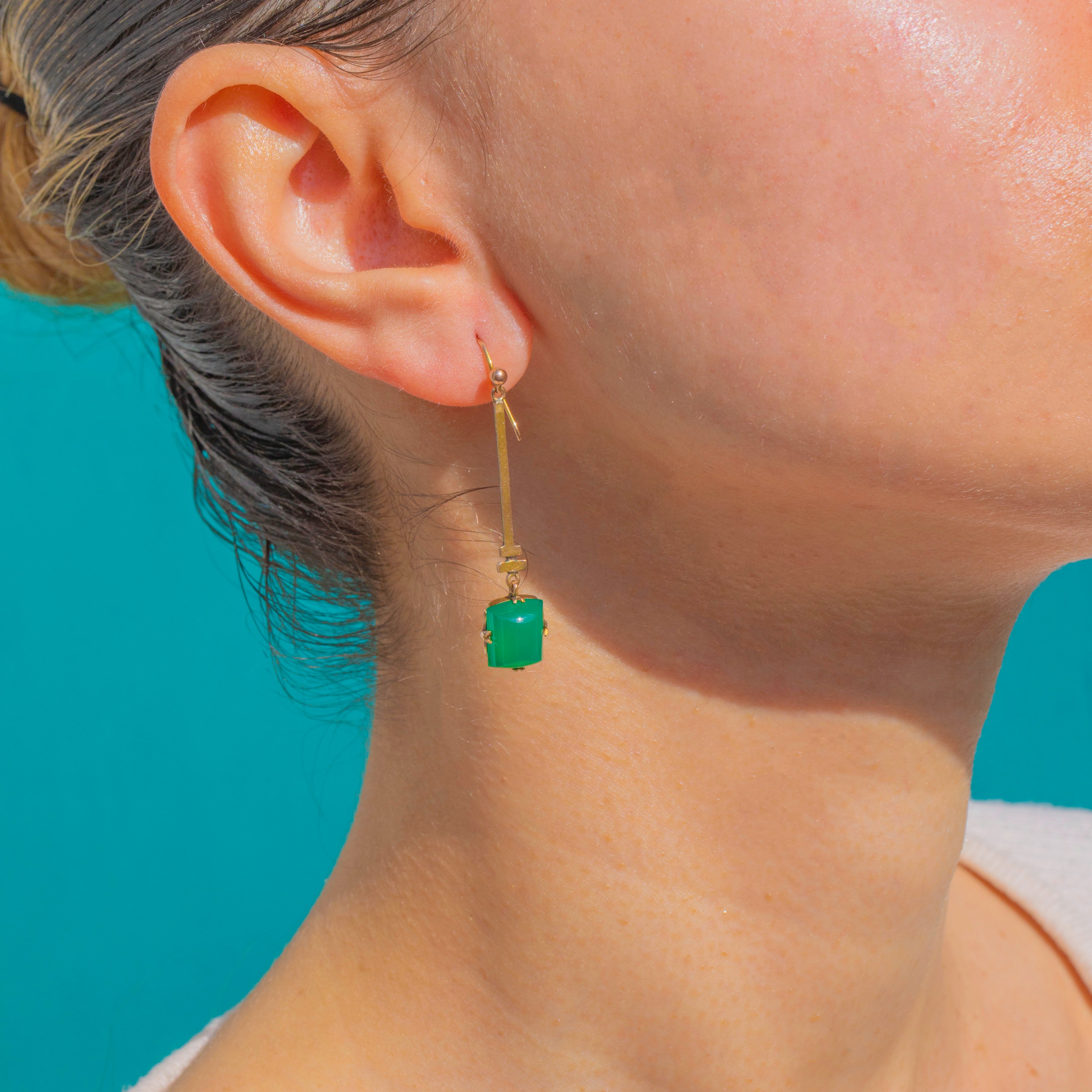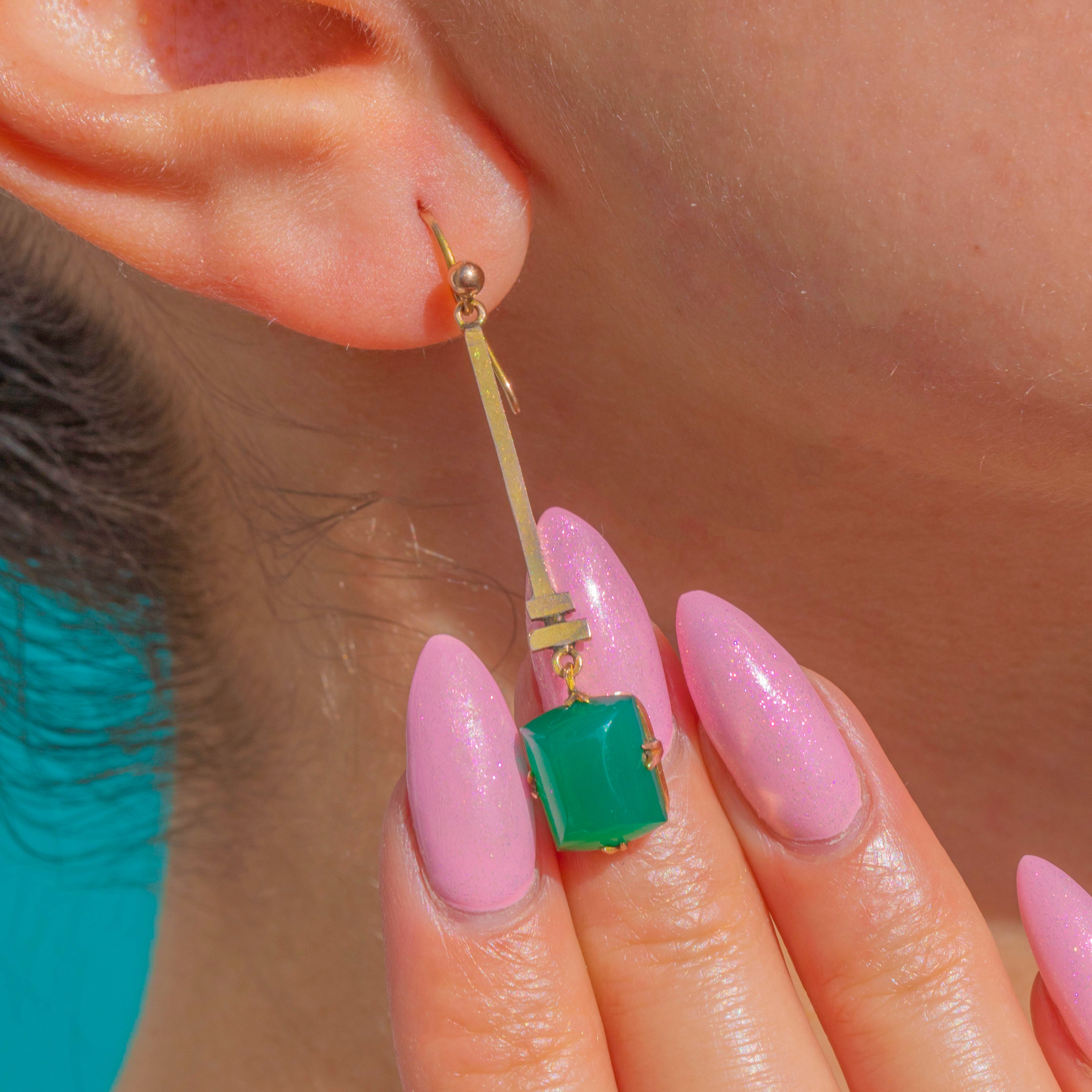 Sleek and sculptural, these Art Deco 9ct Gold drop earrings distil the era’s love of clean lines and vivid colour. A slender, textured bar leads the eye to a lush green Chalcedony drop, the saturated hue glowing beautifully against warm Gold.