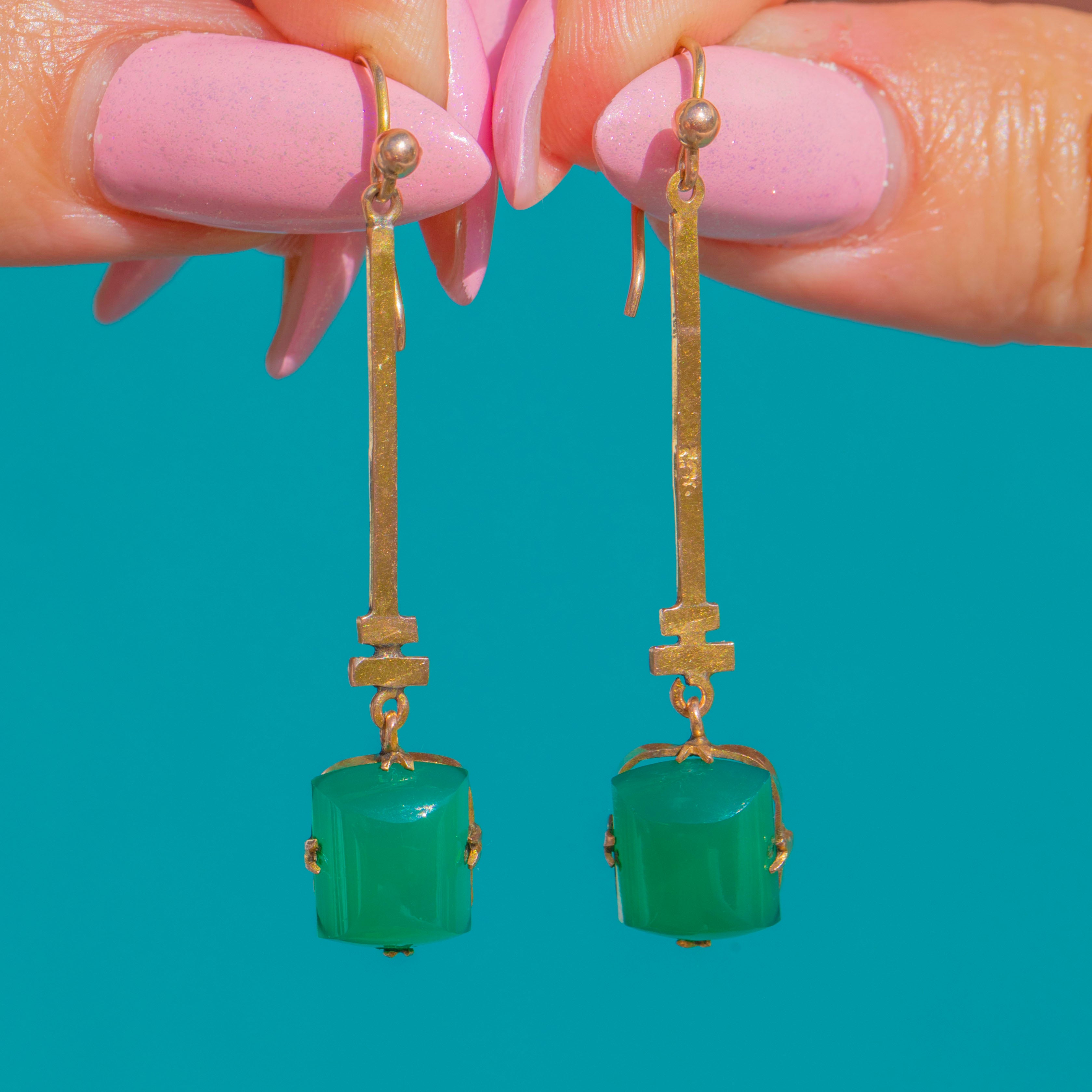 Art Deco 9ct Gold Green Chalcedony Drop Earrings