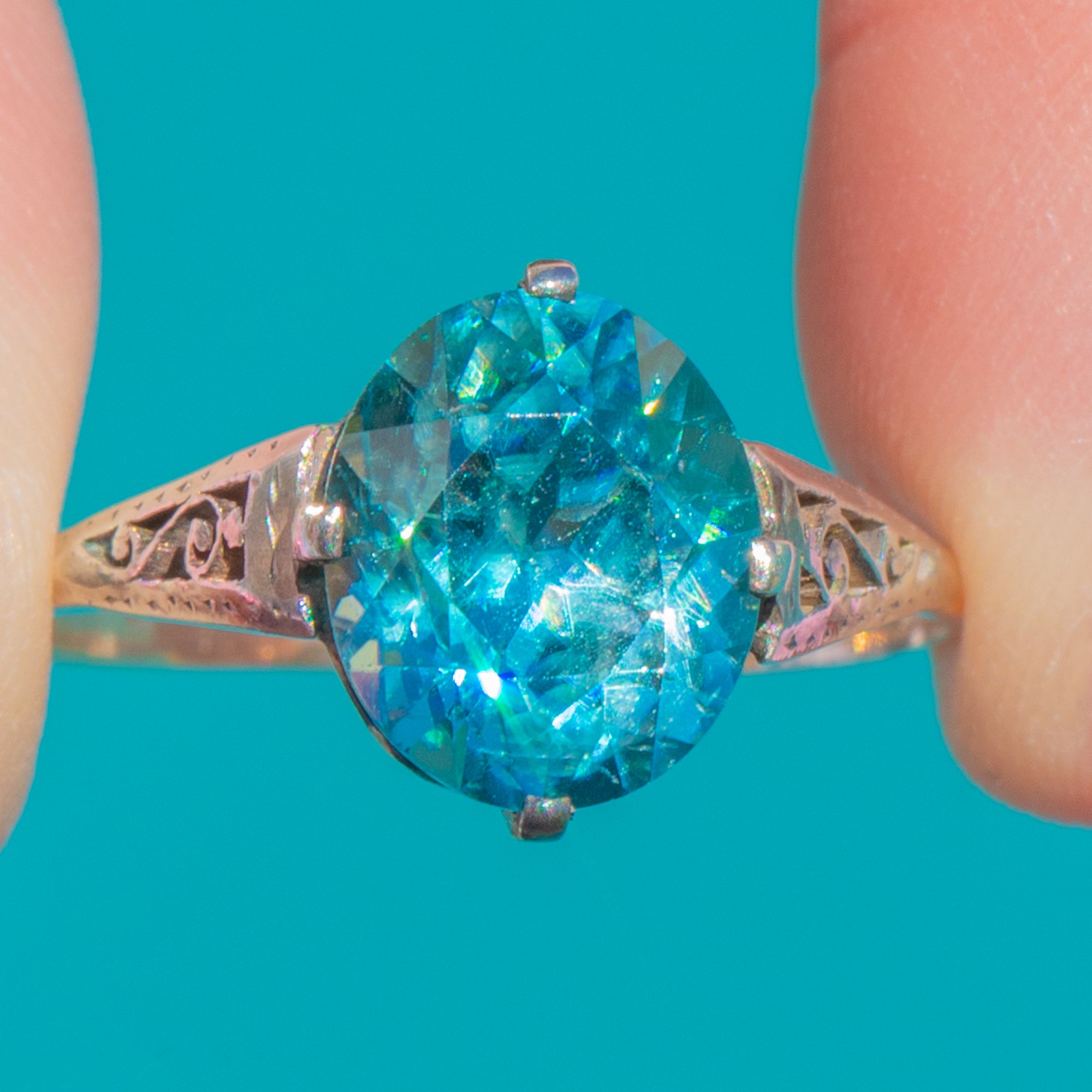 Alive with teal-blue fire, the approximately 4.50ct Zircon sits high to welcome the light, creating a captivating play of brilliance and colour. Poised, airy and graceful, it’s a timeless statement with that unmistakable Deco elegance.