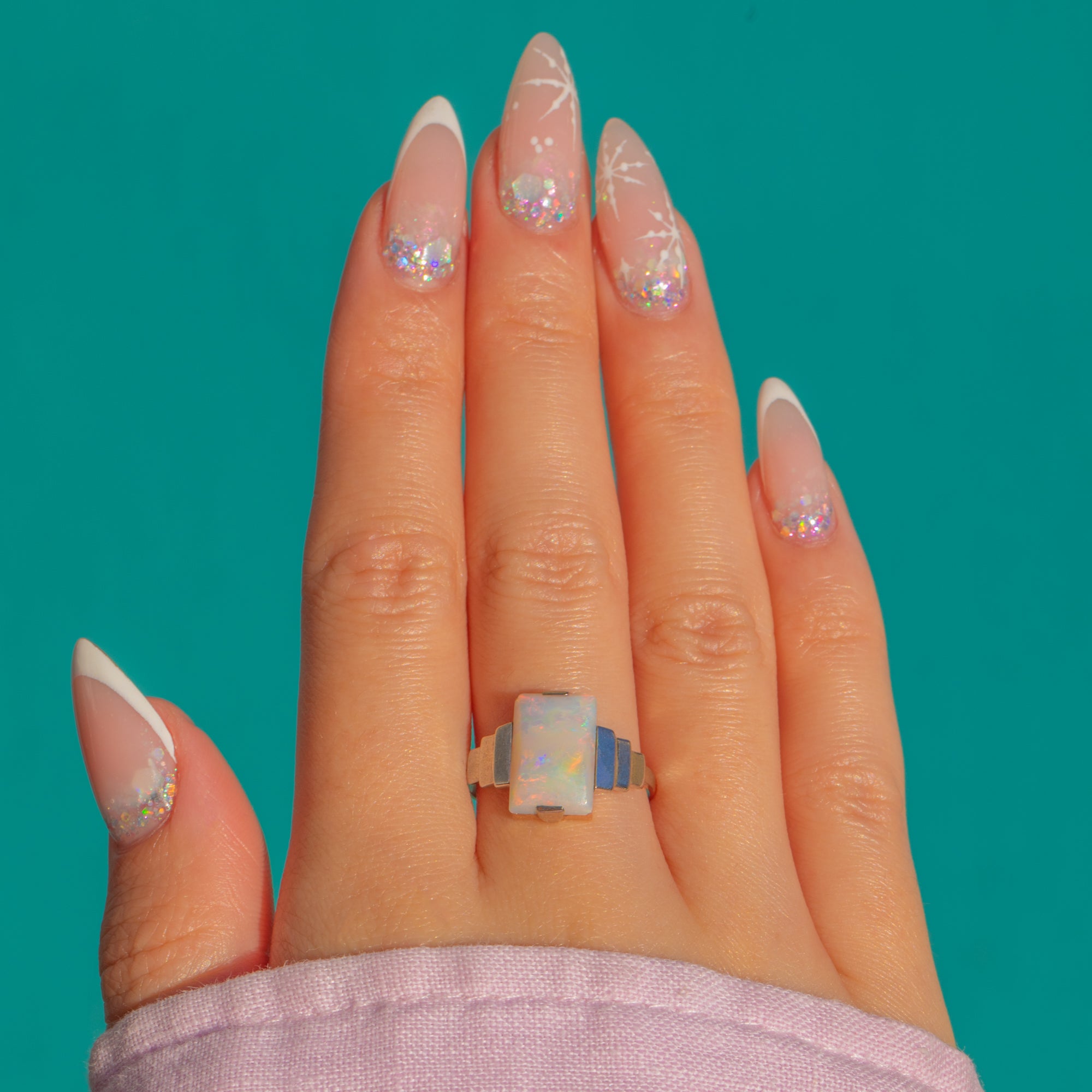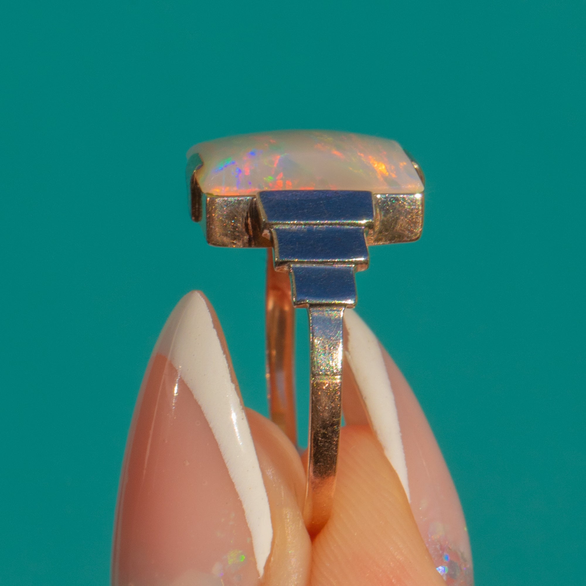 This Art Deco Opal solitaire ring is a beautiful example of 1920s design, combining clean geometric lines with soft, luminous colour. The natural Opal displays an ethereal play of colour, its elongated shape creating a striking and elegant presence on the hand.