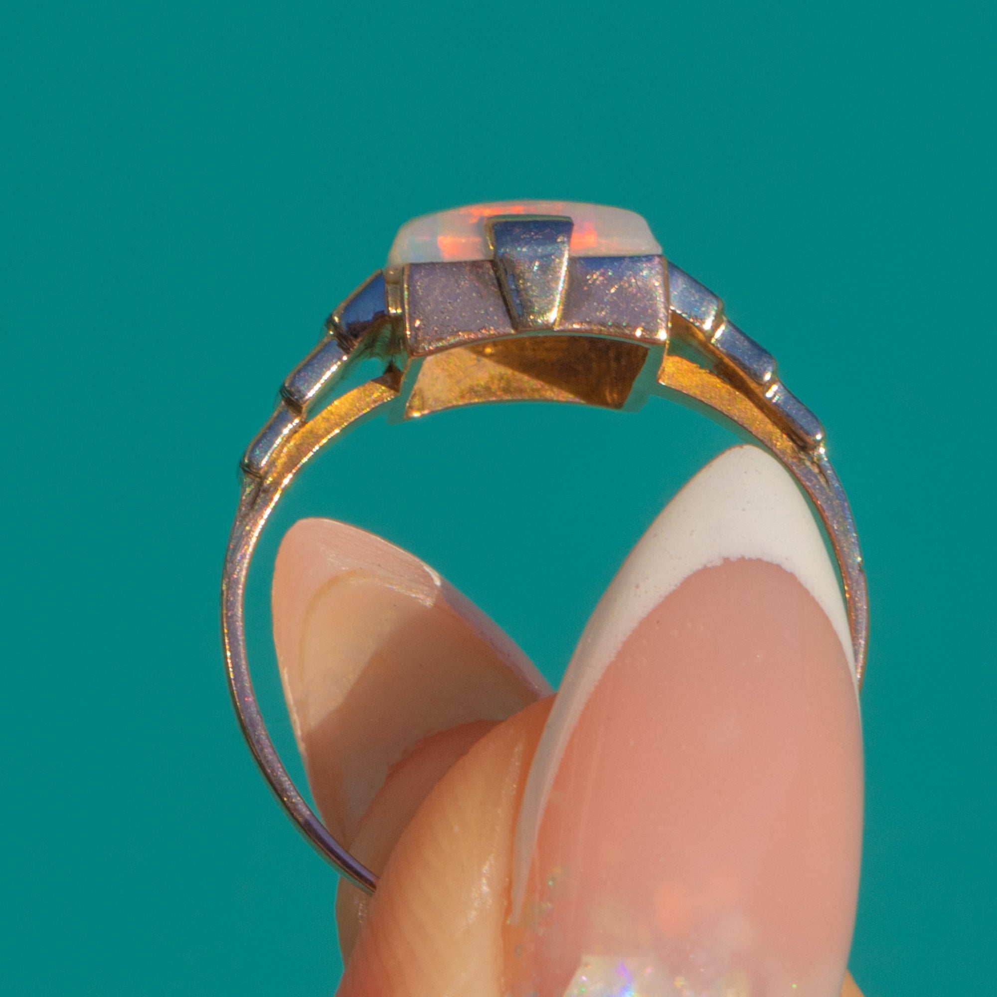 EXCELLENT: The Opal is in excellent condition with no chips, cracks or surface wear visible under magnification. The Gold settings and band are in superb condition with minimal signs of wear. A beautifully preserved Art Deco ring.
