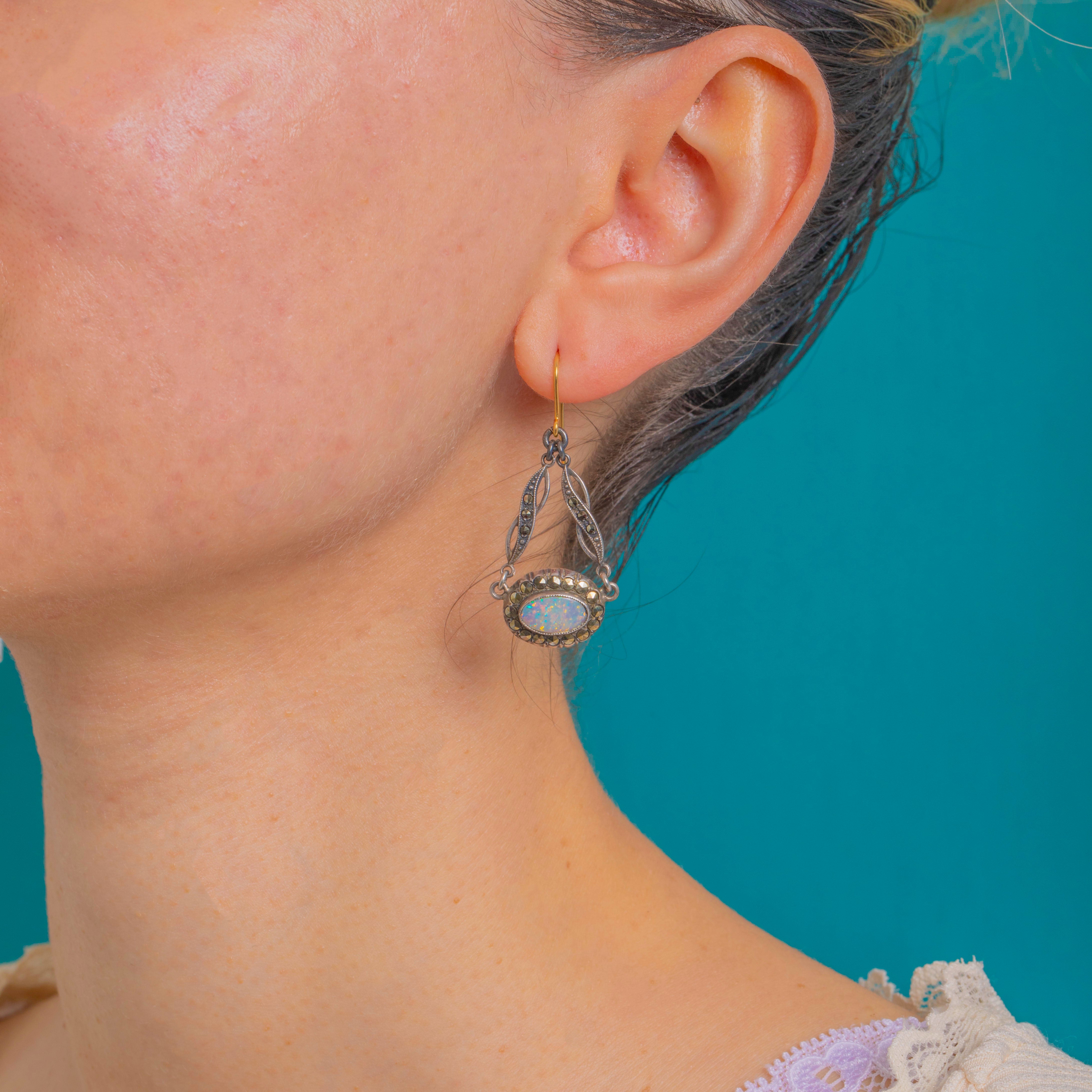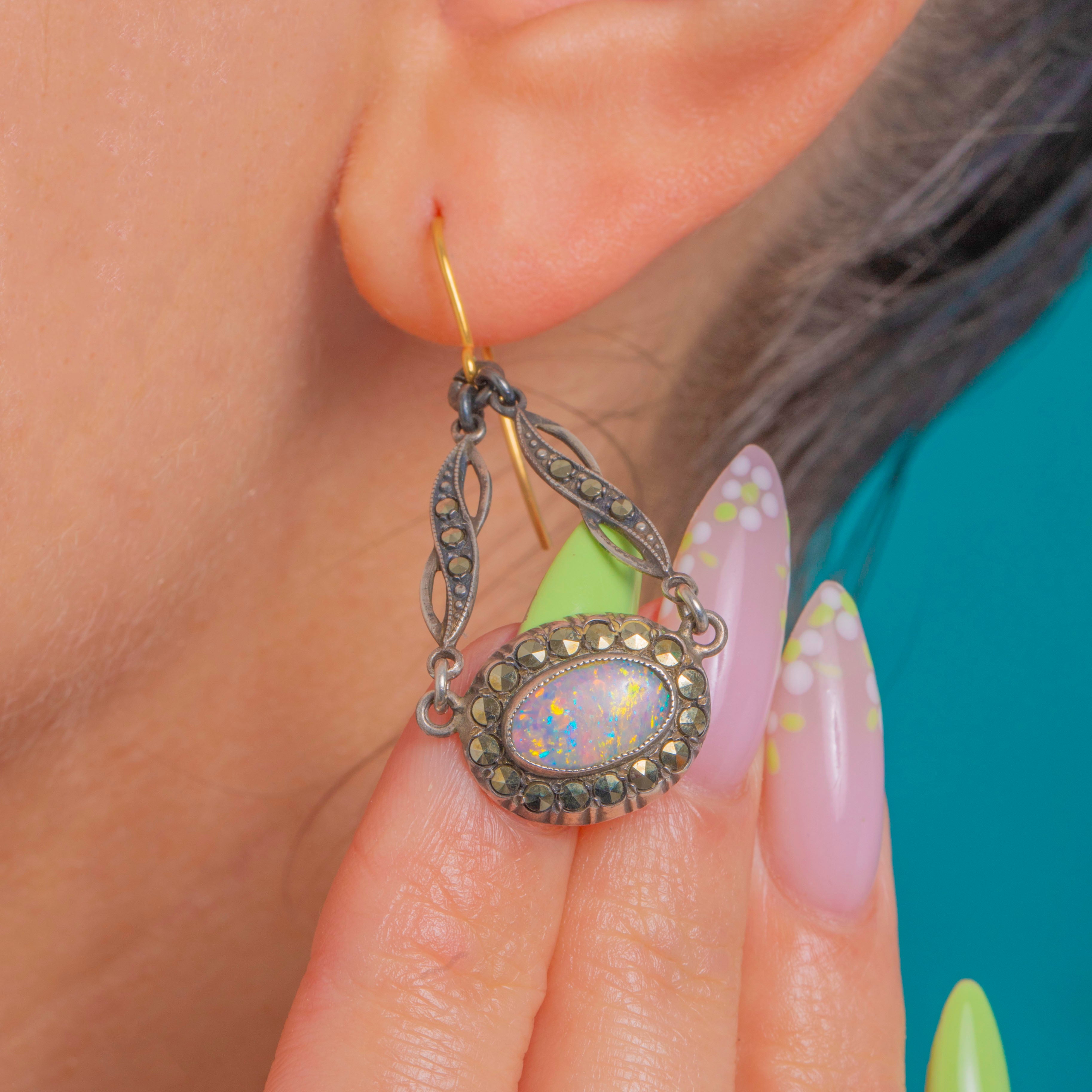 The Opals glow with blue‑green and soft pink fire against the softly oxidised Silver, while the Marcasite brings that signature Deco sparkle. Stamped STERLING and finished with 9ct Gold hooks, they’re an effortlessly elegant day‑to‑evening choice.
