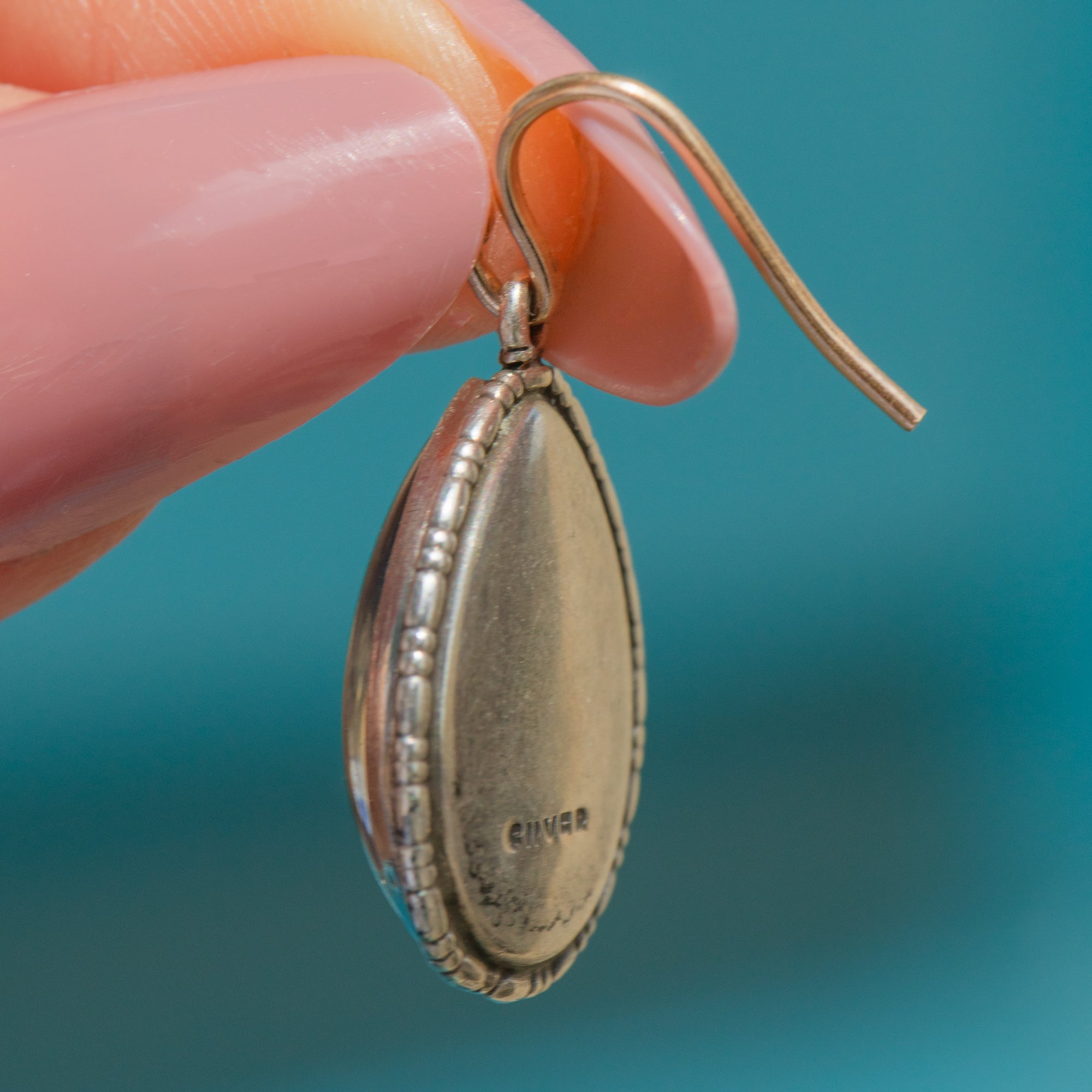 A decorative border frames each Sterling Silver bezel setting, the style of which is often found in this type of Art Deco jewellery. Complete with 9ct Gold hooks for a luxurious finish, these antique Butterfly Wing earrings will make a fun addition to your outfit!