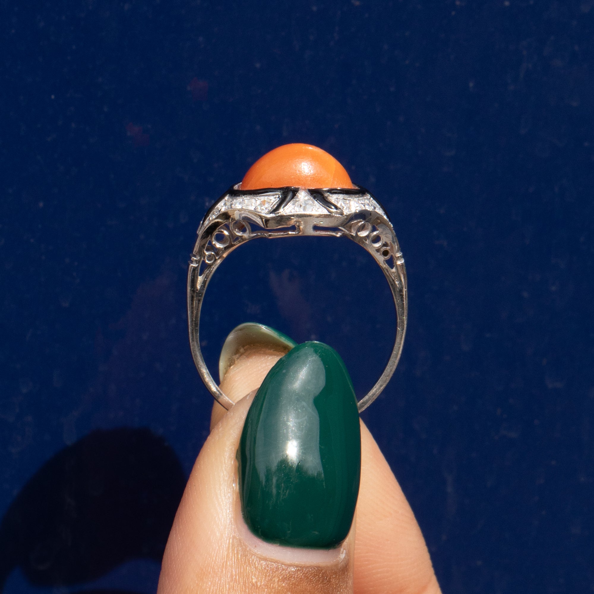 How divine is this Art Deco Coral and black Enamel Diamond ring?! Homing a plump Coral cabochon a her centre, flaunting tangy apricot hues, encircled by a sea of scintillating Diamonds segmented by fine lines of jet-black Enamel, this ring perfectly captures Art Deco design at its finest.