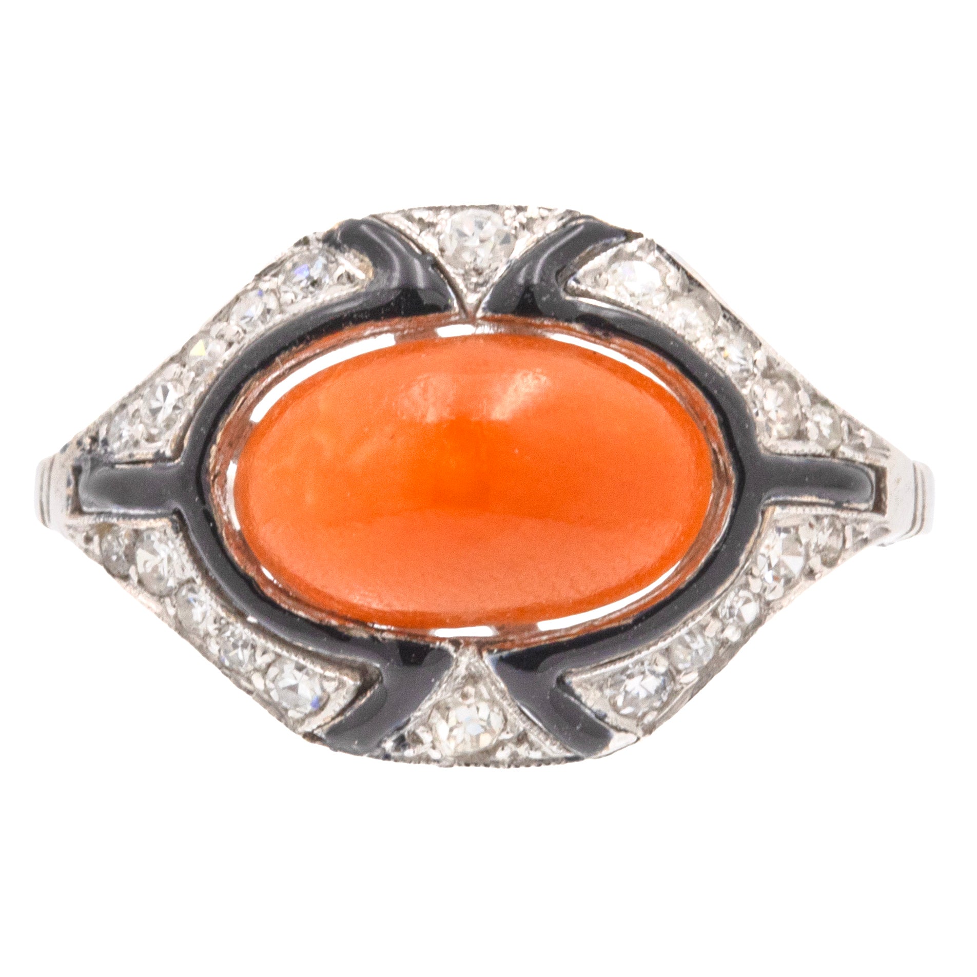 Art Deco Coral & Black Enamel Diamond Ring