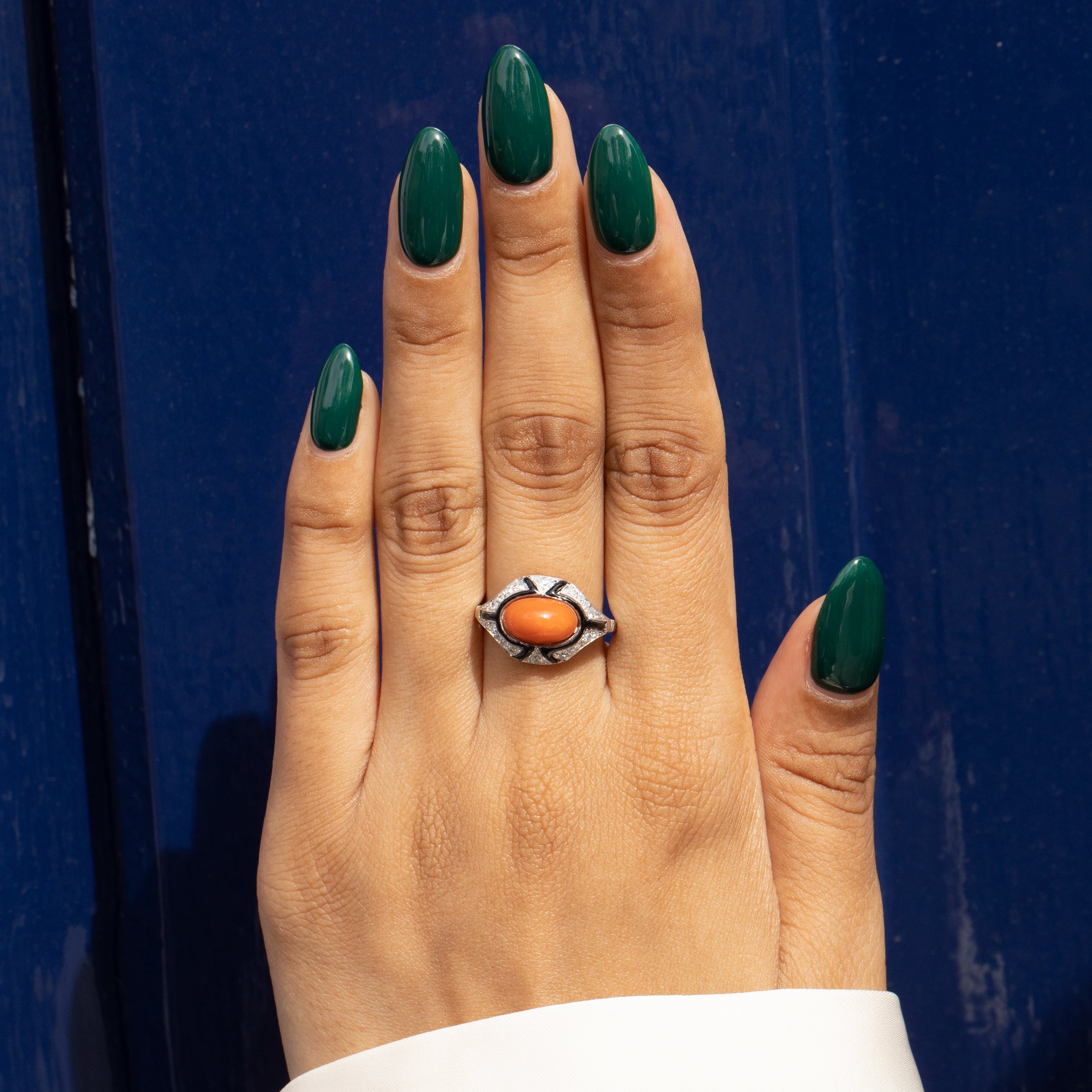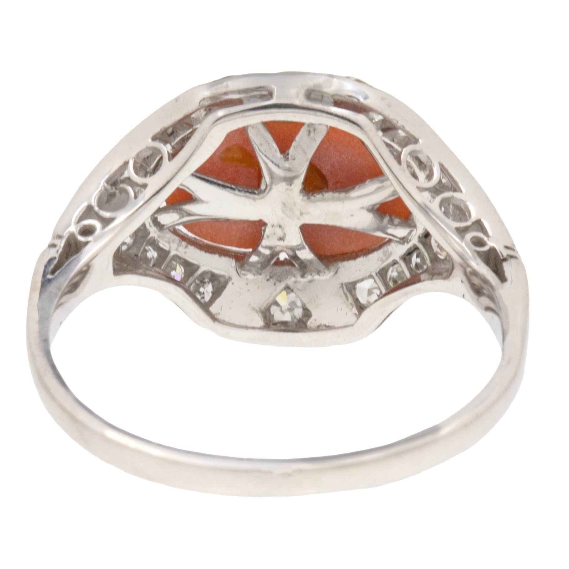 The unique design of this Art Deco Diamond ring has a subtle Egyptian Revival allure, a heavily popular style to come from the 1920's. Bound together by lustrous 18ct White Gold, the splendour of this antique Coral ring is unmatched!