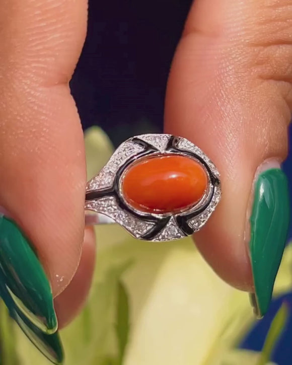 VERY GOOD-EXCELLENT. This Art Deco Coral and black Enamel Diamond ring is in wonderful condition! The ring itself is gorgeous, with the 18ct White Gold retaining its structural integrity and gliding onto your hand a dream. The Coral is smooth, sleek and overall a lovely natural stone. With crisp Enamel throughout, this ties the piece together and makes her pop!