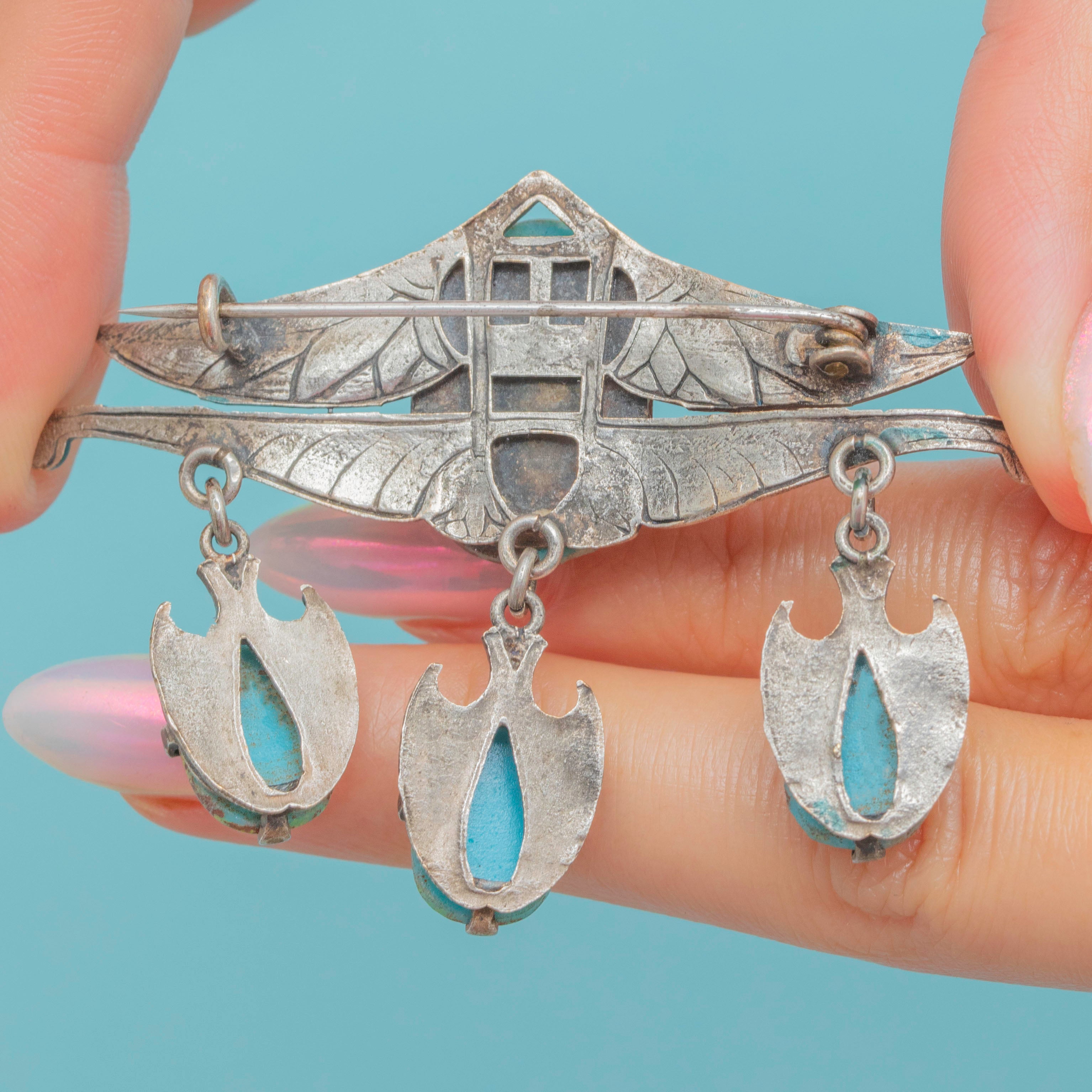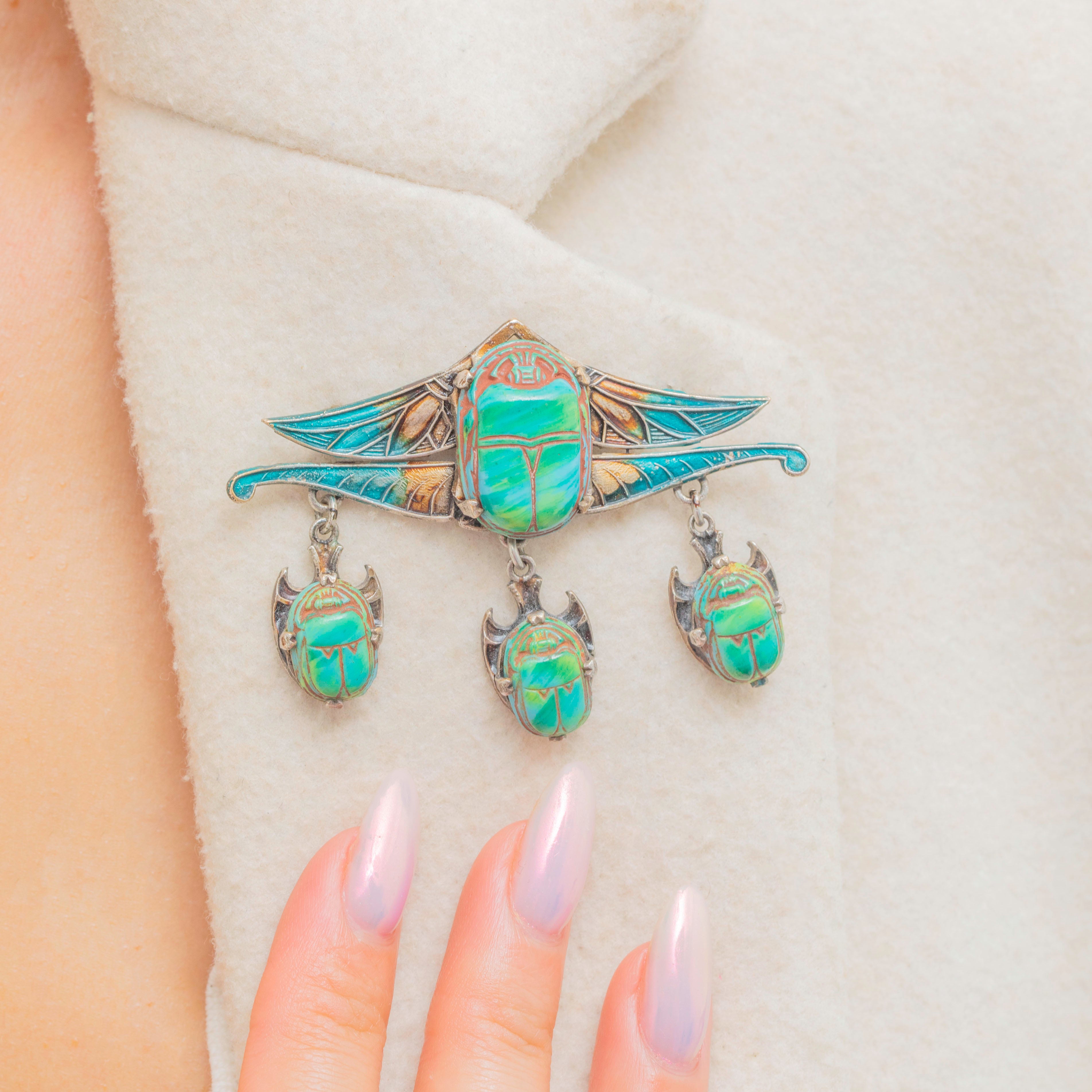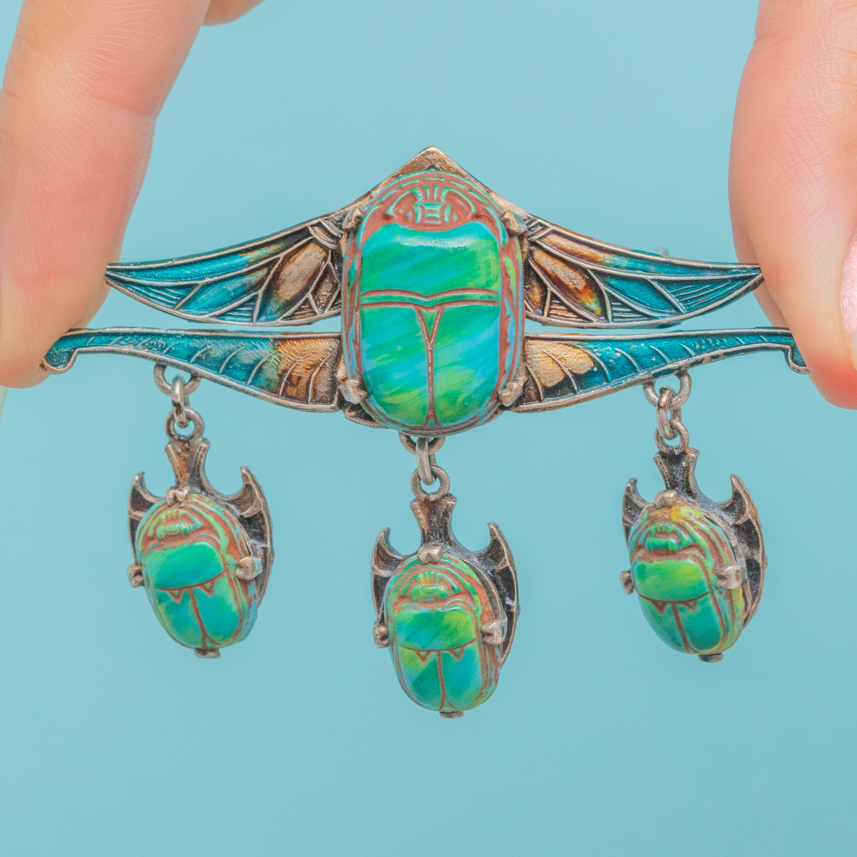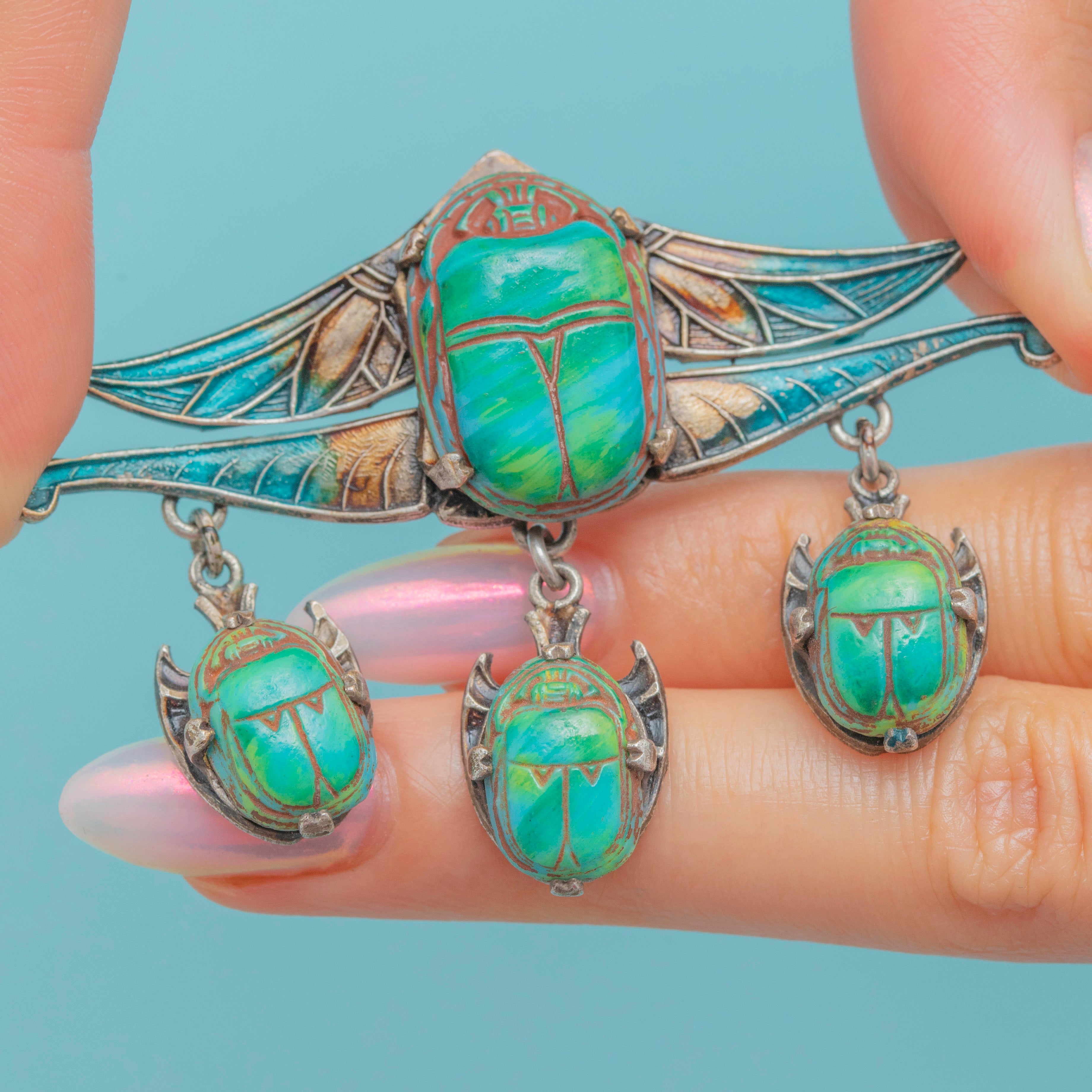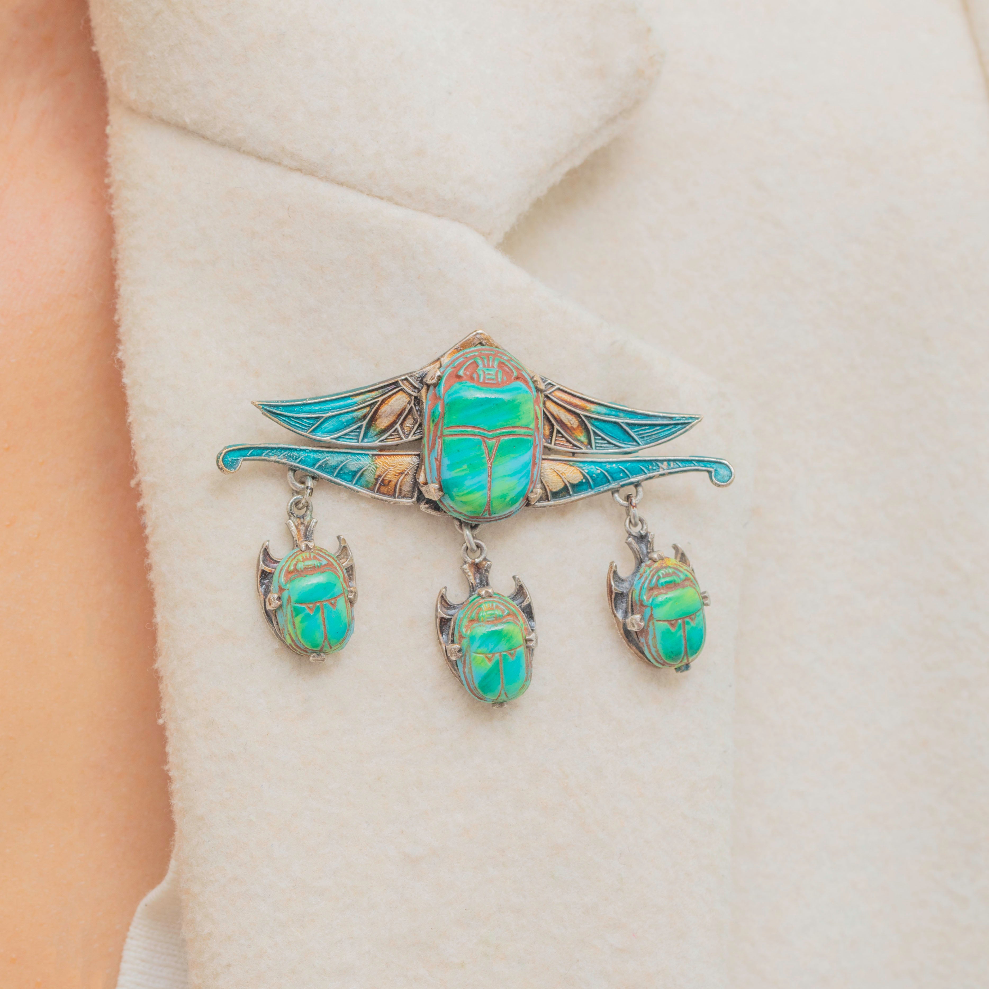 This Art Deco piece suspends three additional scarab beetles, dancing with movement as they rest beneath the brooch. Complete with large teal Enamel wings, crafted with ornate details for added texture and depth, this Art Deco Egyptian brooch is sure to radiate antique allure as it adorns your attire.