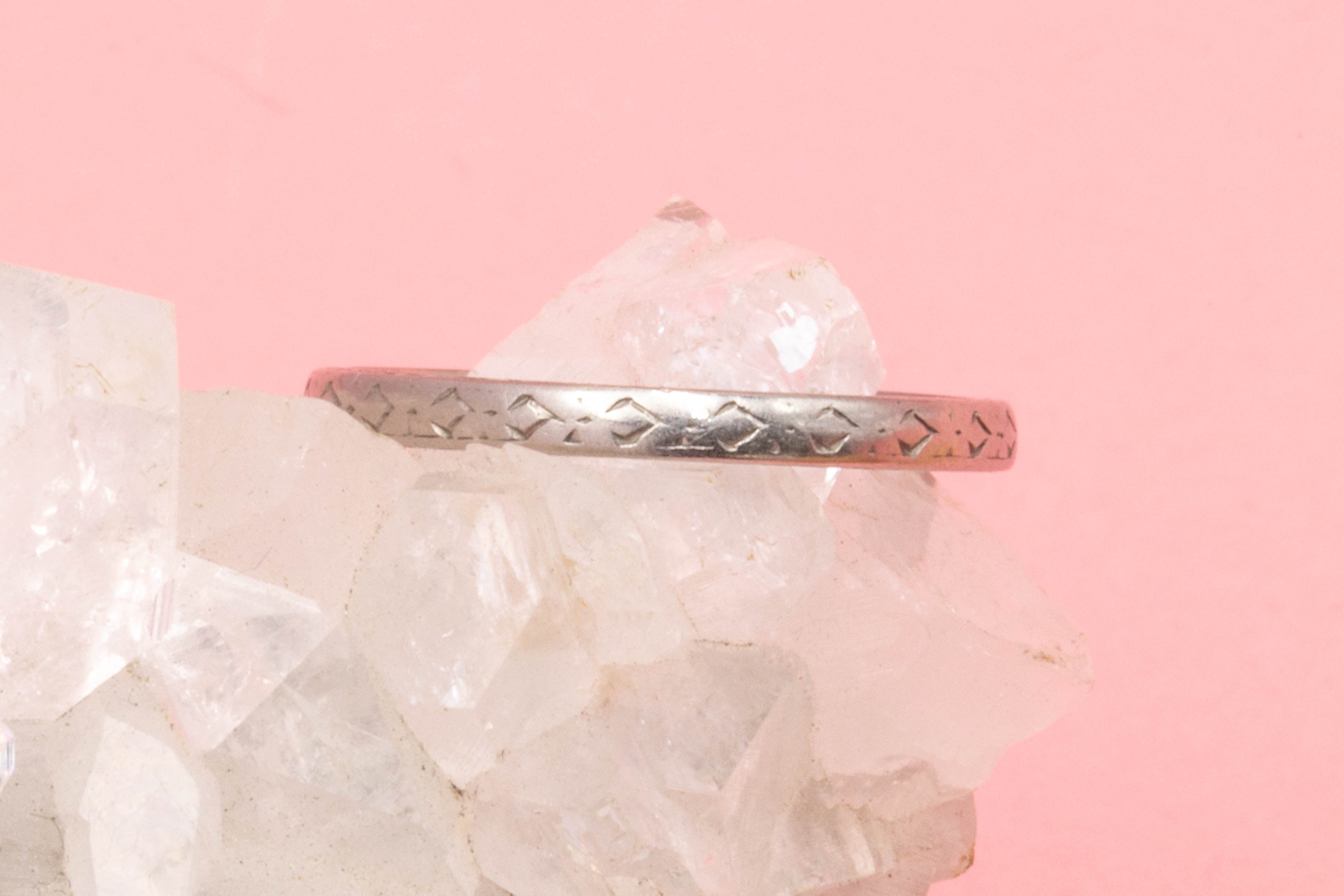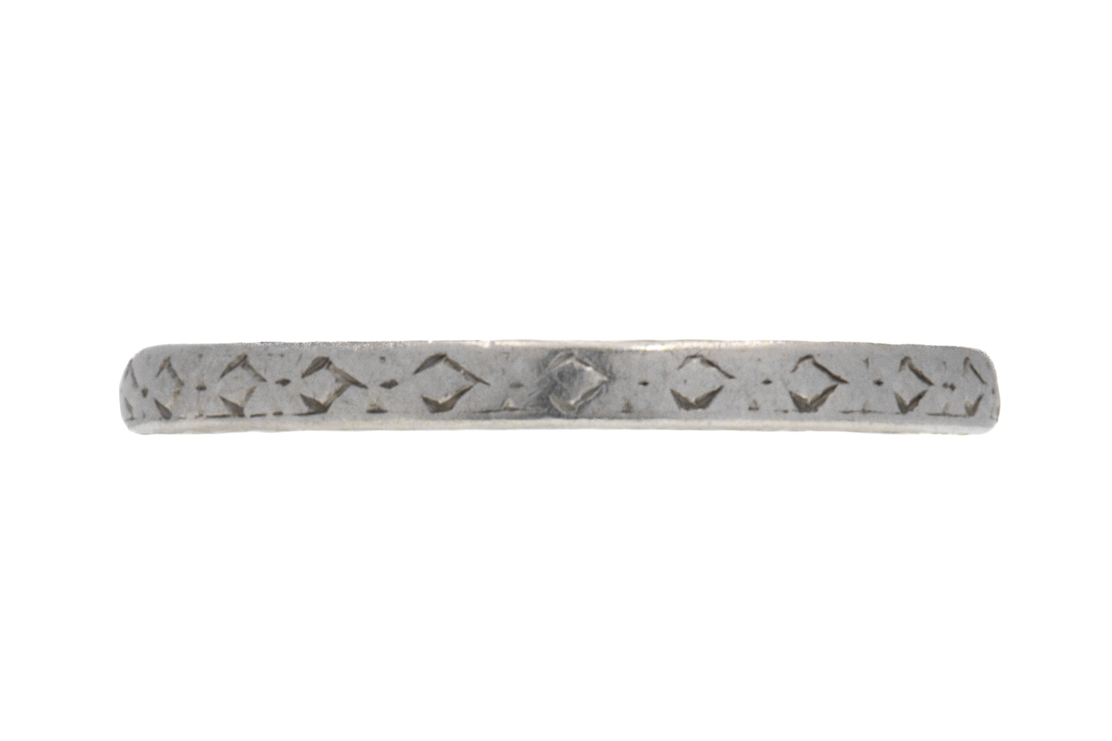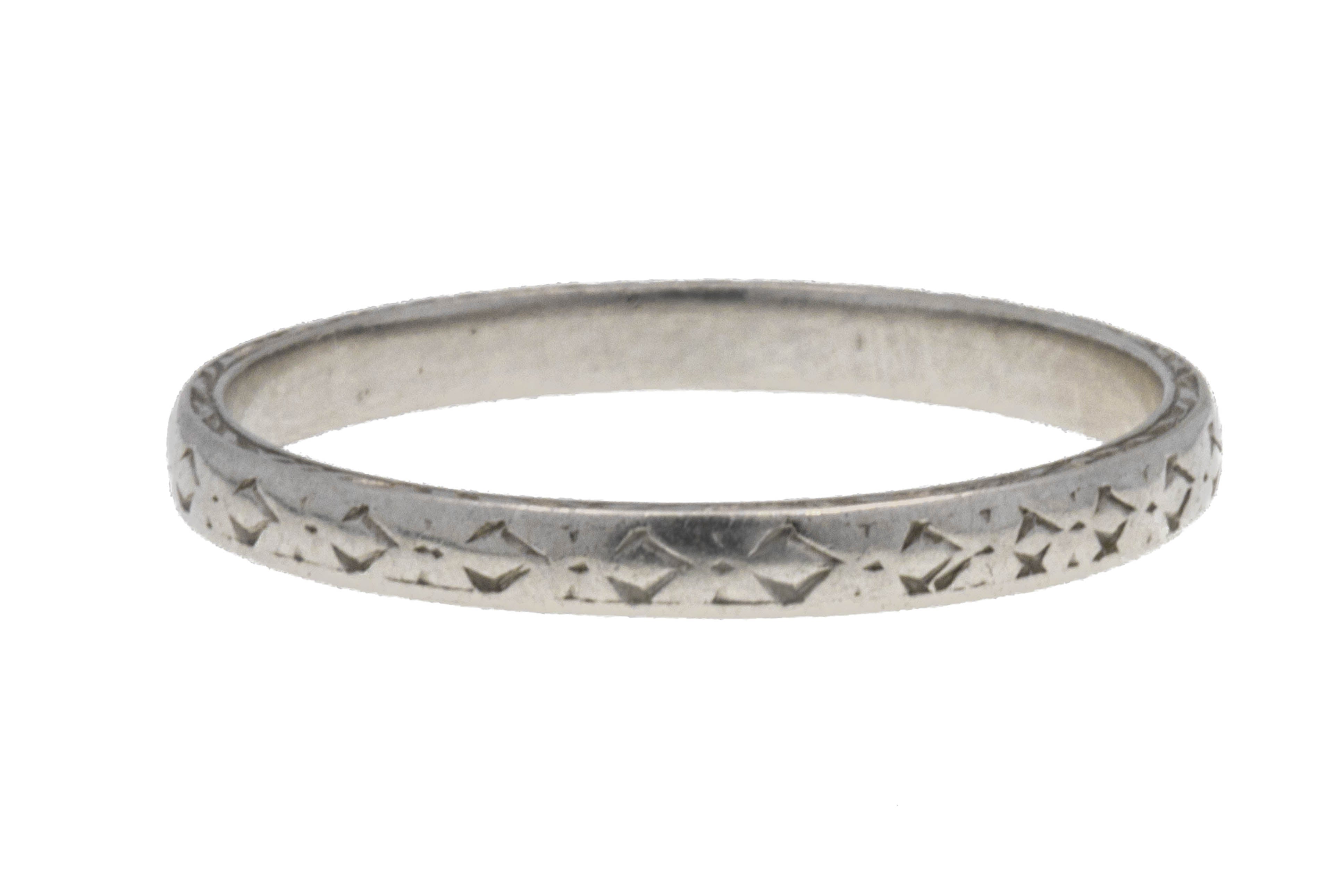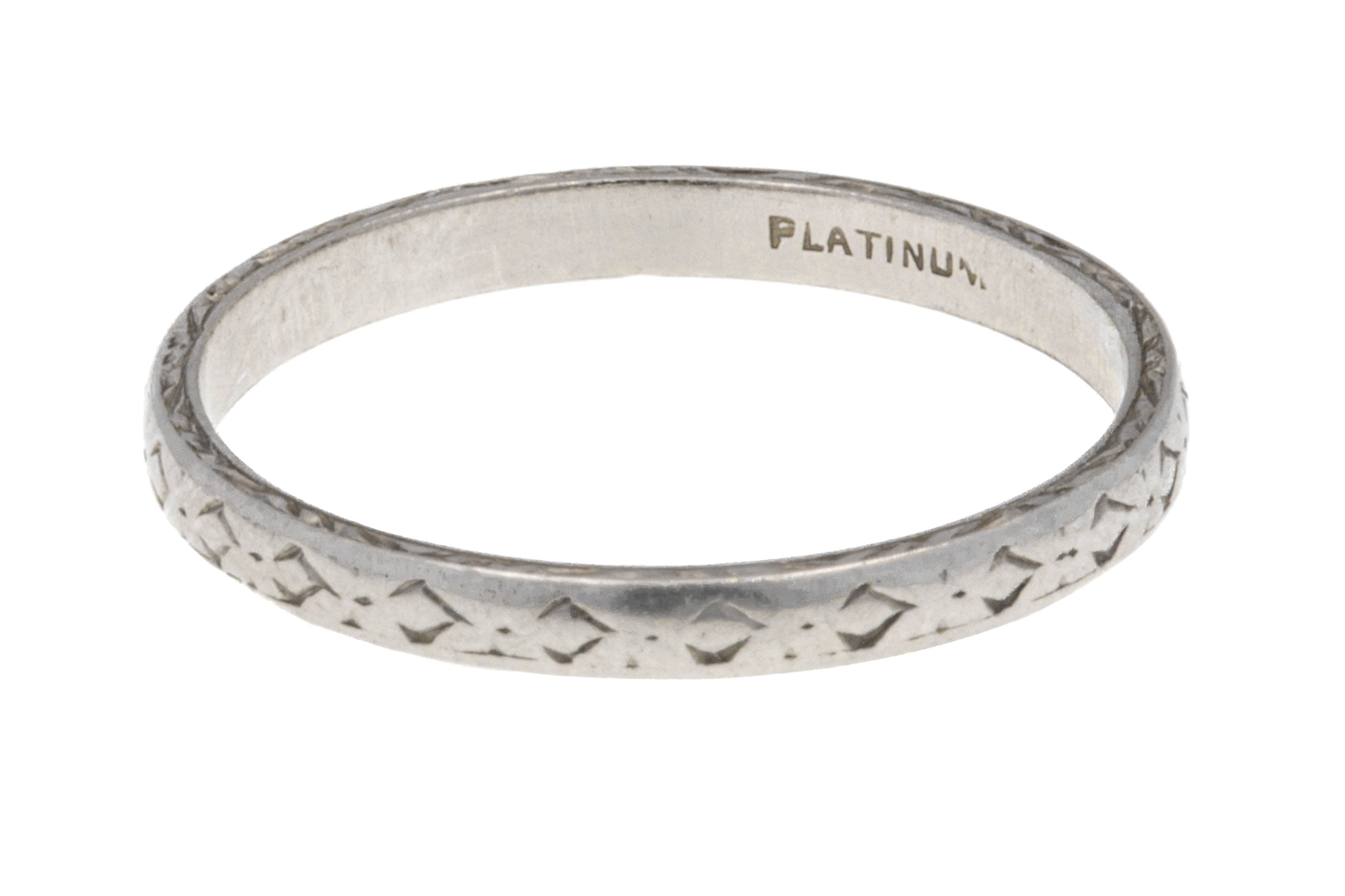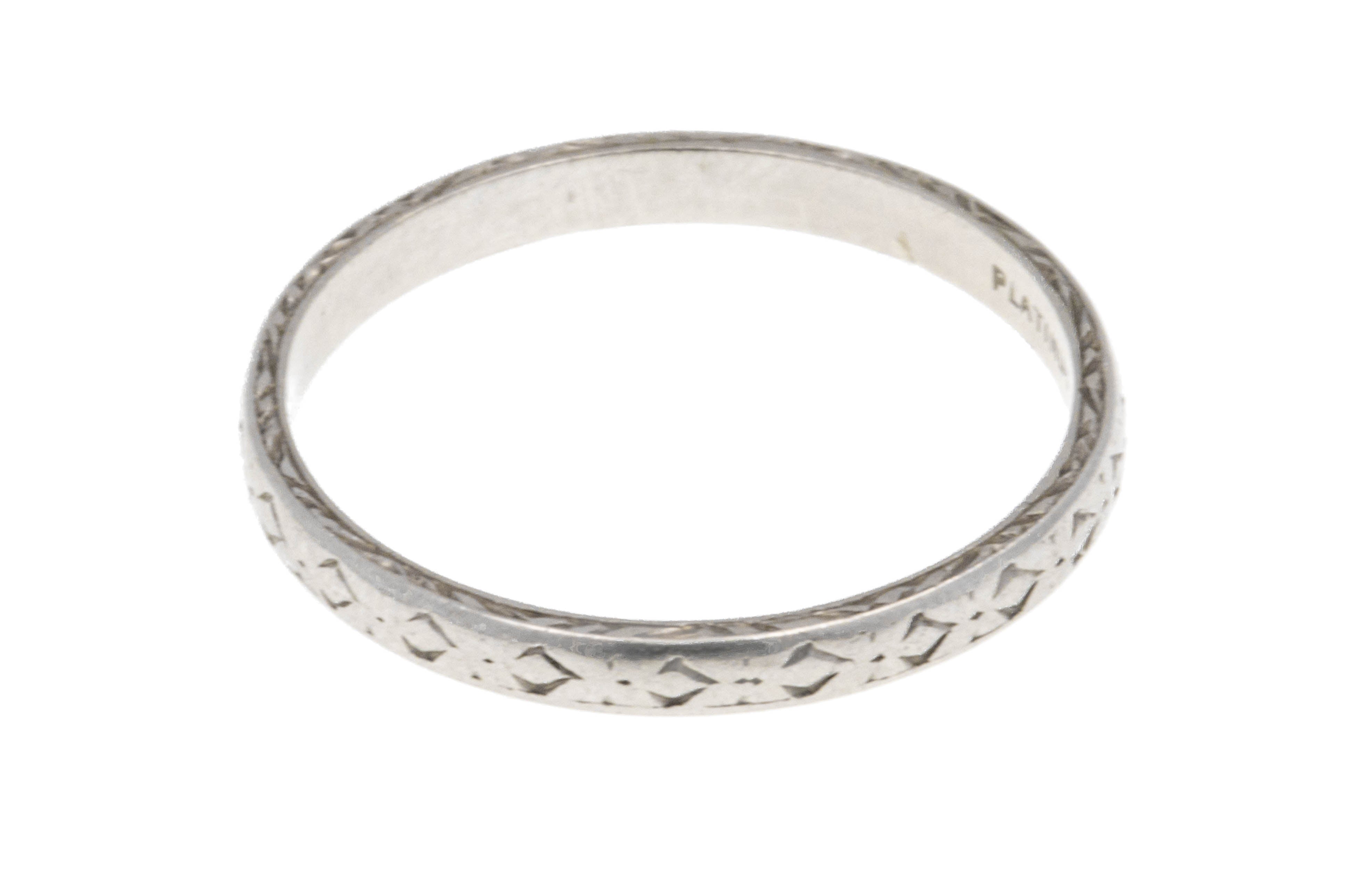 VERY GOOD. An Art Deco engraved Platinum wedding band in very good condition. Her ring band has retained its smooth round shape with her engravings covering the whole way round. Although the engravings are slightly worn in some areas, this is an indication of how loved she was in her previous life. A gorgeous design, we can't wait for her to become your new everyday pick!