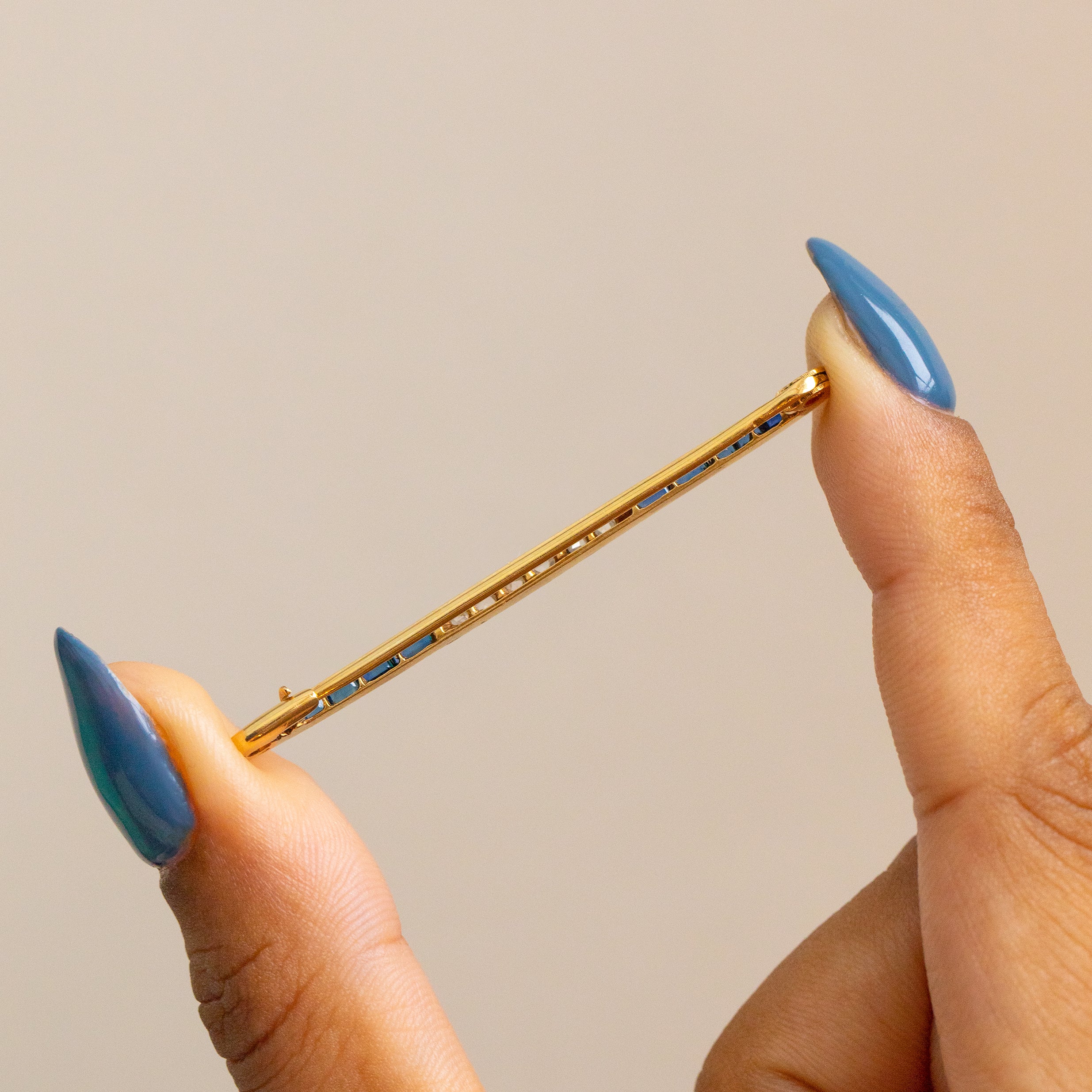 This sparkling Art Deco French 18ct Gold Sapphire Diamond bar brooch exudes elegance and sophistication! Gleaming Sapphires with a combined weight of 4.65ct, each meticulously set, punctuate the piece with vibrant blue hues, while the 0.18cts of rose-cut Diamonds add a touch of glamour and sparkle.
