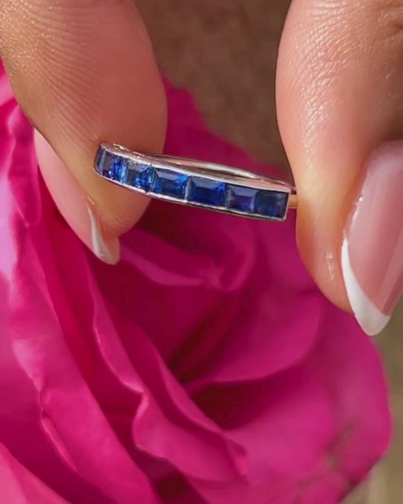 Indulge in this exquisite Art Deco French 18ct Gold Sapphire half eternity ring! Crafted with meticulous attention to detail, this timeless ring features a dazzling array of royal blue Sapphires, with a combined weight of 1.00ct, and simply exudes sophistication and elegance.