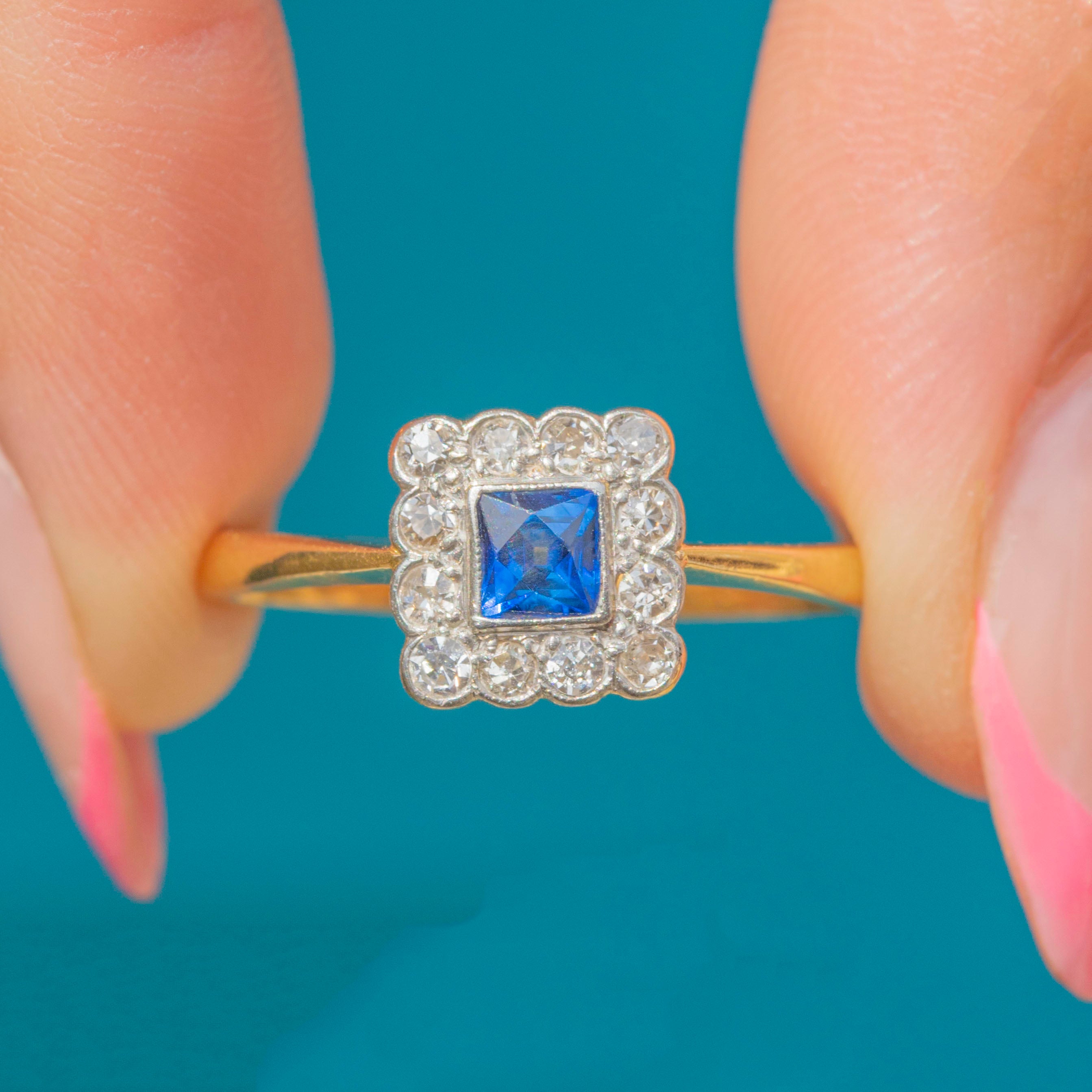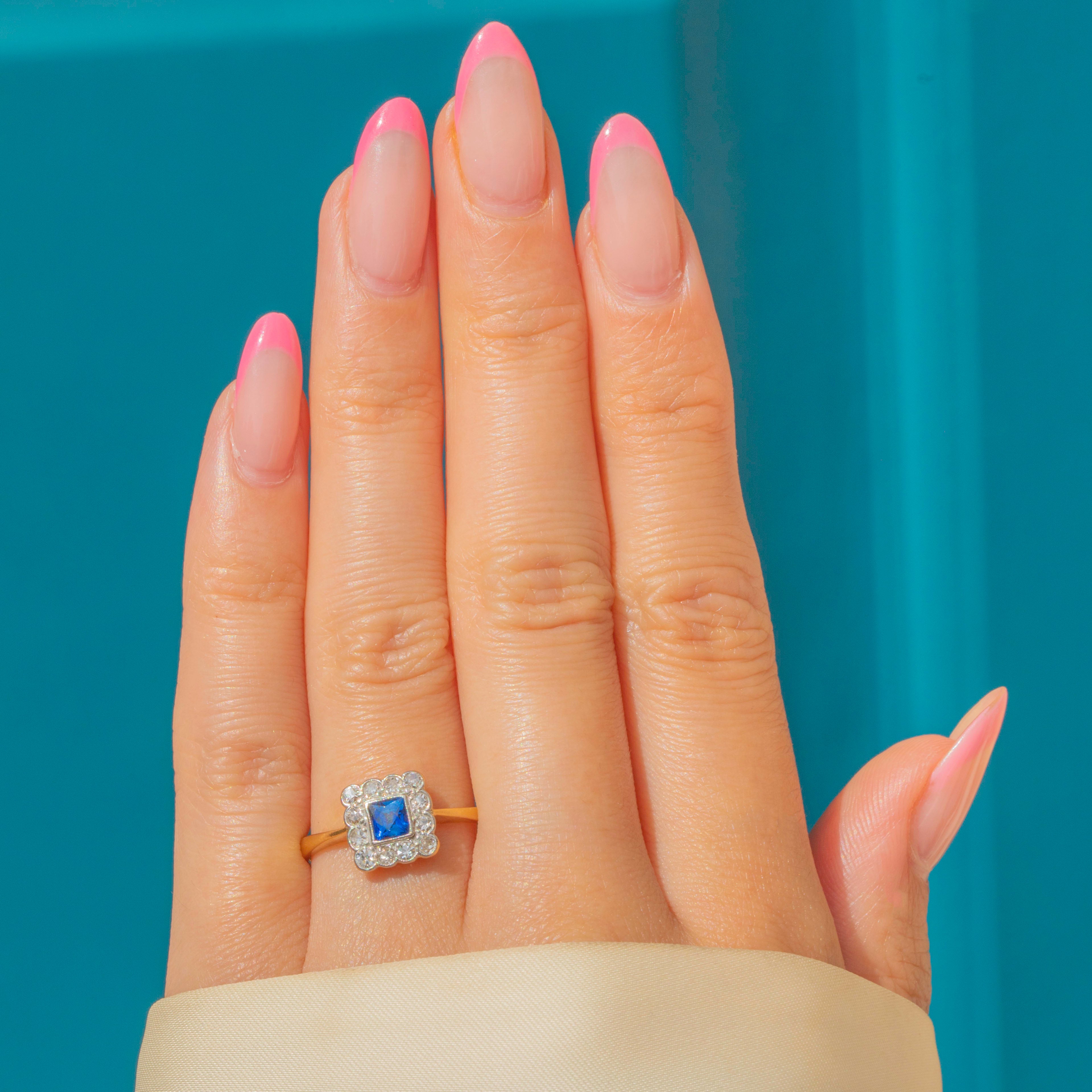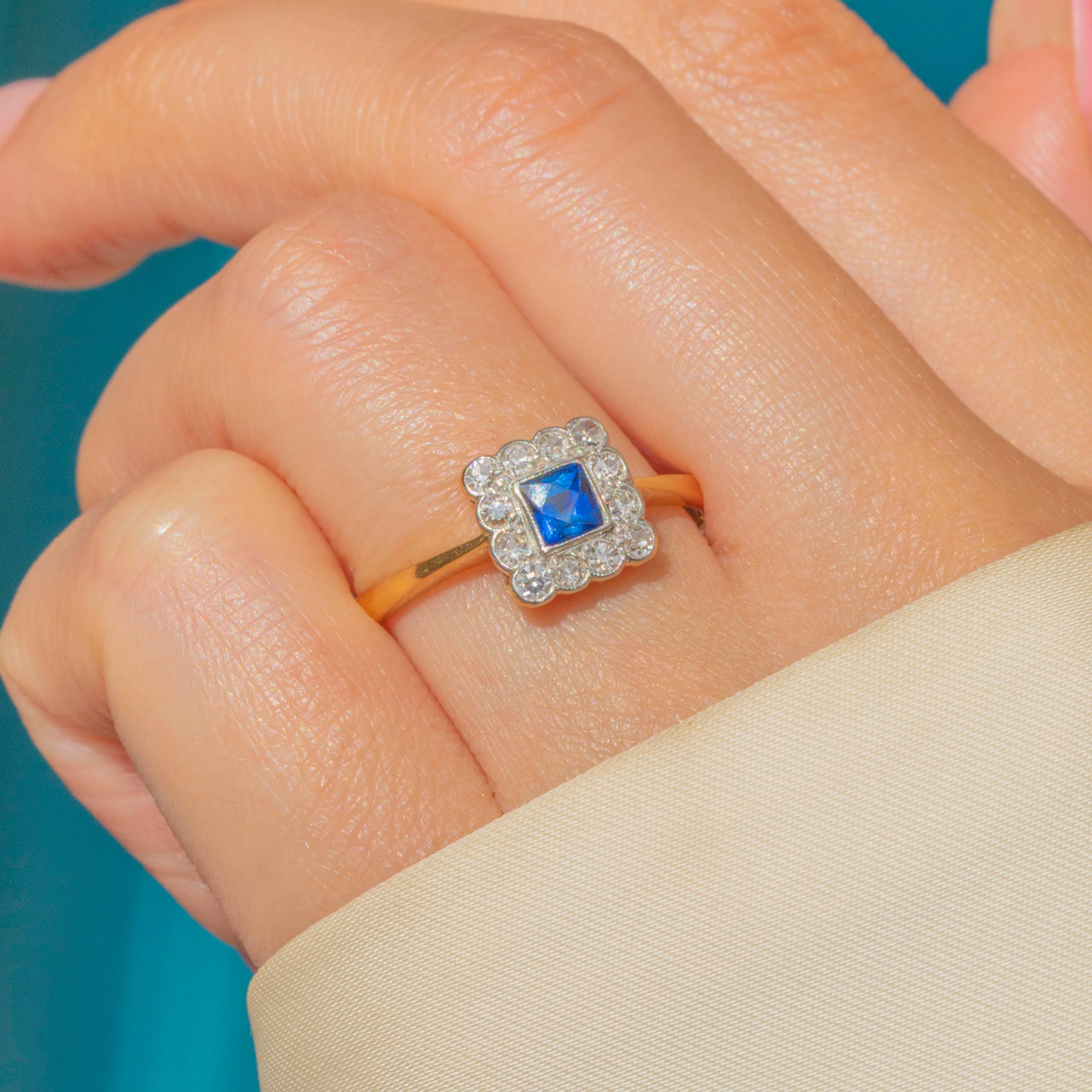 In her centre sits a gorgeous cerulean French-cut Sapphire, characterised by her cross-shaped facets. She is adorned by a cluster of scintillating Diamonds, beautifully arranged in a square formation in quintessential Art Deco style.