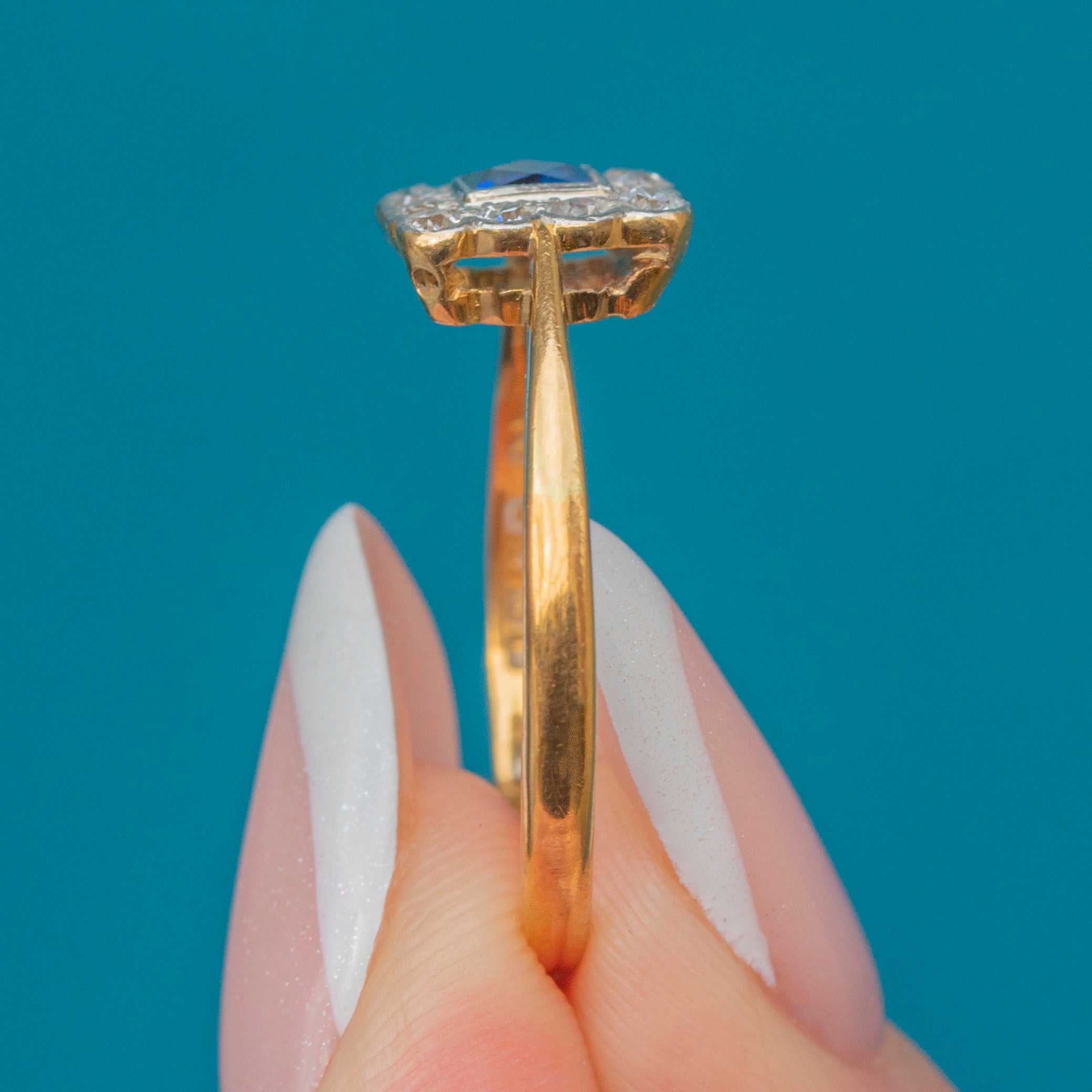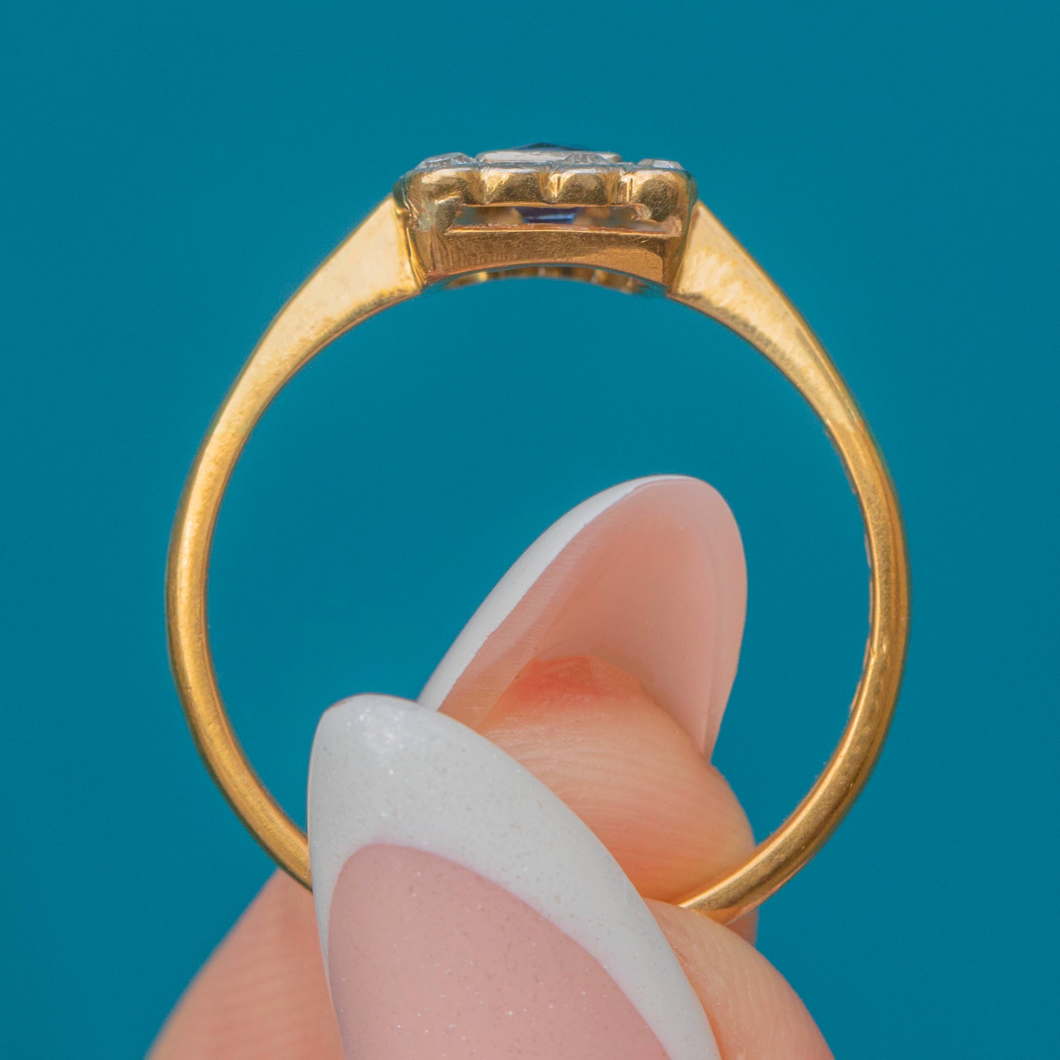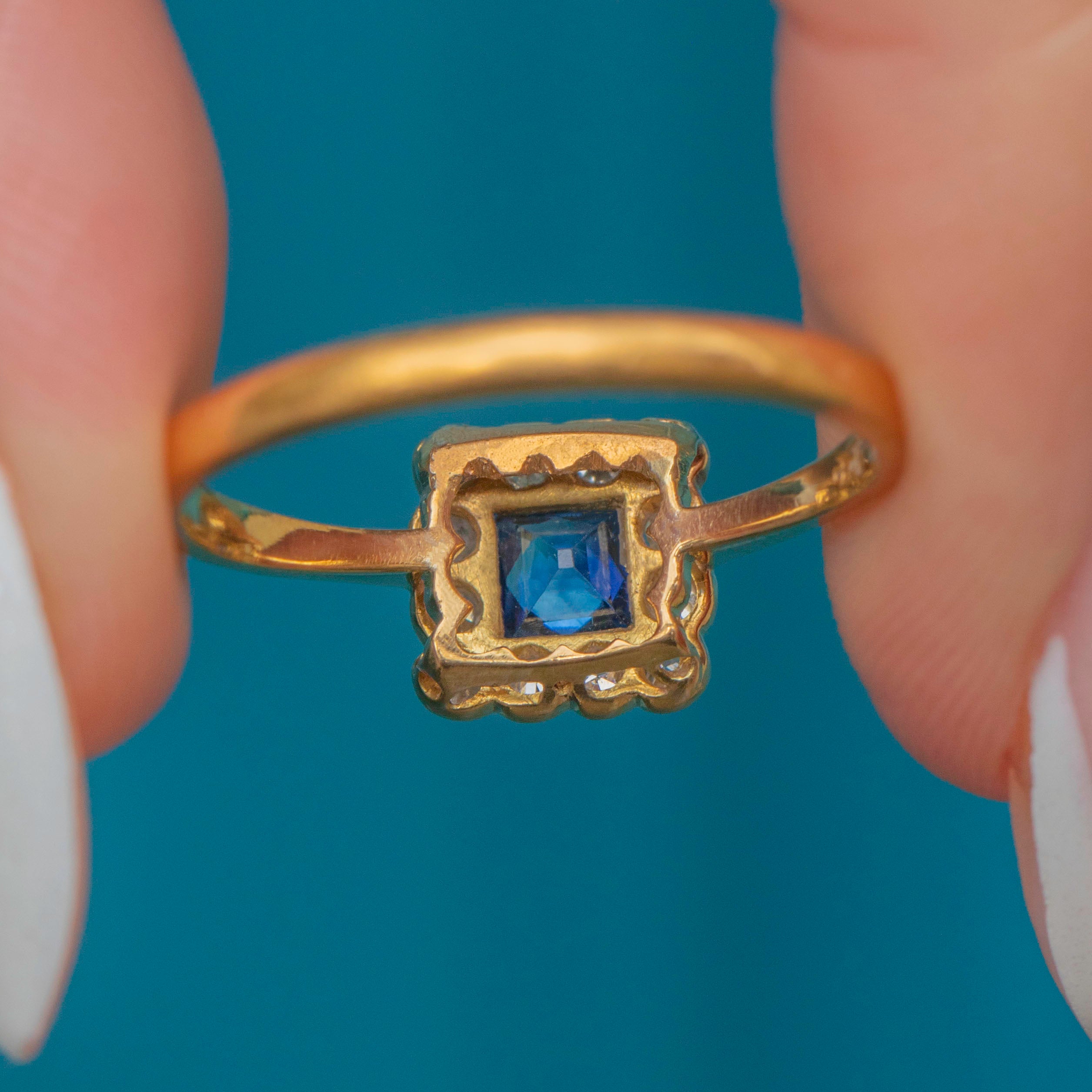 In her centre sits a gorgeous cerulean French-cut Sapphire, characterised by her cross-shaped facets. She is adorned by a cluster of scintillating Diamonds, beautifully arranged in a square formation in quintessential Art Deco style.