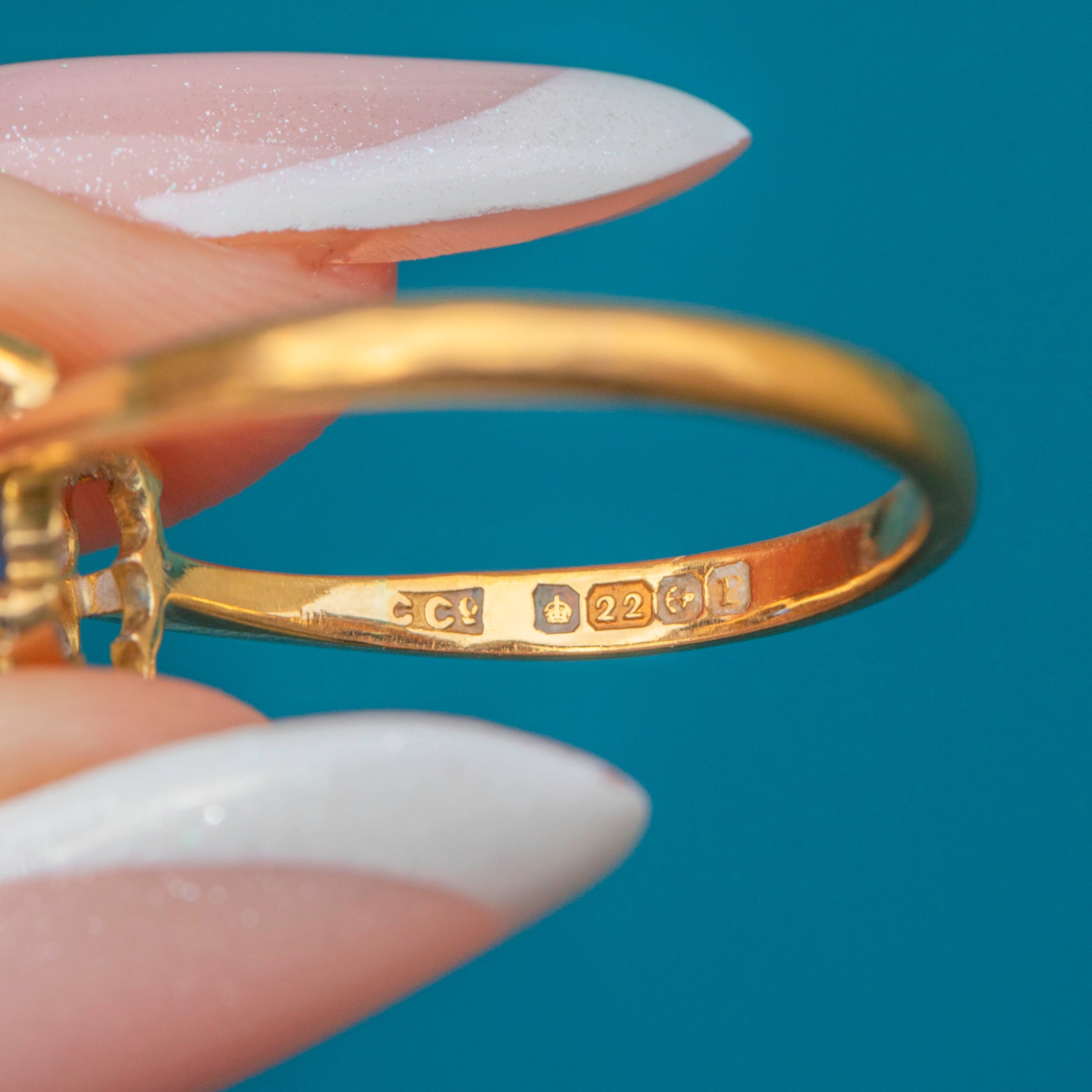 MATERIALS: Tests as 22ct Yellow Gold, 22ct White Gold settings, French cut Sapphire, Diamonds.