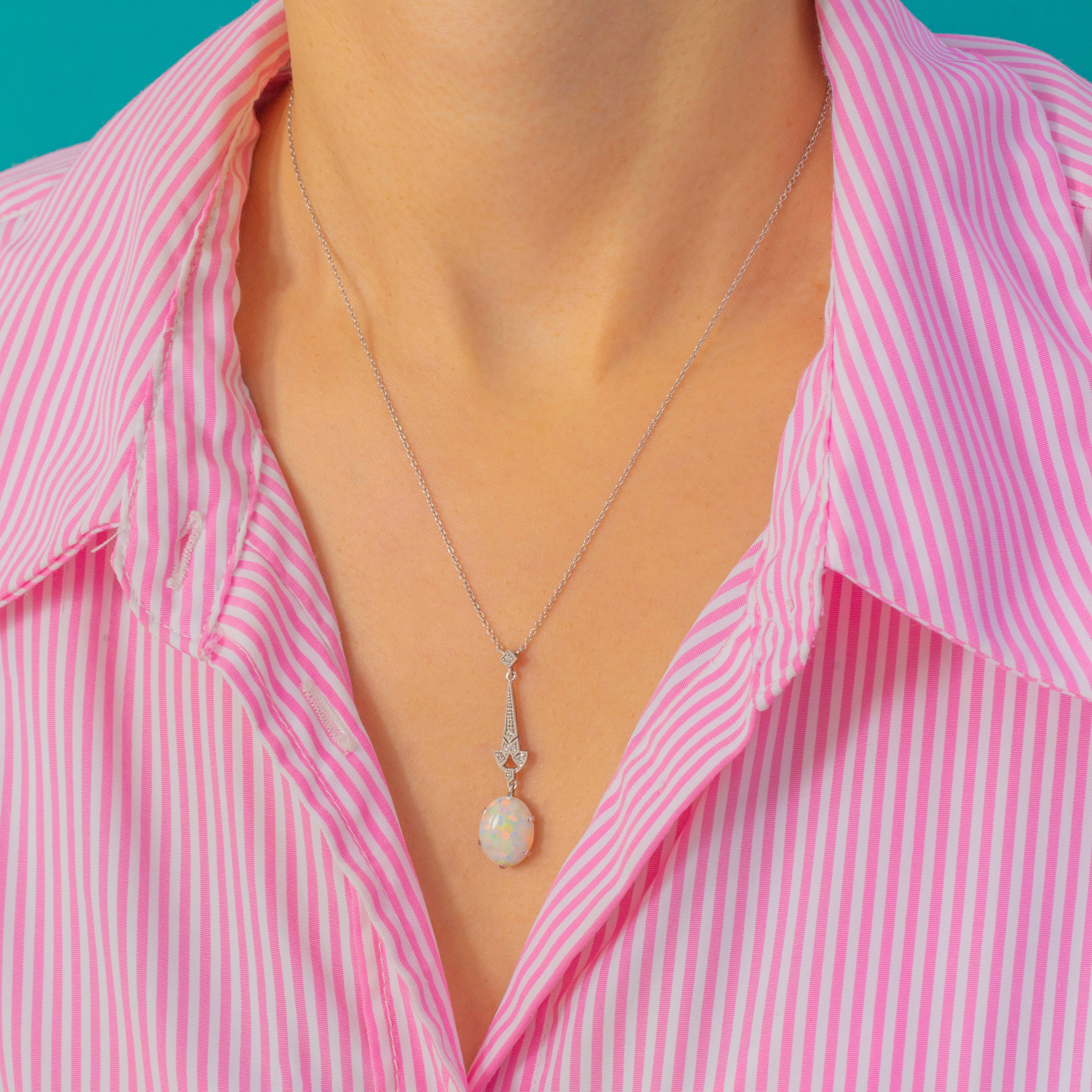 This stunning Art Deco Opal drop necklace is a perfect example of the elegance and refinement of the 1920s era. The shimmering Opal glows with soft pastel hues of blue, green and pink, beautifully complemented by sparkling antique Diamonds above.