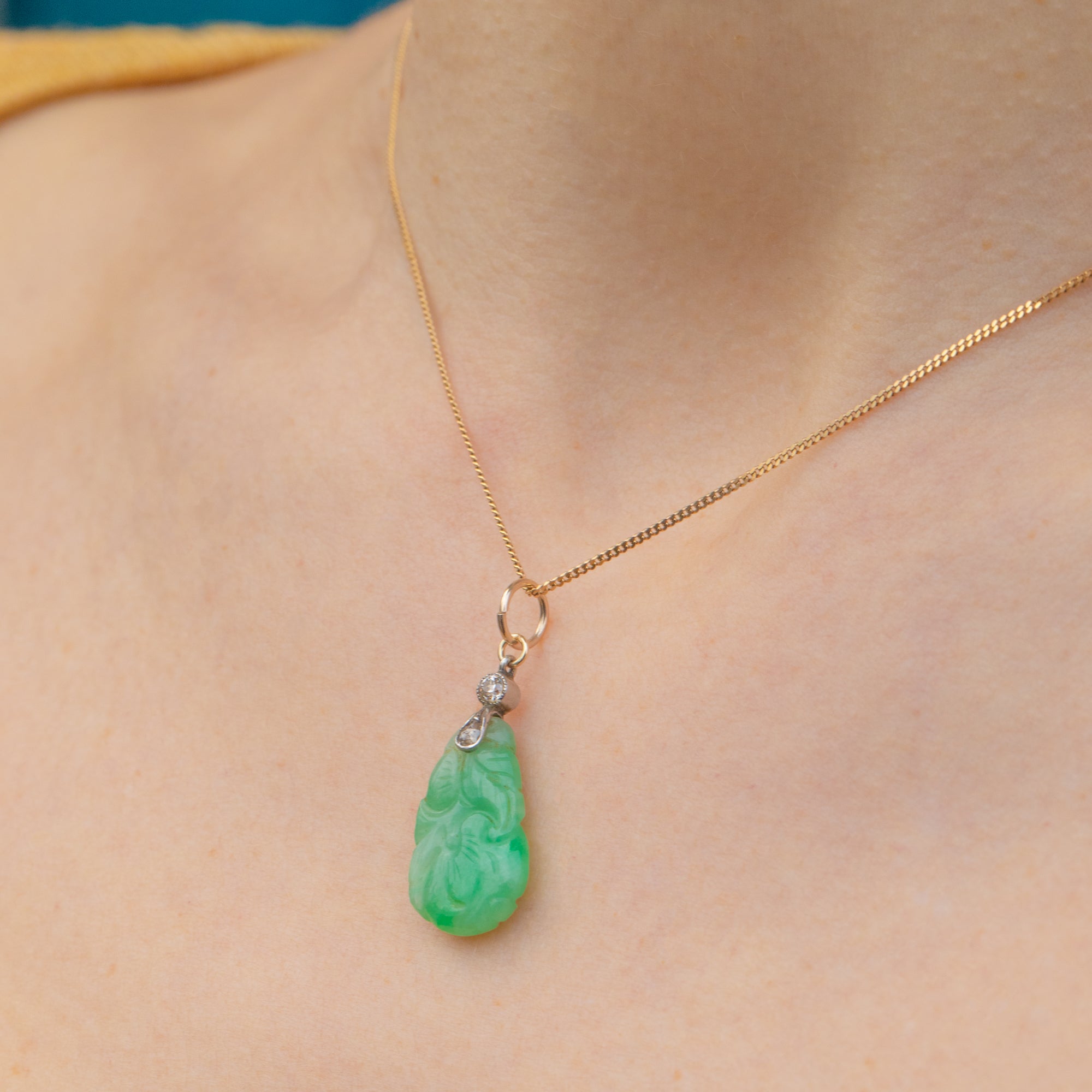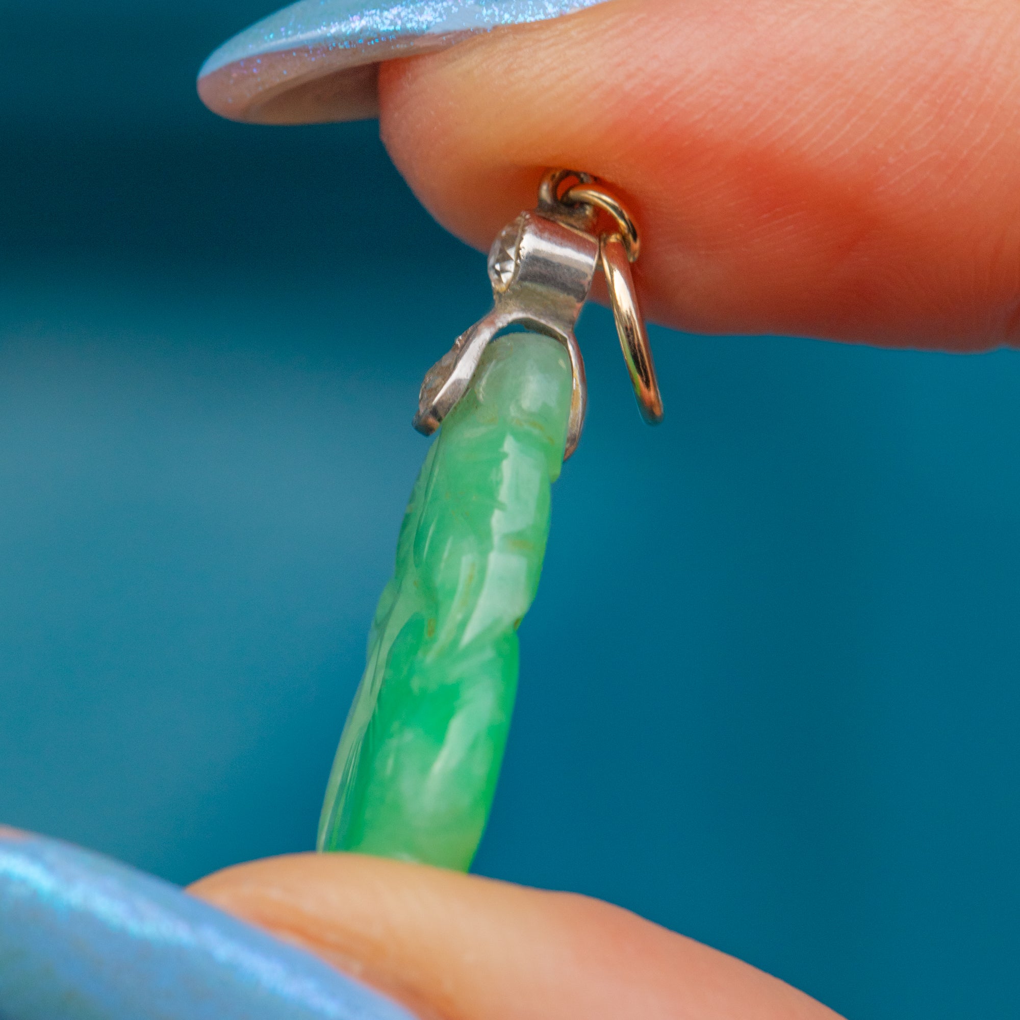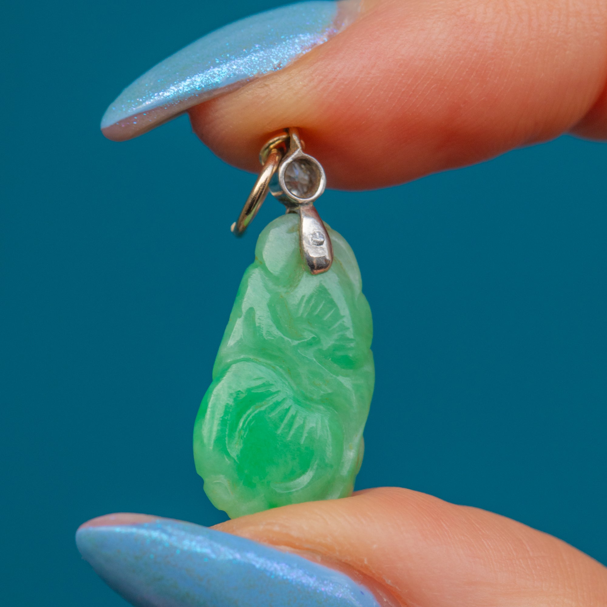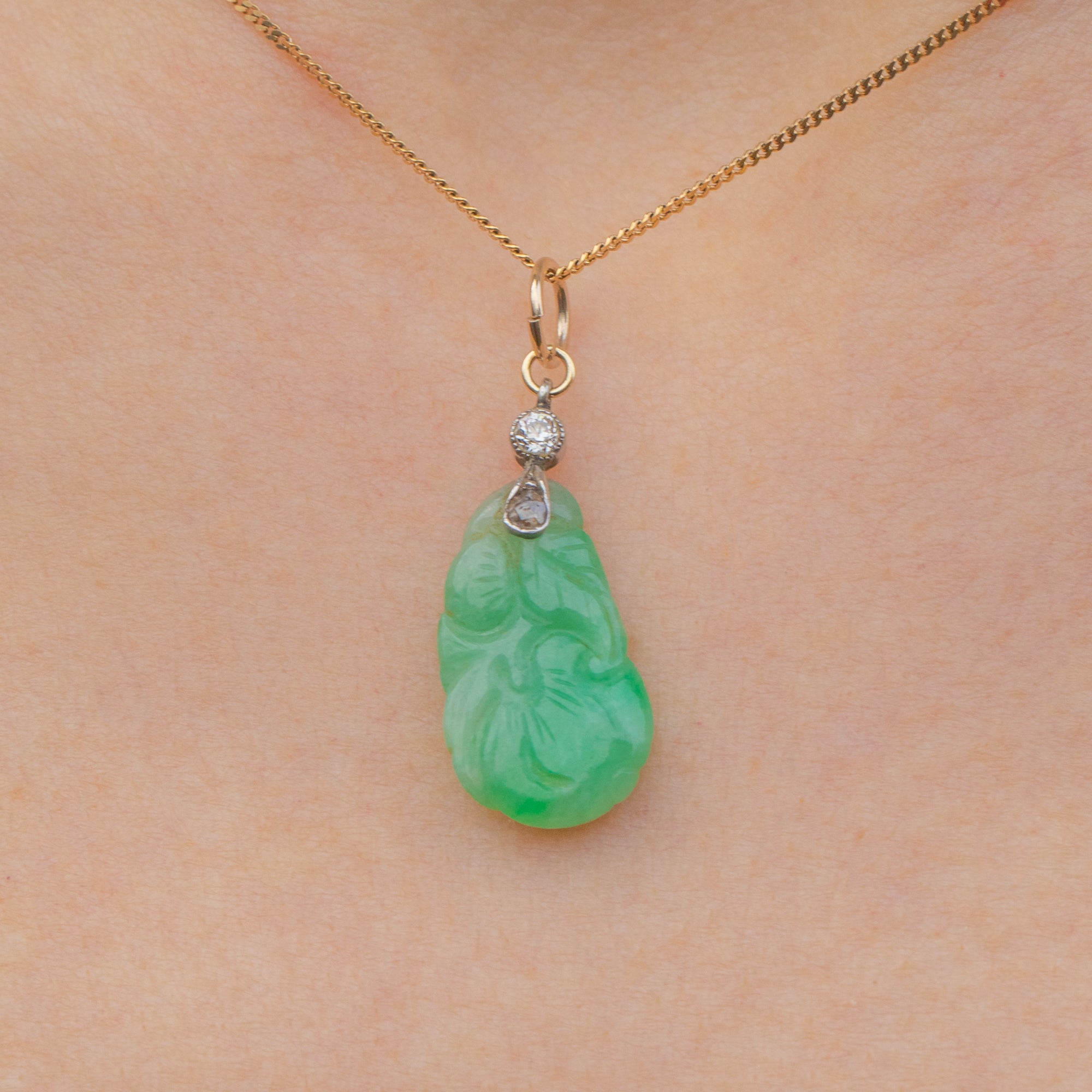 This exquisite piece is masterfully crafted, showcasing a captivating carved Jade centrepiece with intricate detailing and lush, verdant hues. The Jade is gracefully complemented by two shimmering Diamonds that shine delicately beneath the bale, set in a glowing Platinum, adding just the right touch of sparkle.
