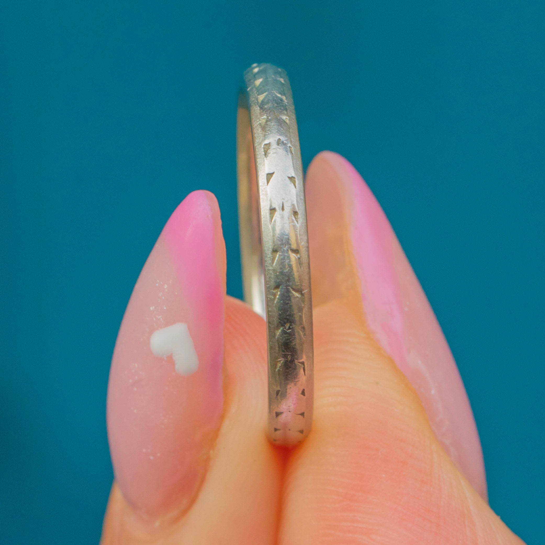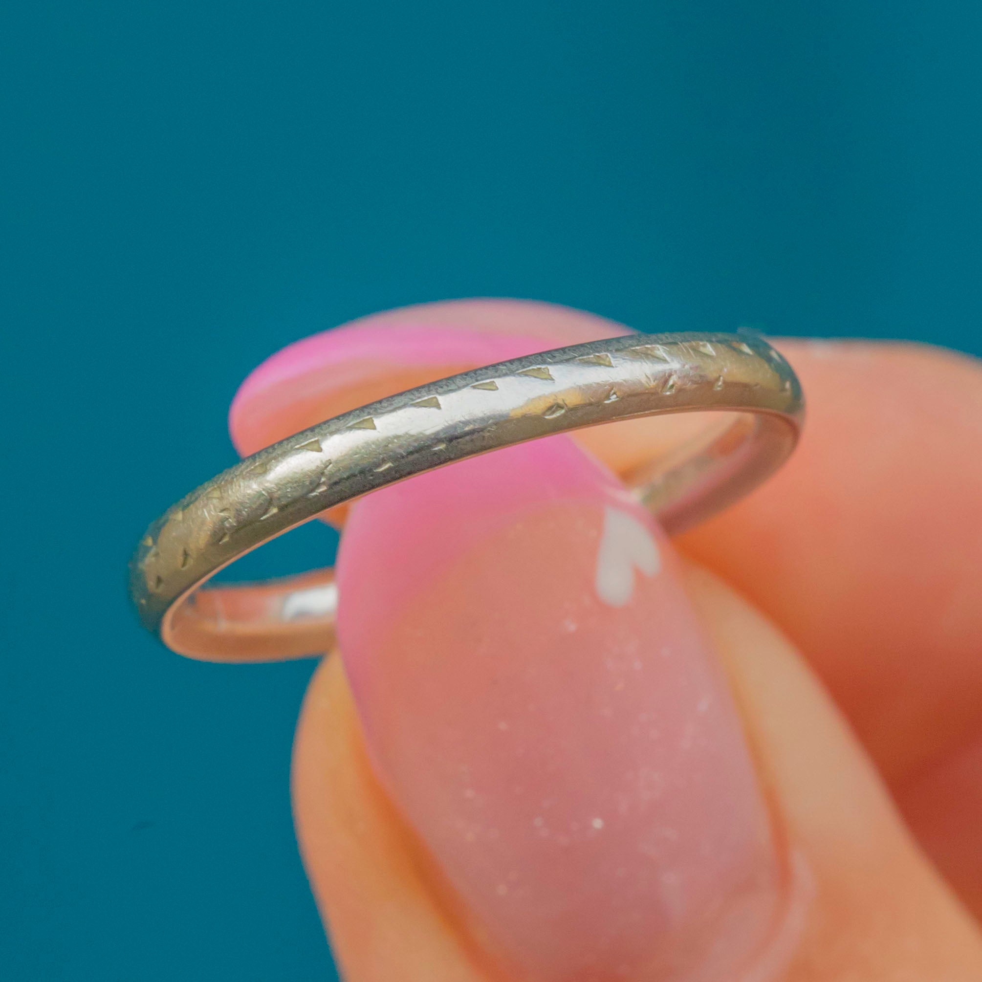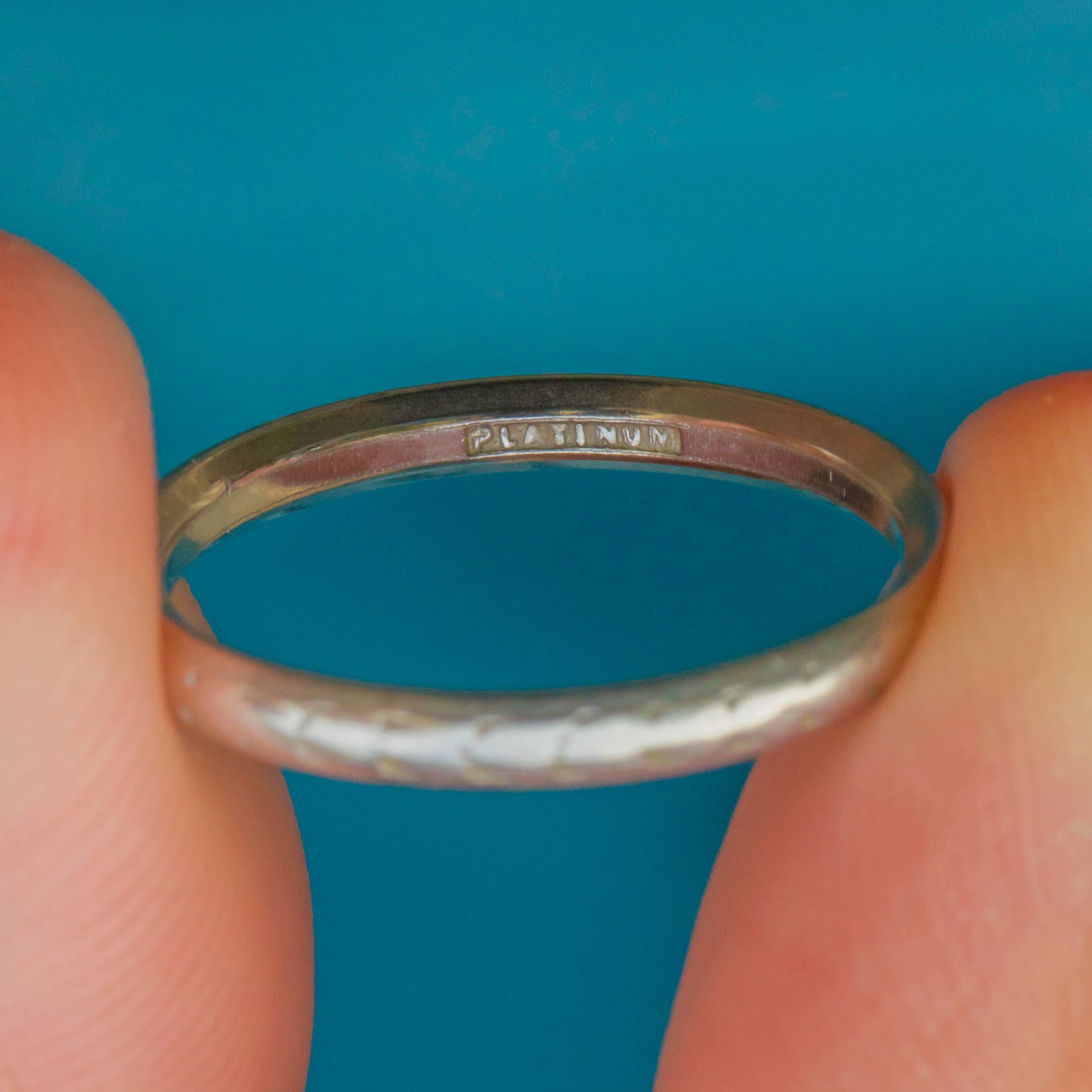 VERY GOOD: This divine Art Deco Platinum engraved wedding band is in very good condition! Although there is evidence of a previous resizing, the ring has kept its circular shape very well throughout the years, with no chips or dings to note. Her engravings have some subtle wear, but nothing we wouldn't expect of a piece of her age! Crafted out of sturdy Platinum, you can rest assured that she will last for a lifetime to come.