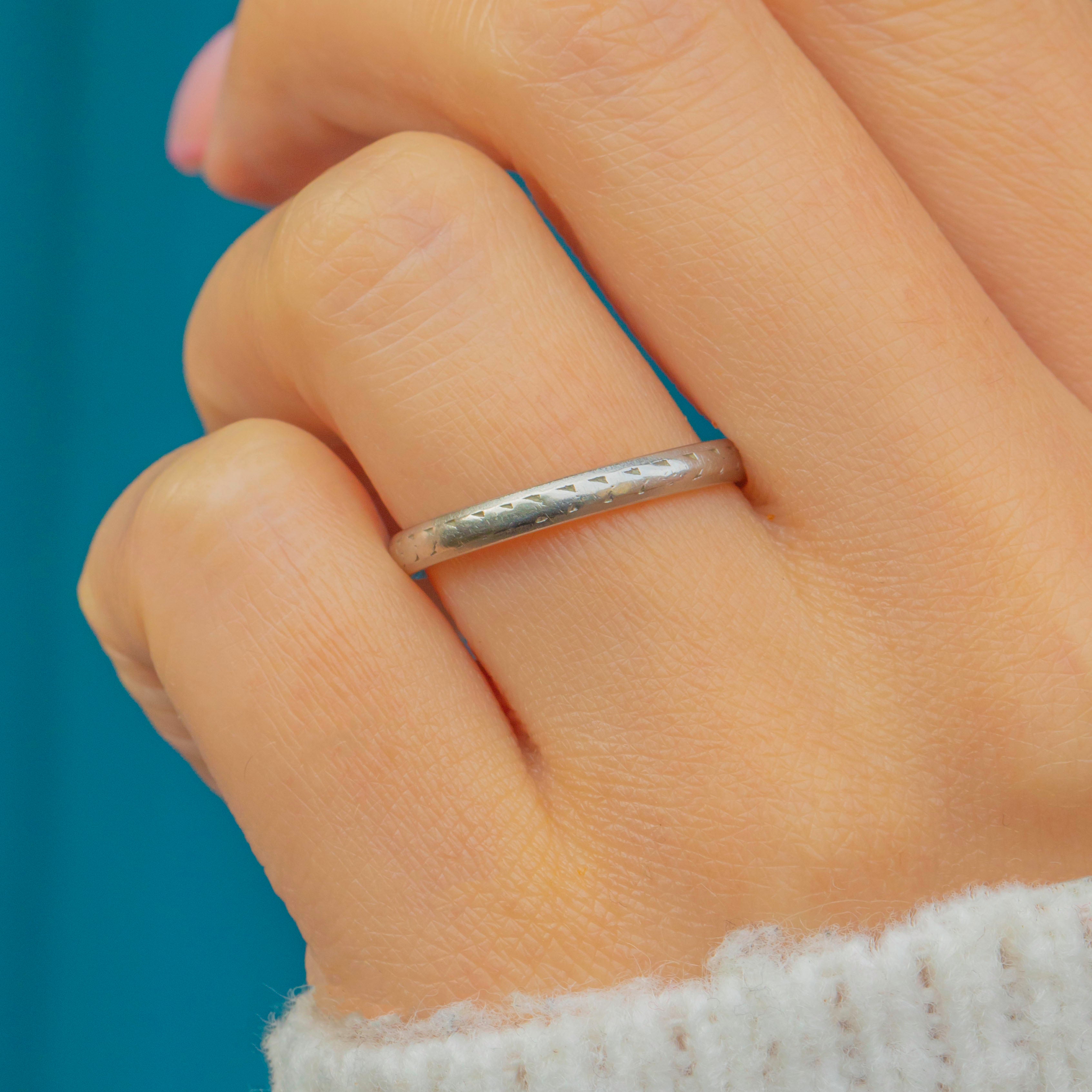 An exquisite wedding band, her bright Platinum boasts delicate geometric Art Deco engravings. Slender in design, she is the epitome of elegance.