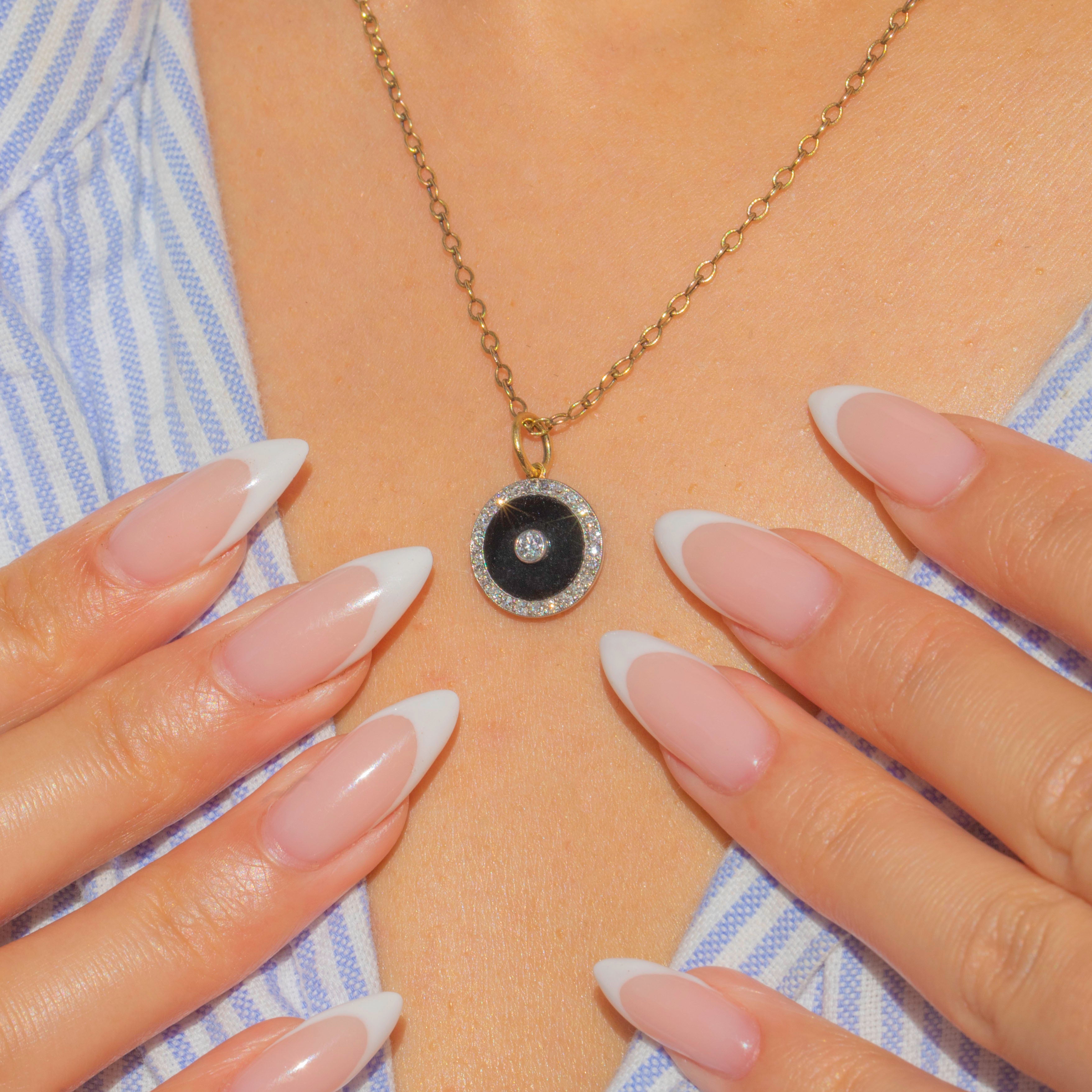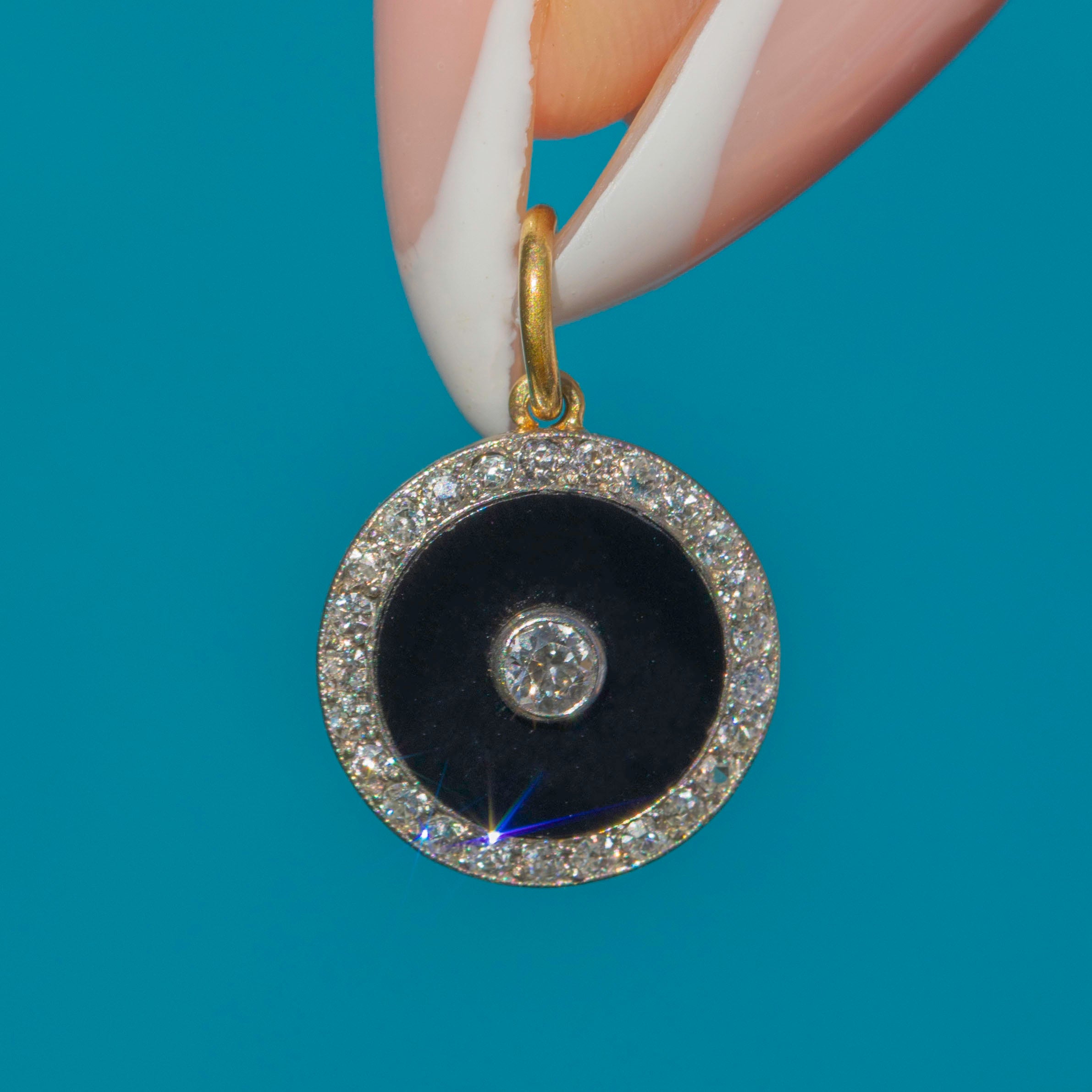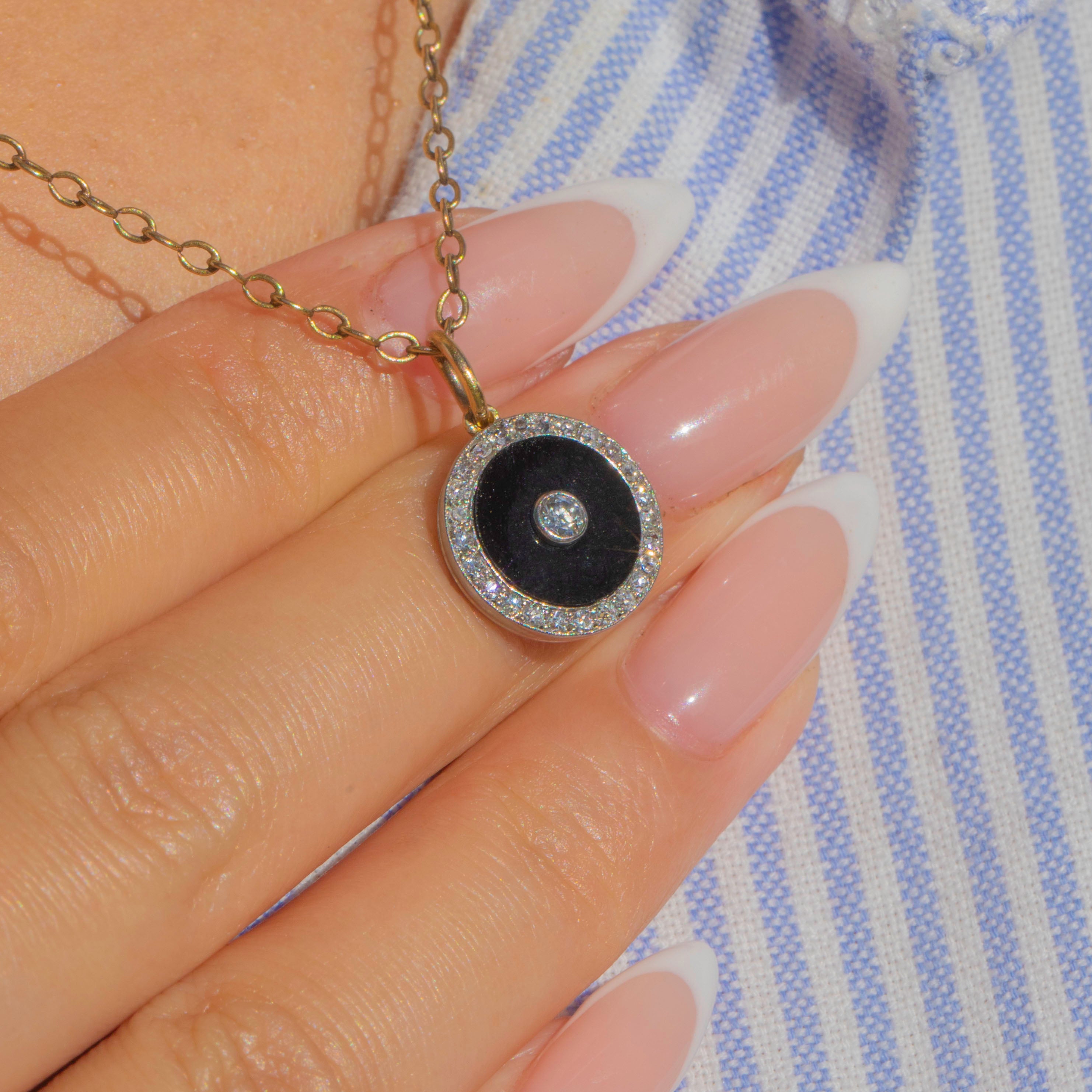 This striking Art Deco target pendant is crafted in Platinum with an 18ct Gold jump-ring, showcasing a dramatic Onyx disc at its centre. The bold black Onyx is set with a sparkling old European-cut Diamond, framed by a halo of glittering Diamonds for maximum contrast and brilliance.