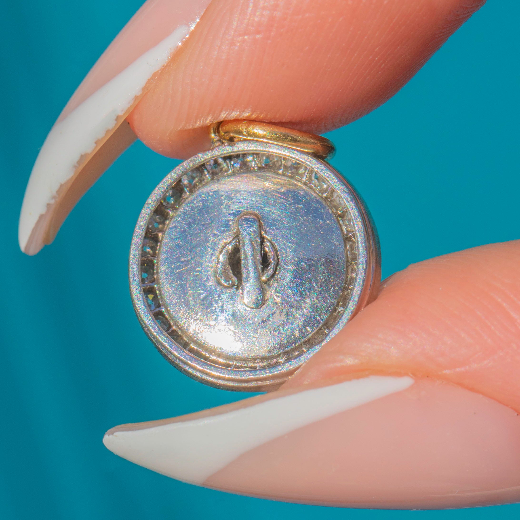 A classic Art Deco jewel, the crisp geometry and monochrome palette epitomise the era’s love of strong design and luxury materials. A perfect pendant for both collectors and lovers of timeless vintage style.