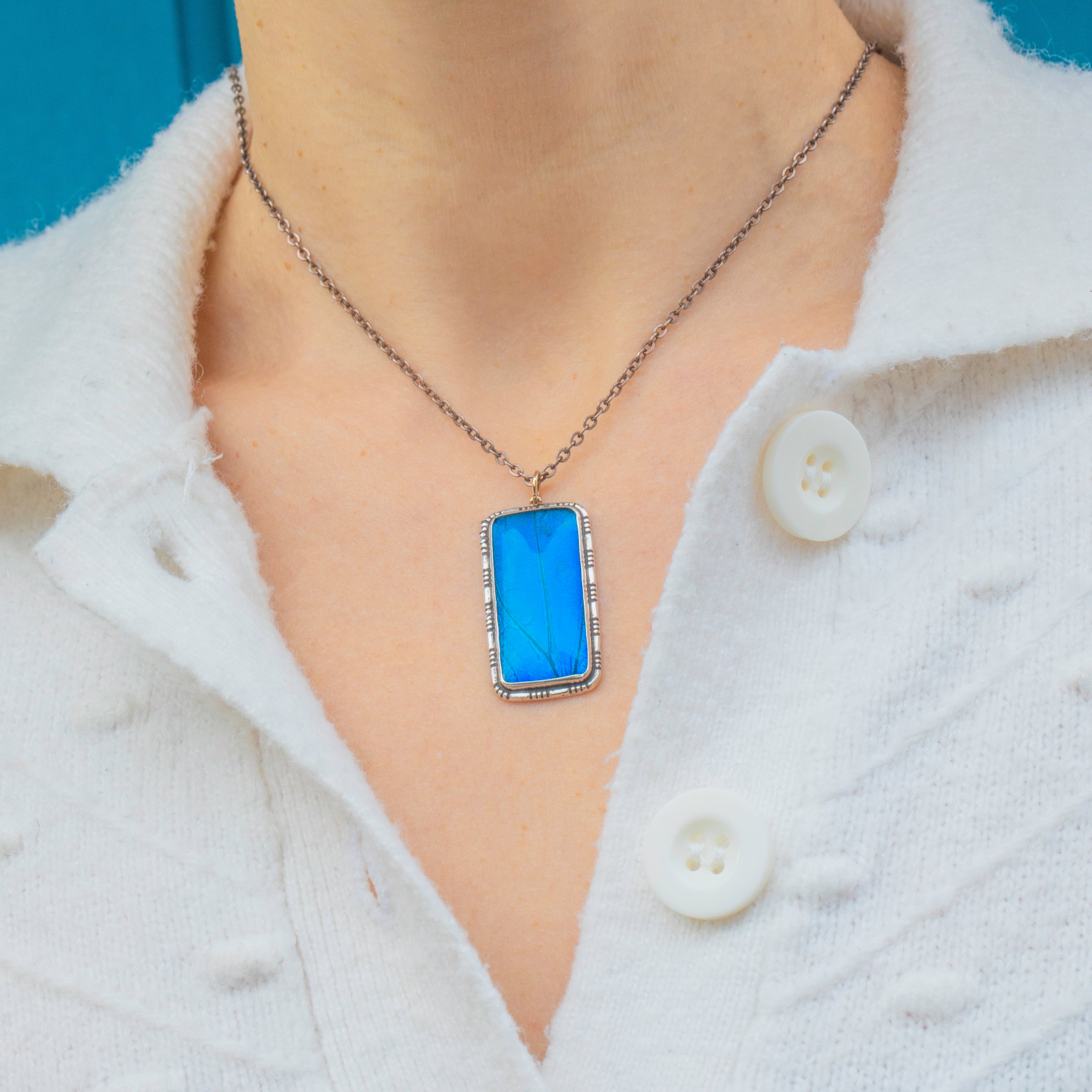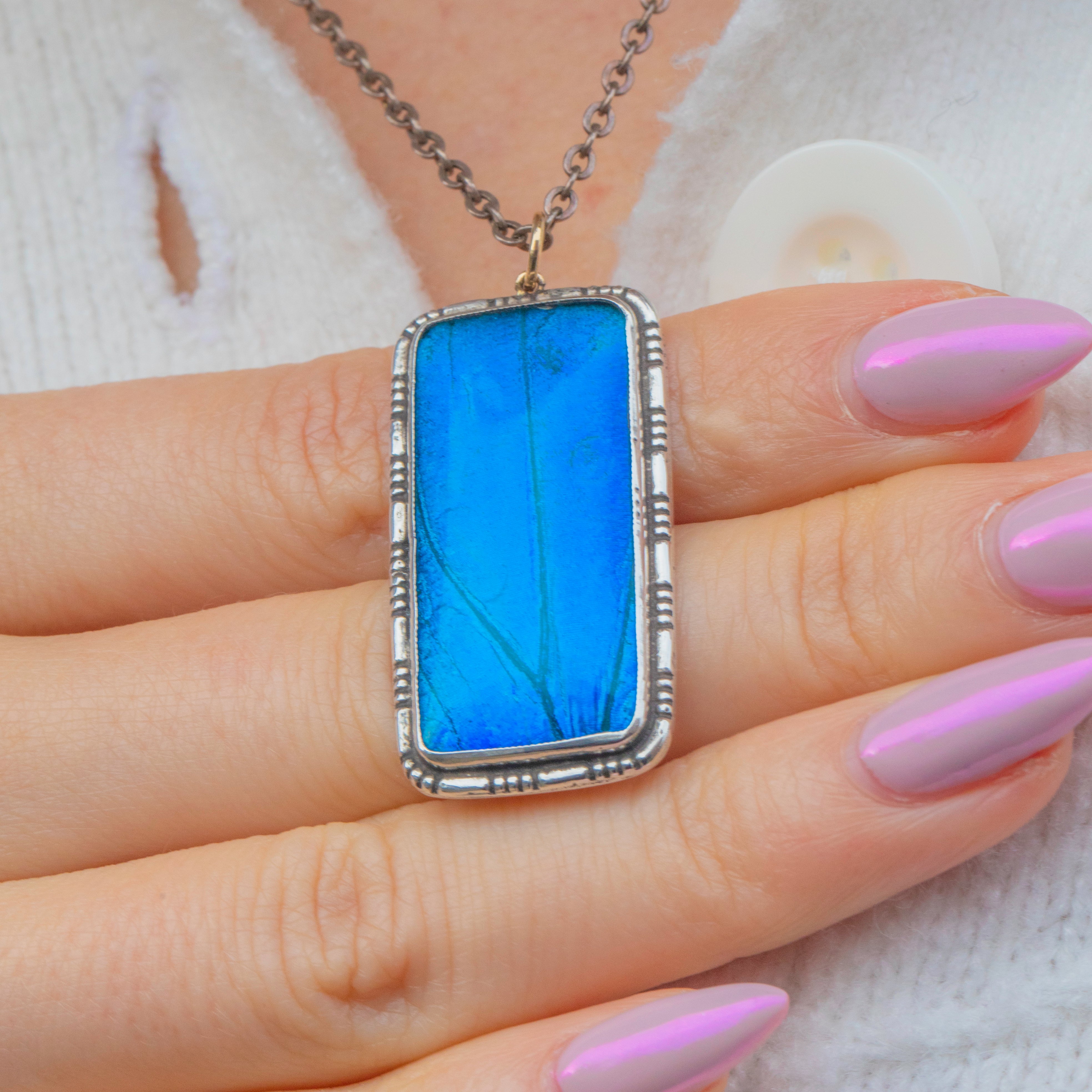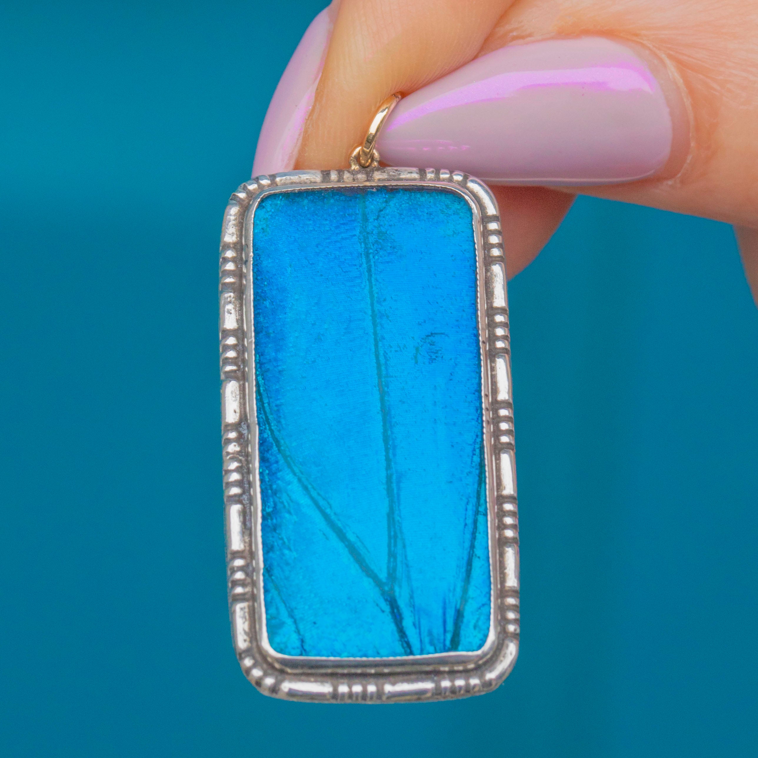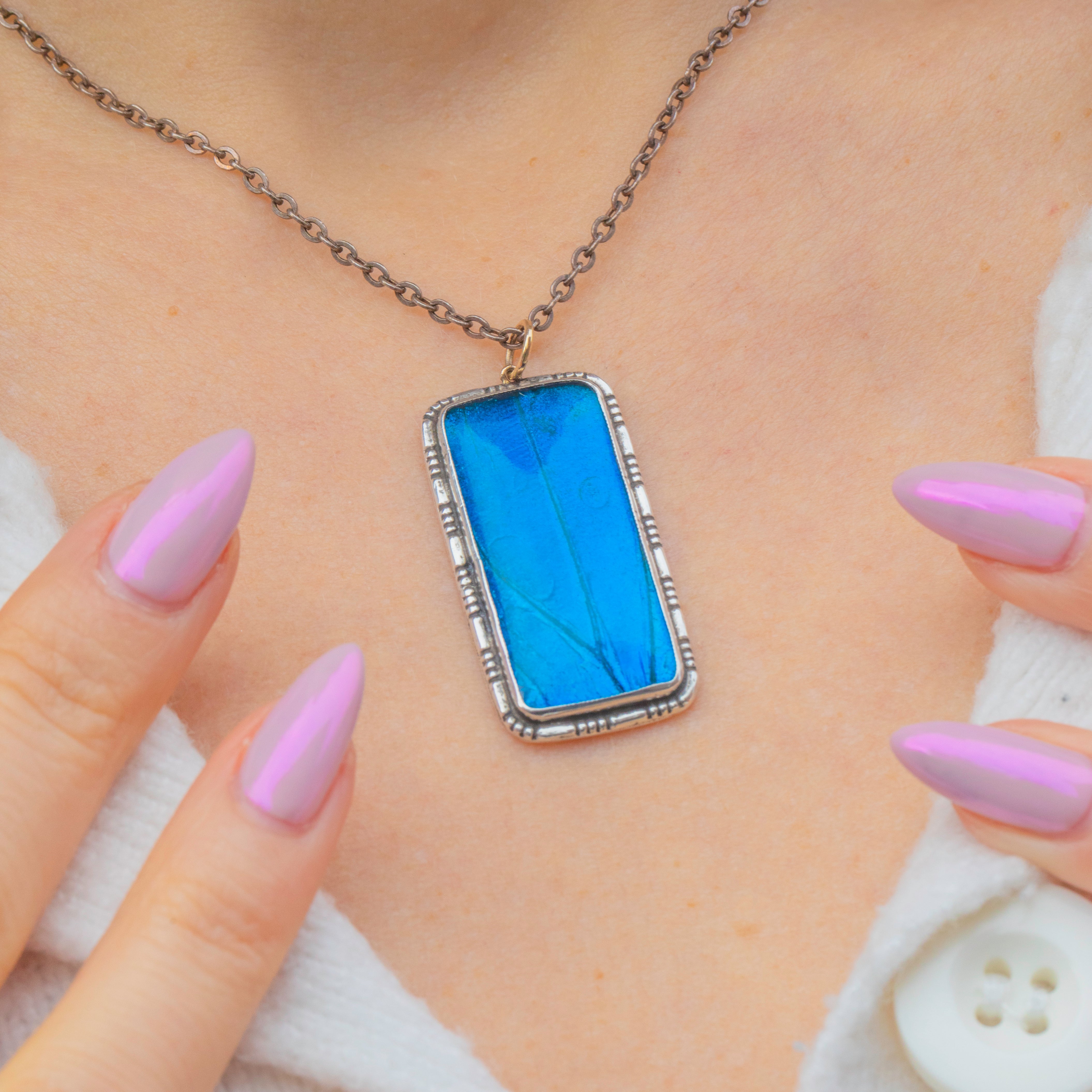 A striking Art Deco rectangular pendant crafted in Sterling Silver, featuring a vivid Morpho butterfly wing. The natural iridescence of the wing shimmers from deep ocean blue to teal, creating a mesmerising play of colour that was highly sought after in 1920s jewellery.