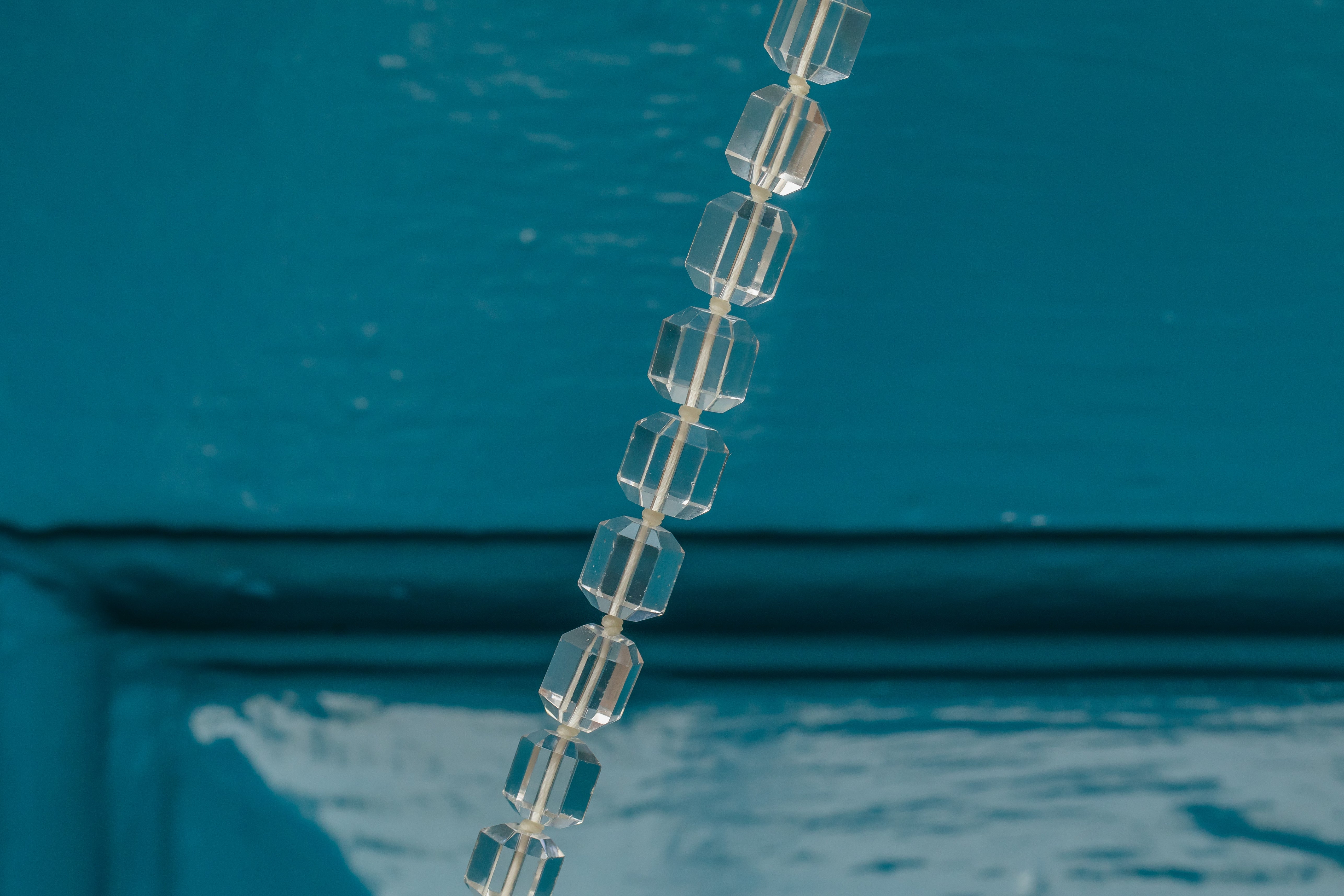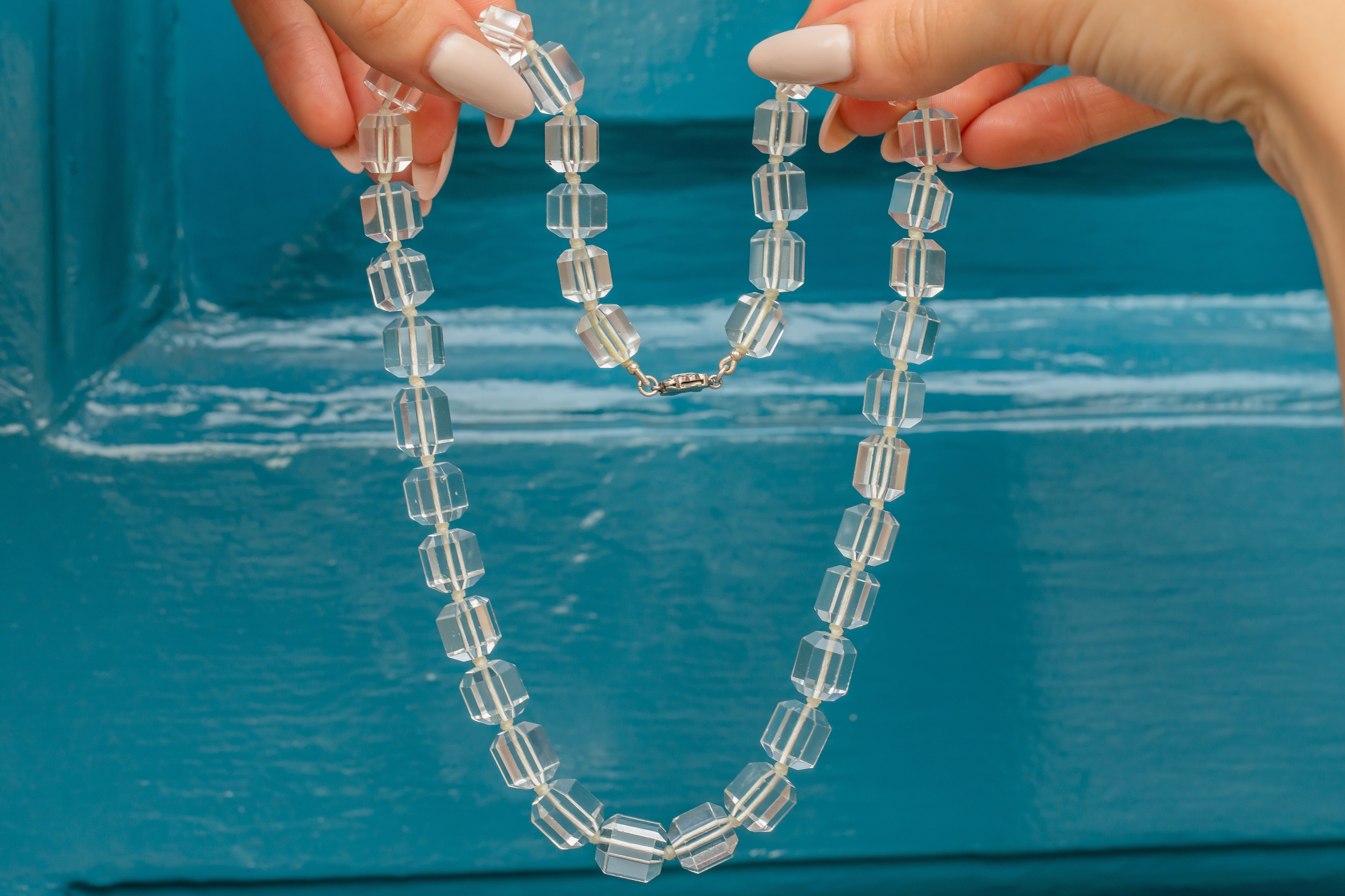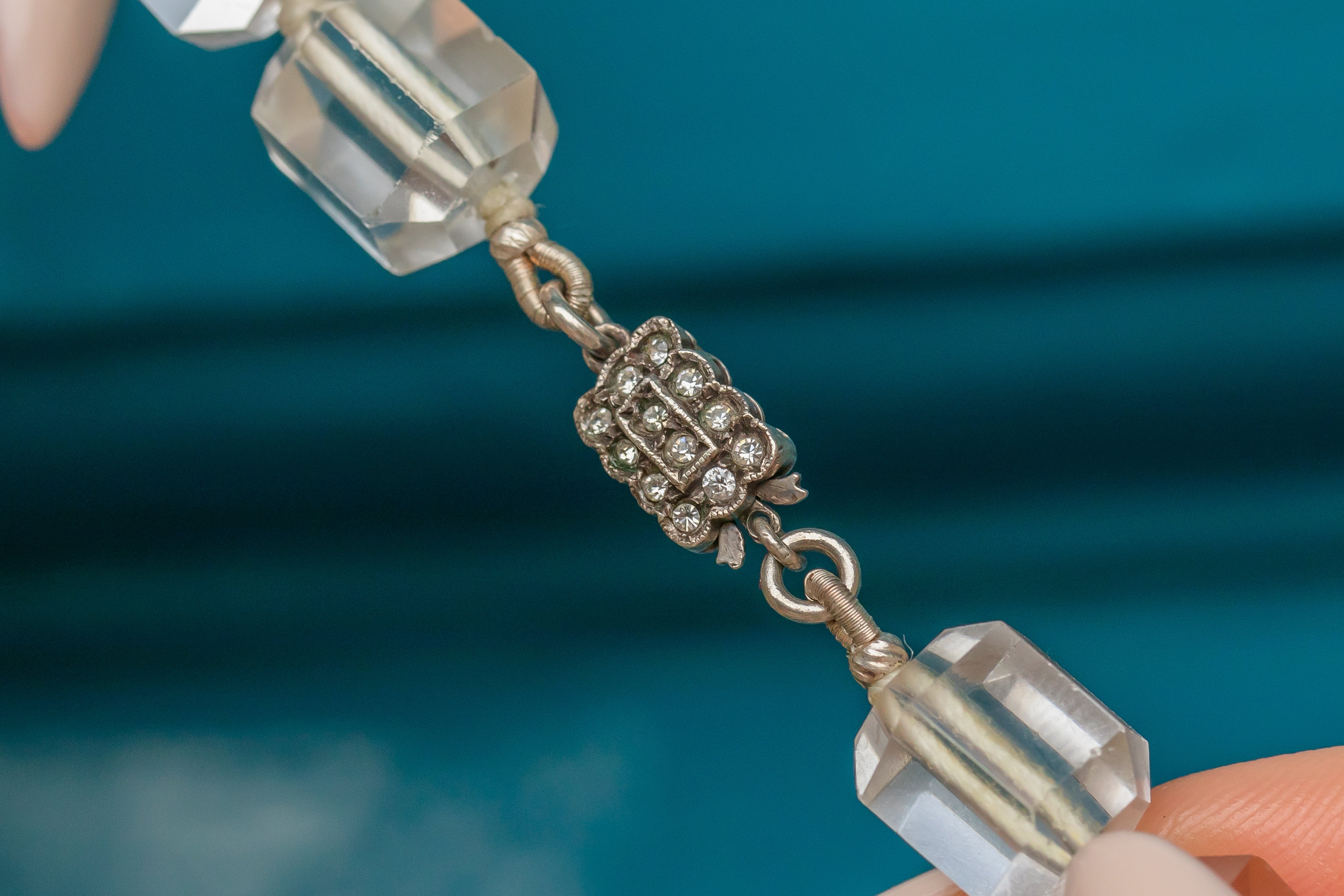 VERY GOOD. This Art Deco Rock Crystal beaded necklace is in very good condition. All of the beads are firmly connected and well-strung, with the Sterling Silver clasp also in fine working order! A few of the Rock Crystal beads have some minor abrasions after being worn and adored over many years but nothing significant. The Rock Crystals have been strung with thought and care, with a little knot between each of the stones for secure wear. This Art Deco item has lasted impeccably well through time and she remains a stunning and impactful piece!