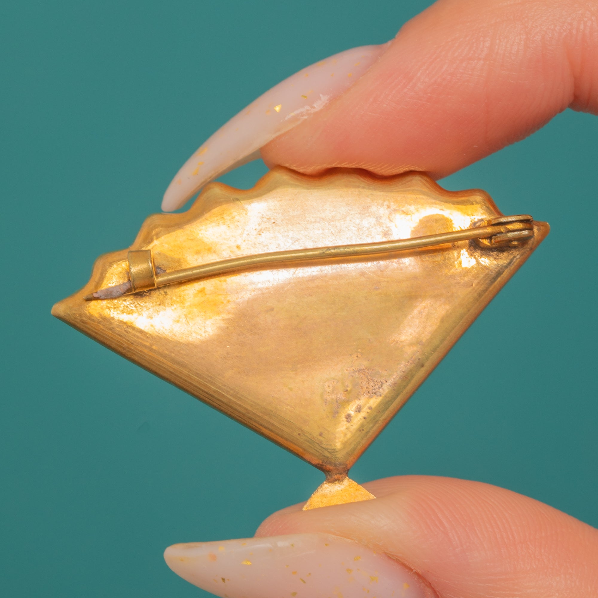 Crafted as a flat plaque with radiating fan pleats, the brooch is fitted with a tube hinge, long pin and simple hooked catch to the reverse. Elegant, graphic and evocative of Japanese art, it’s a wearable slice of Art Deco charm.