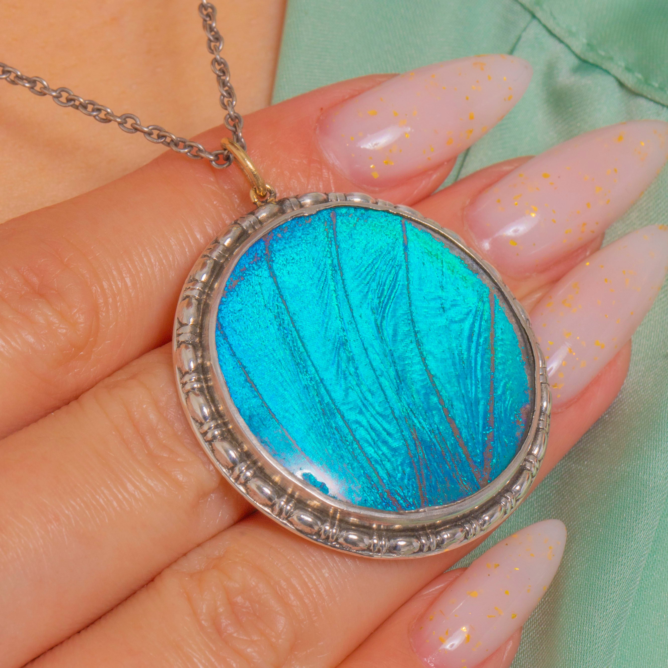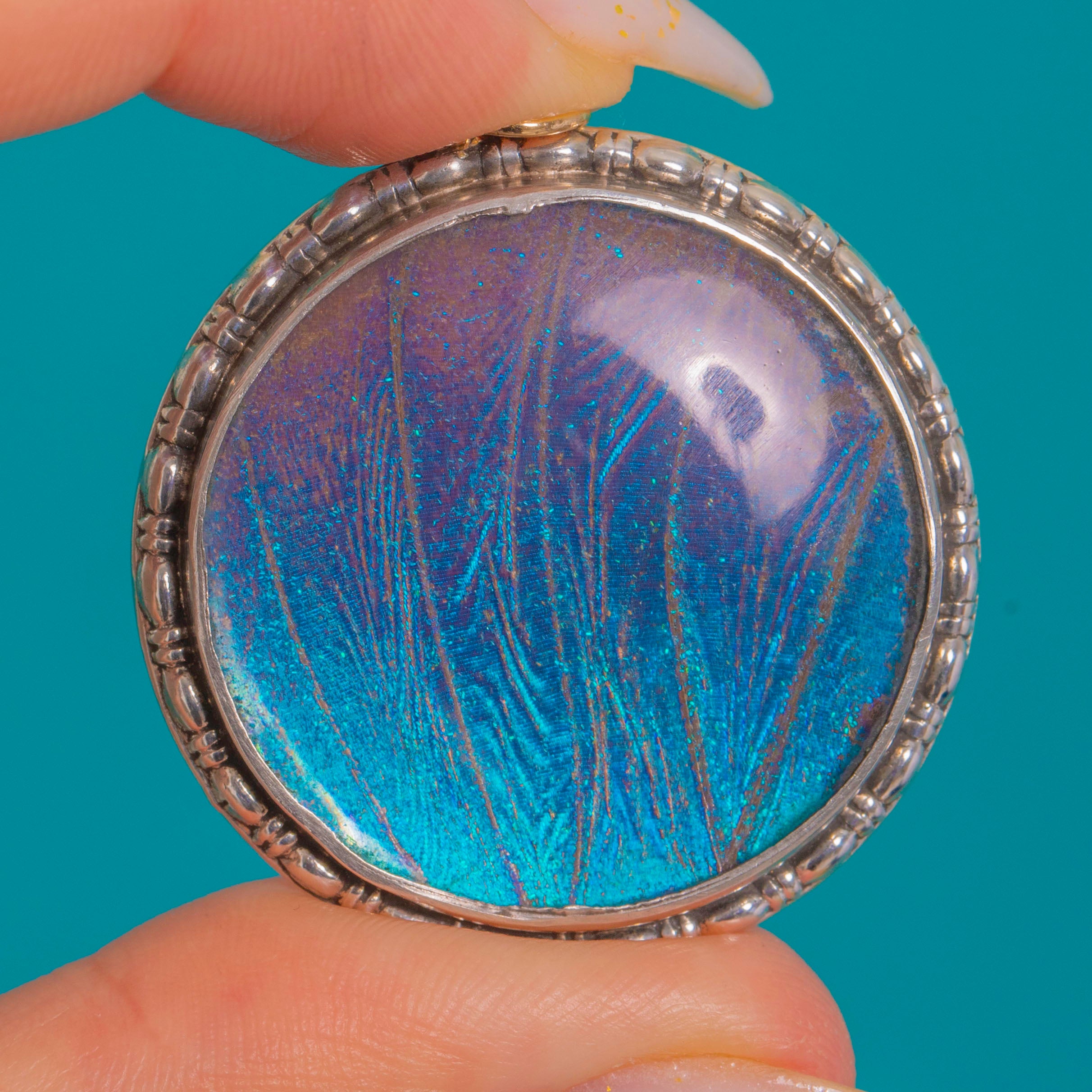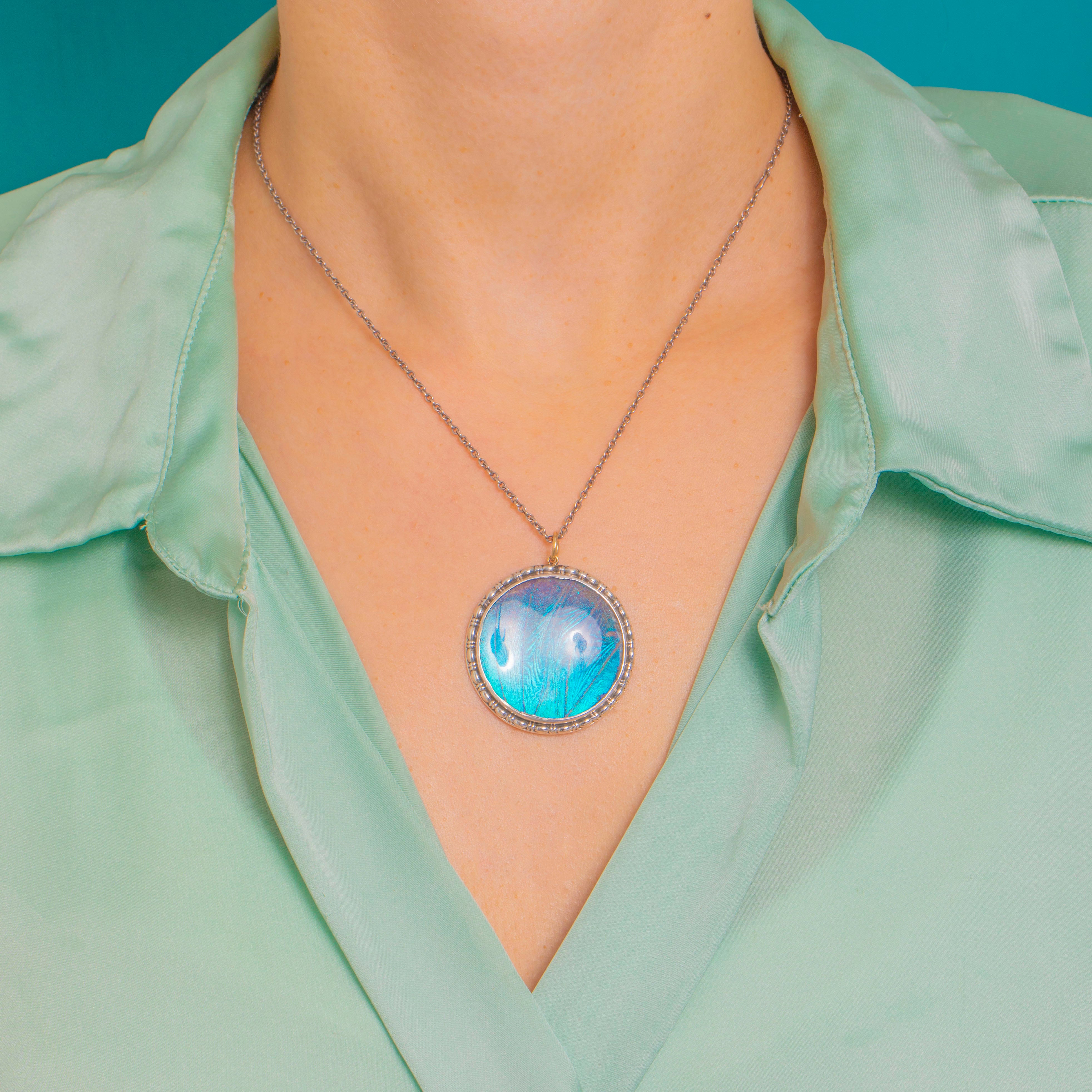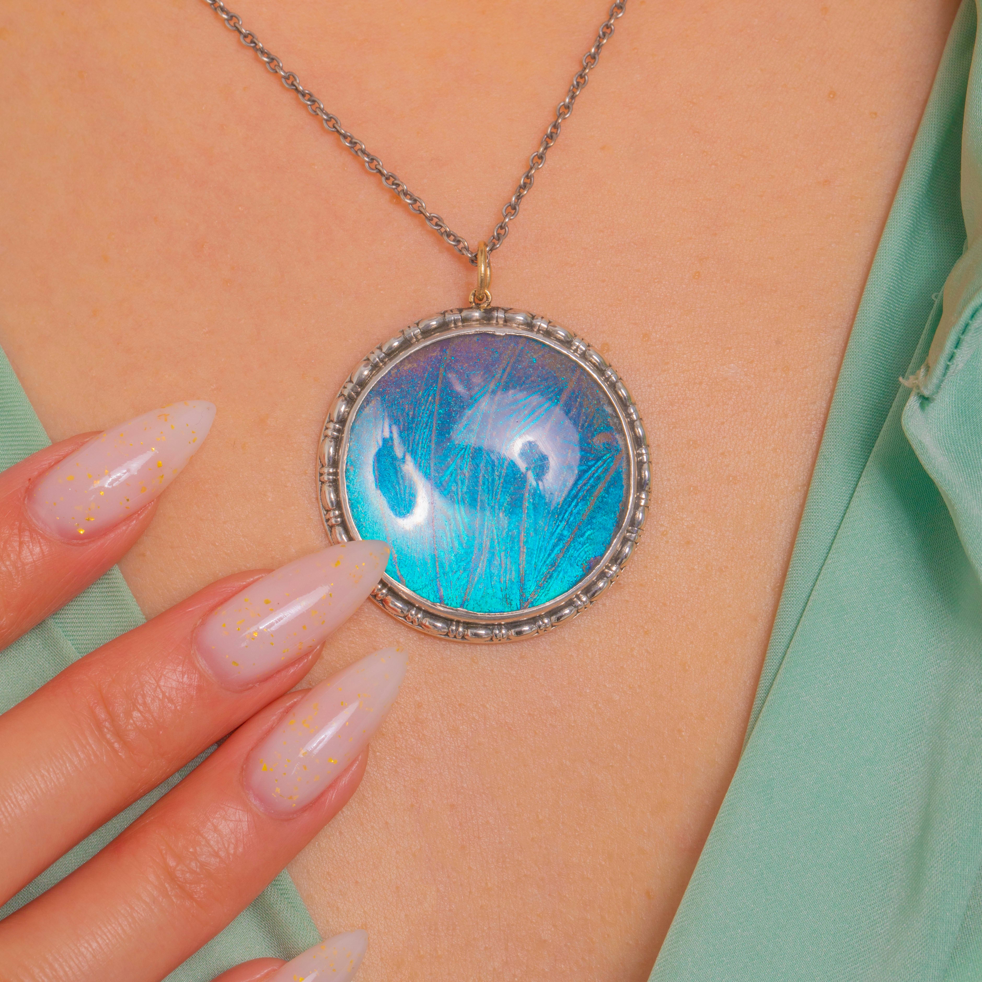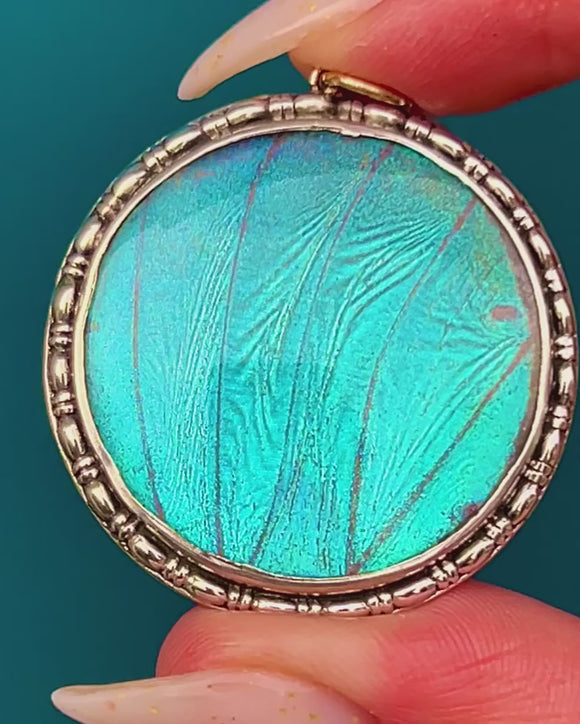 A luminous Art Deco treasure, this round Sterling Silver pendant showcases a mesmerising Morpho butterfly wing that shimmers from turquoise blue to violet beneath a domed transparent cover. The medallion form is framed by a pretty beaded, gadrooned border that catches the light beautifully, giving the piece a bold yet elegant presence.
