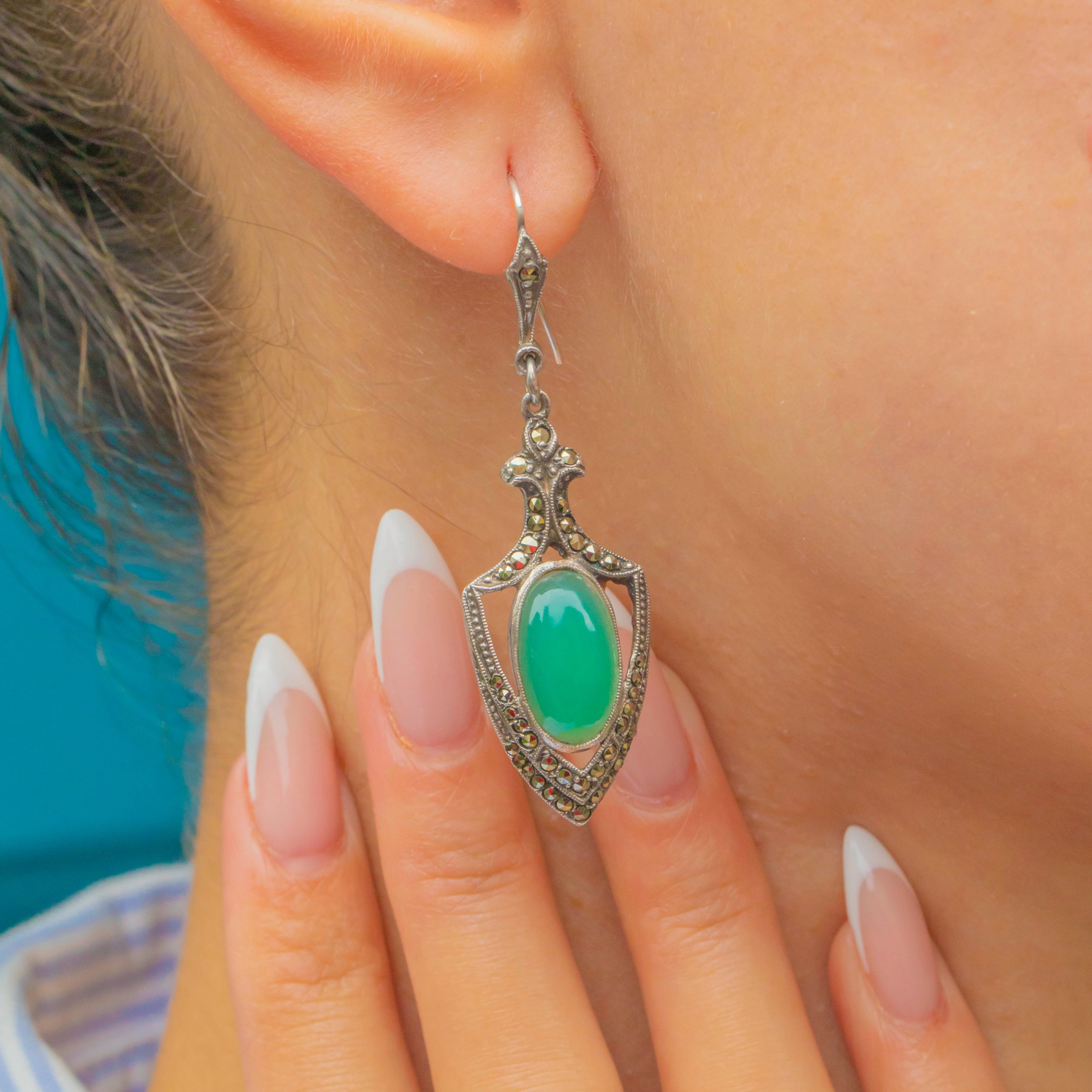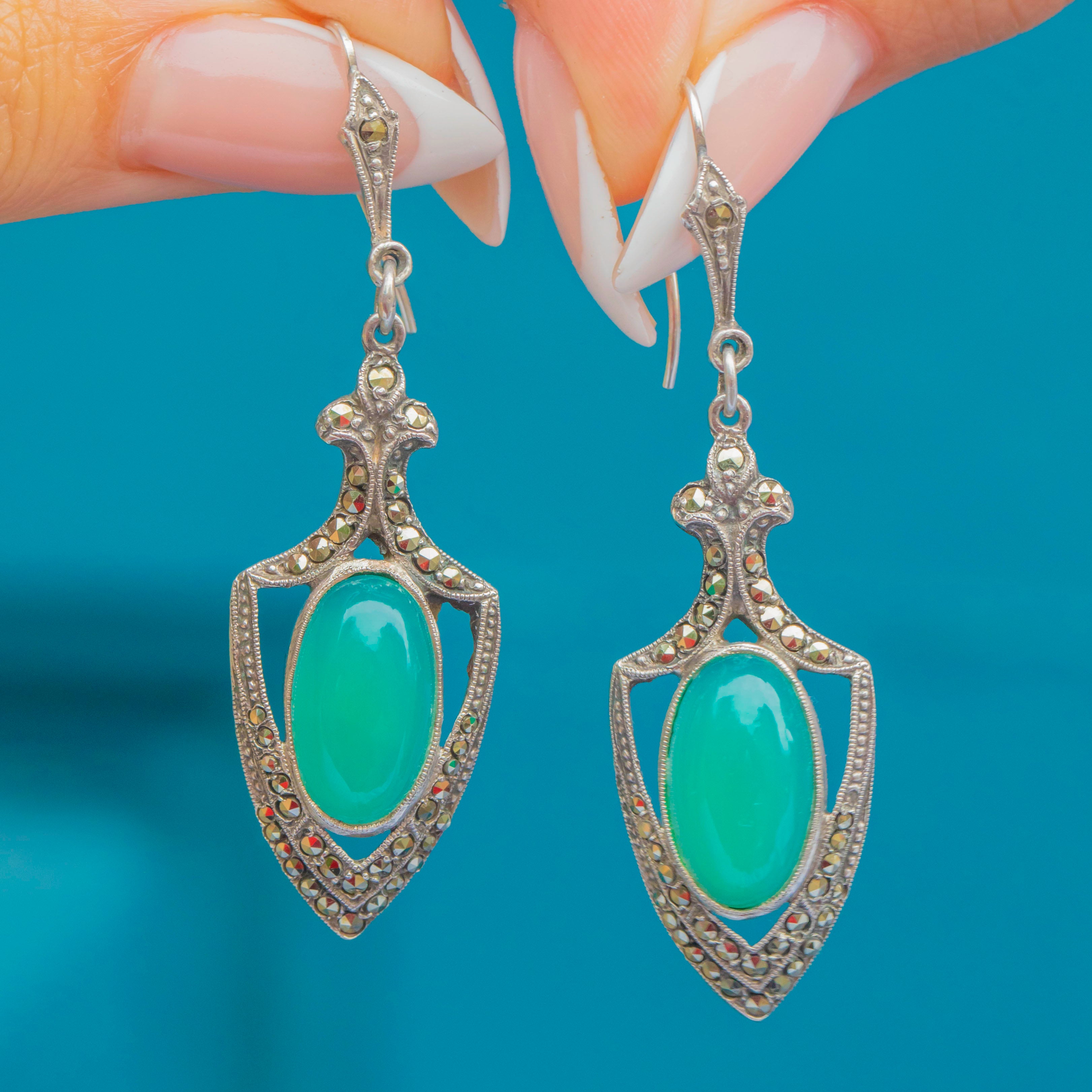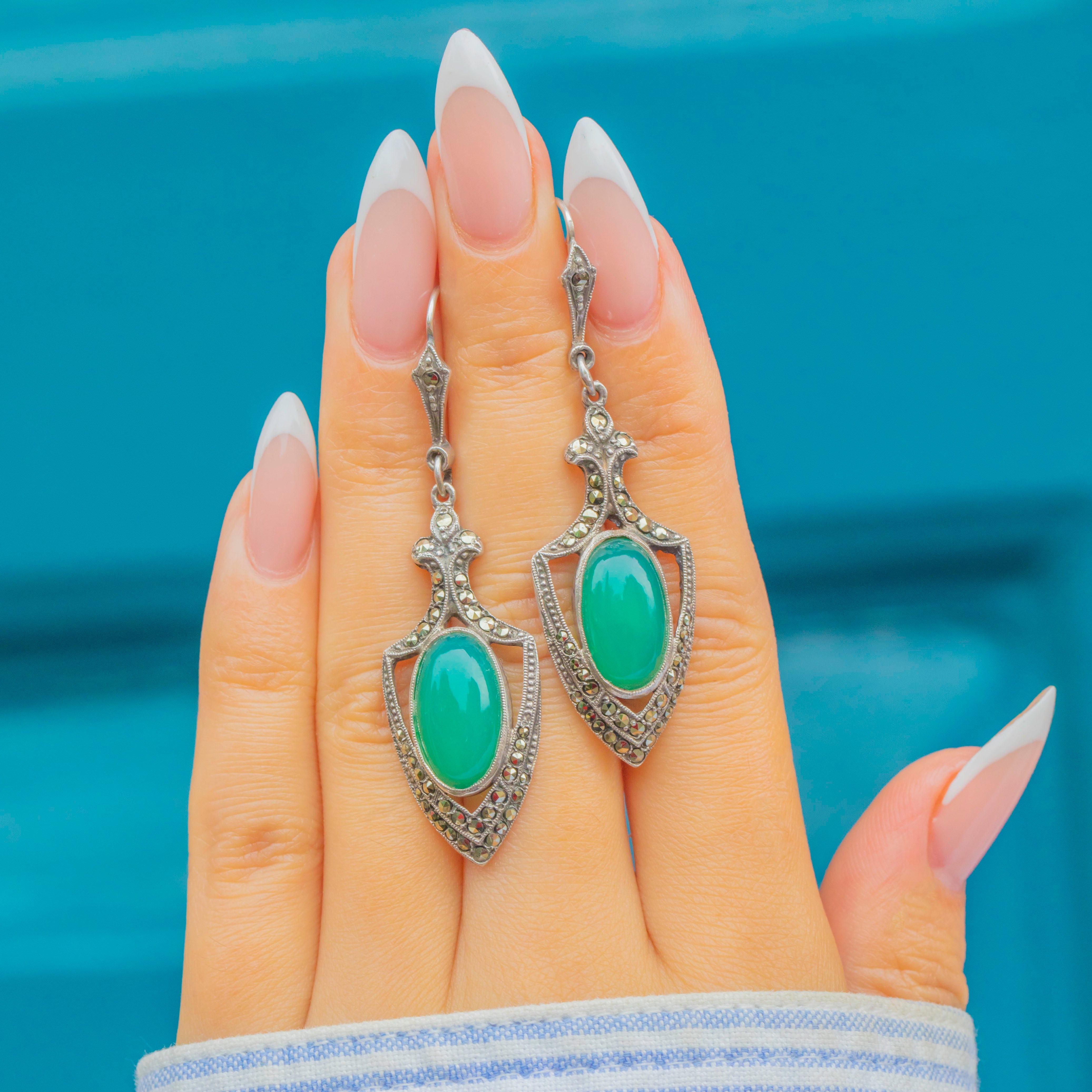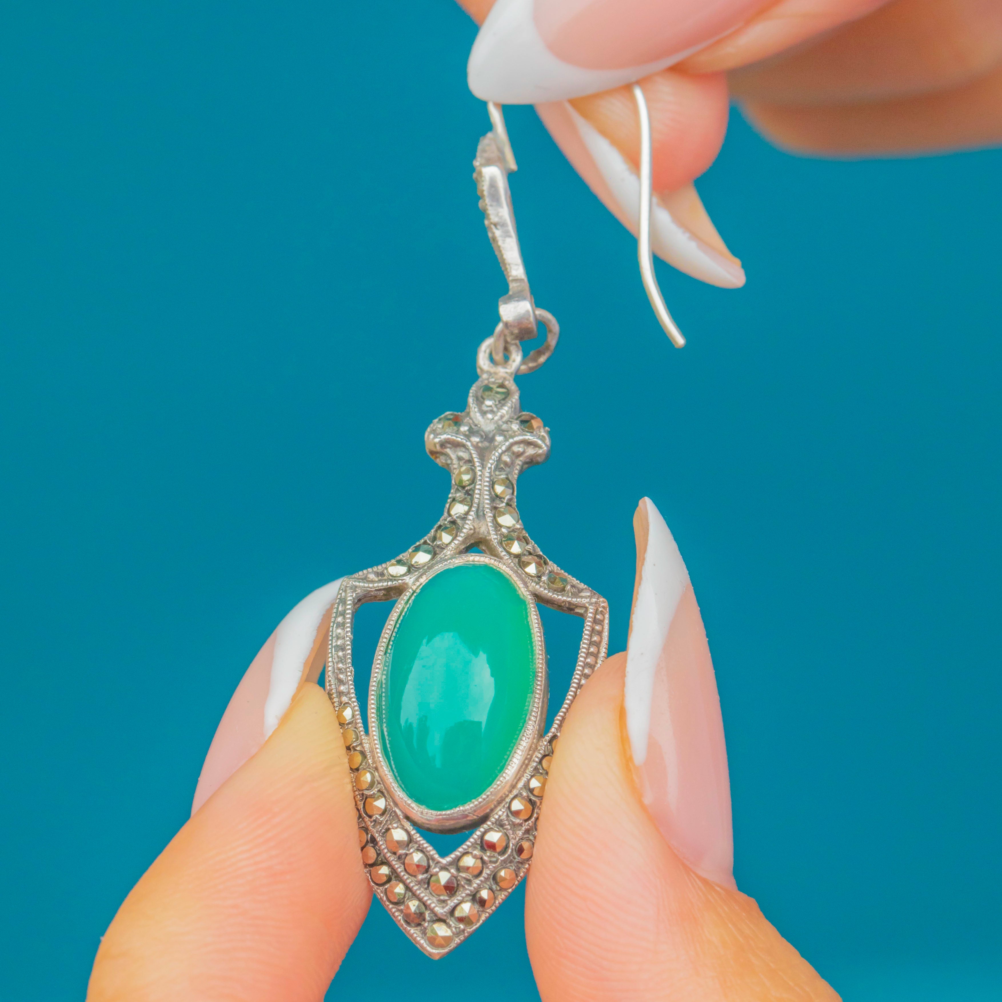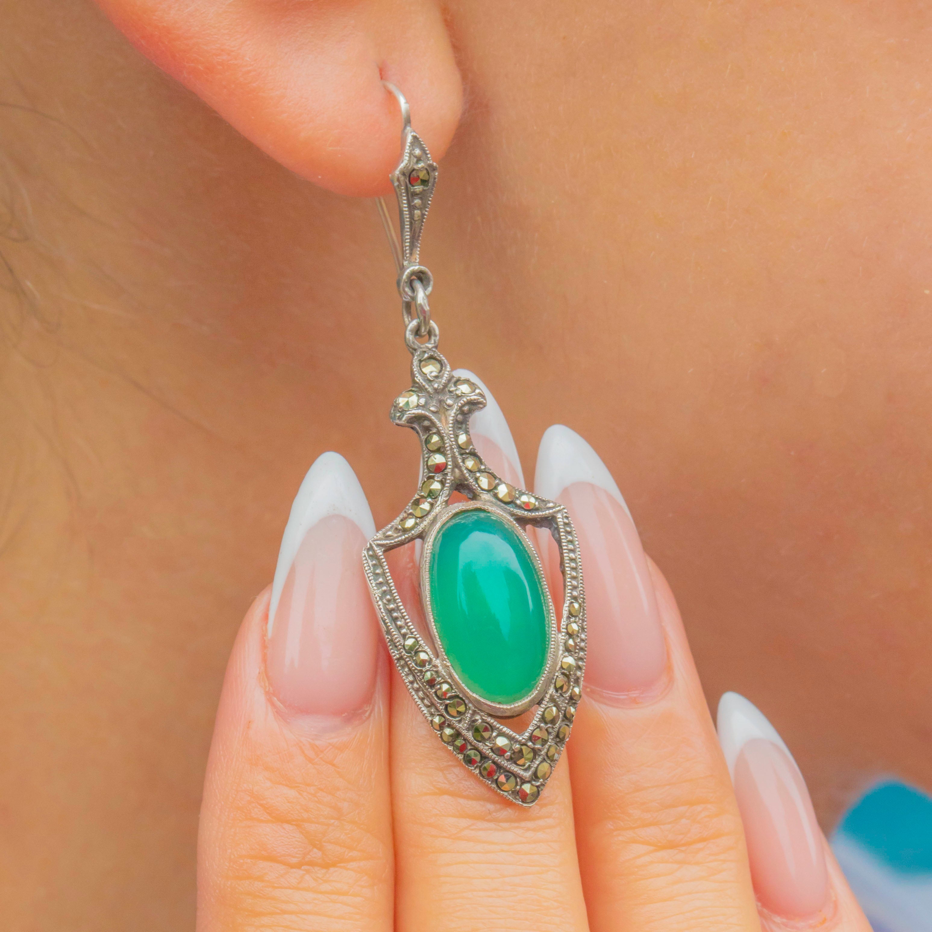The Chrysoprase gemstones glow with their signature bright green hue, bringing a refreshing pop of colour that contrasts beautifully with the darker sparkle of the Marcasite. Lightly elongated, these earrings are designed to flatter the jawline and catch the light with every movement, embodying the confident glamour of the era.