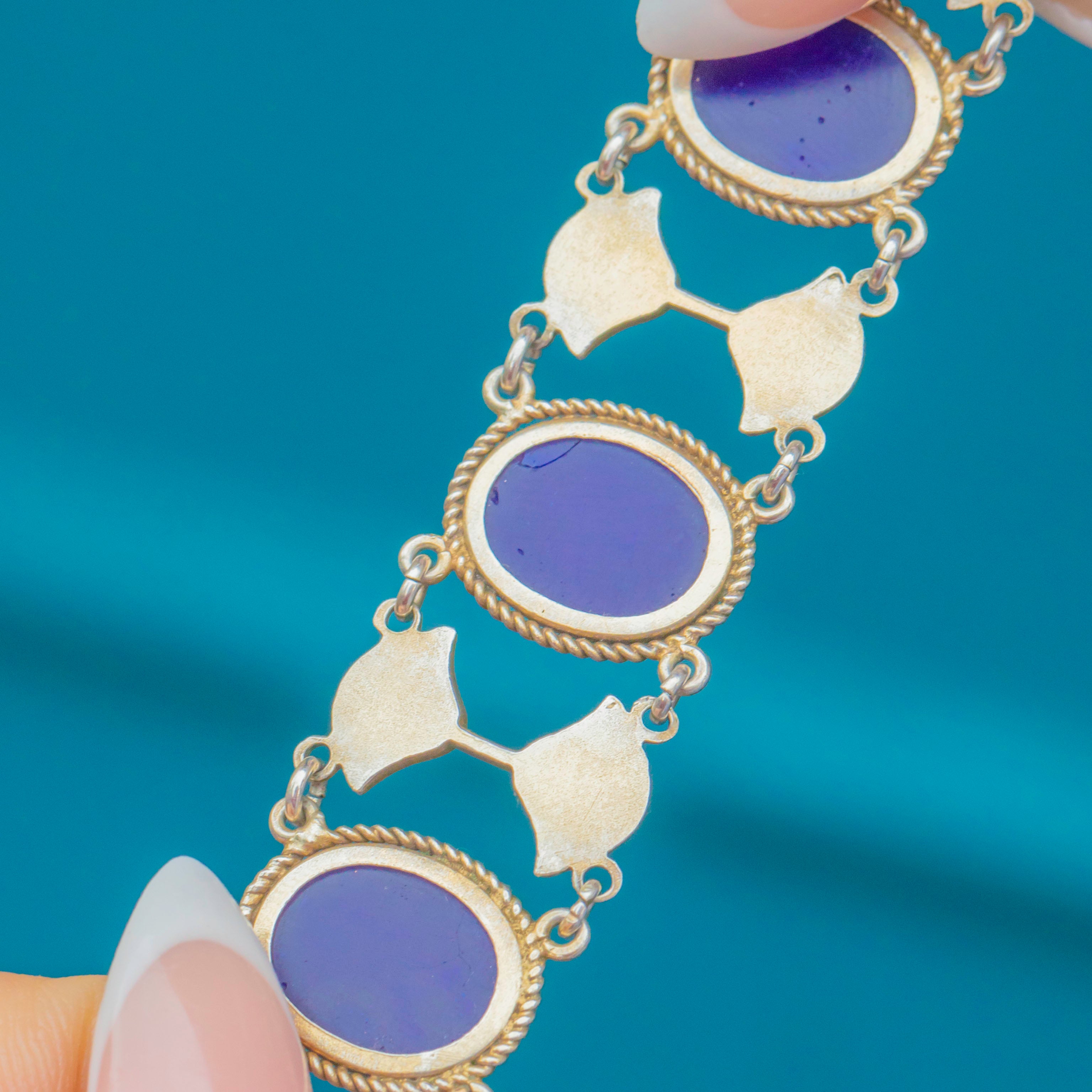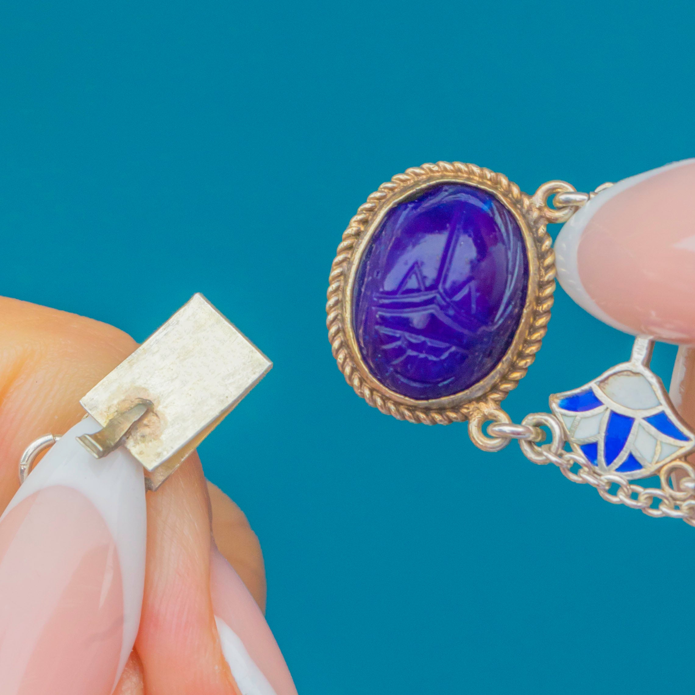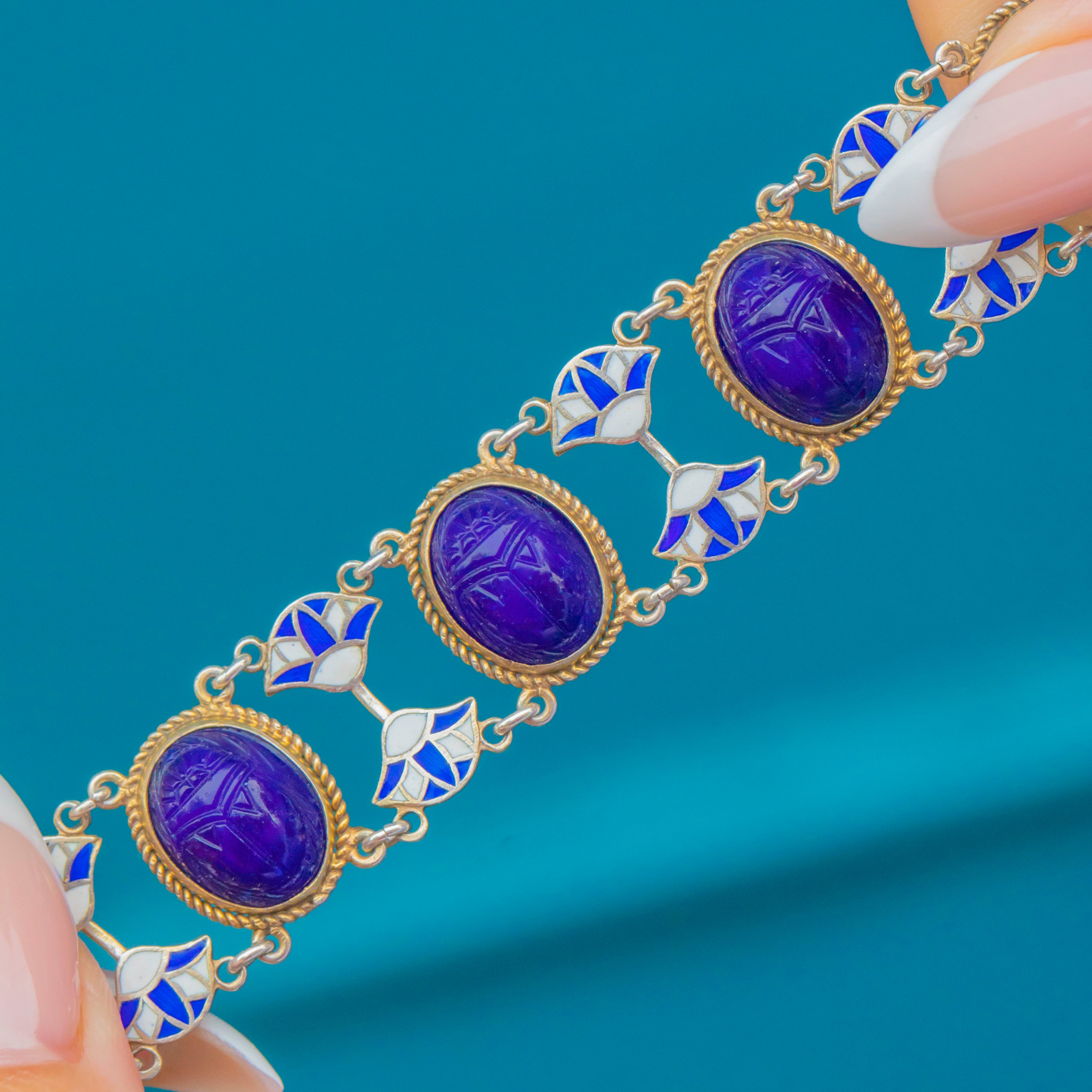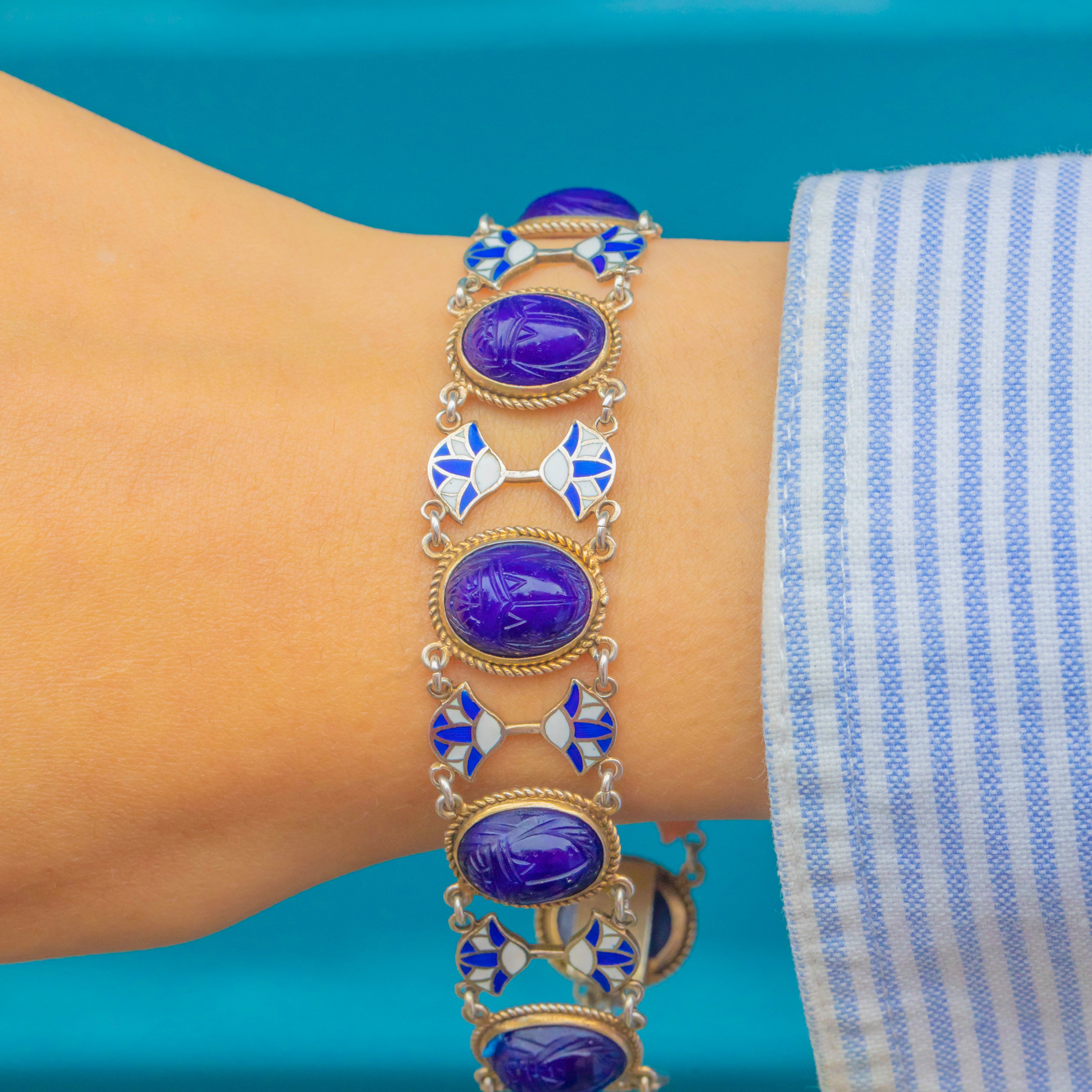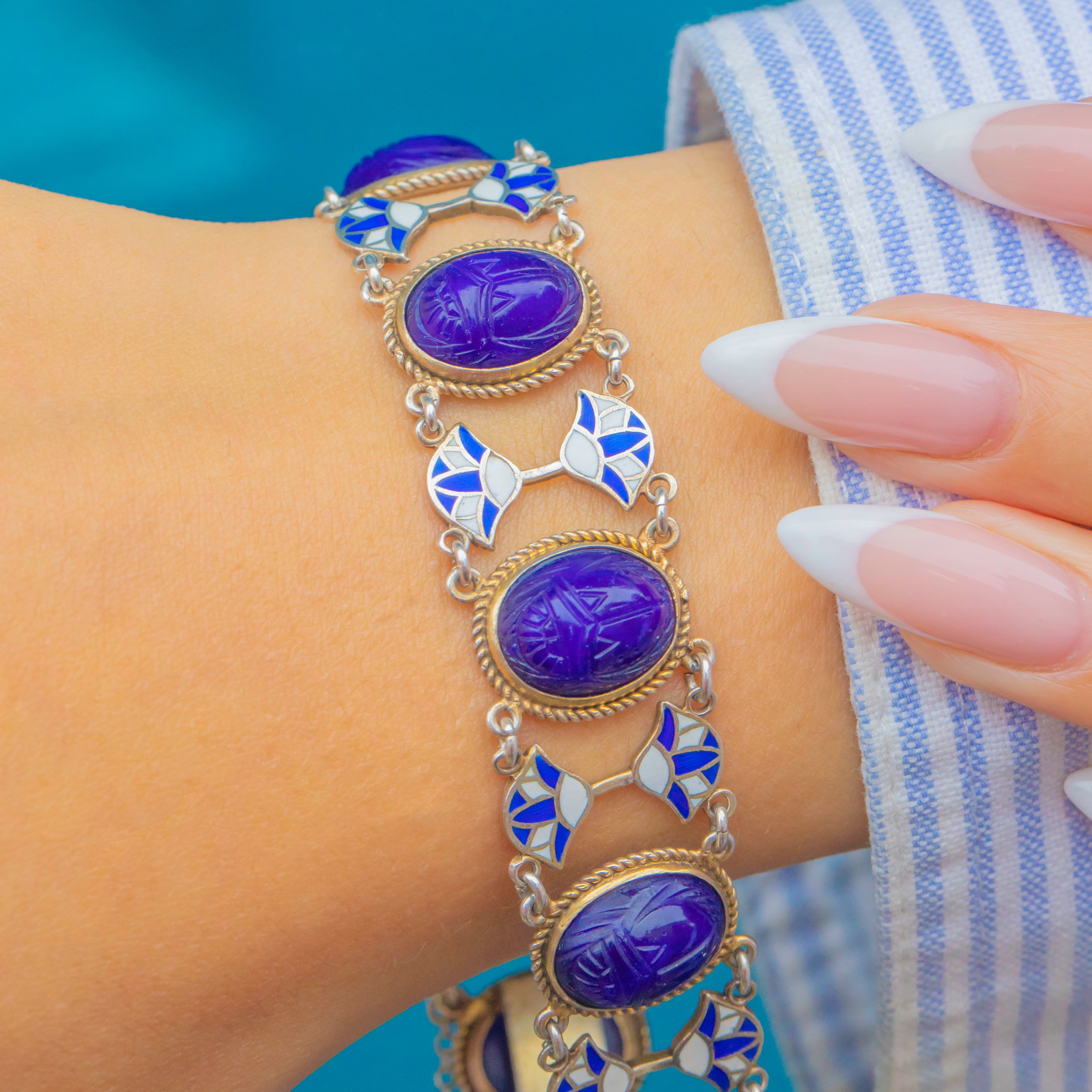 This striking Art Deco Egyptian Revival bracelet is a wonderful example of 1920s jewellery design, marrying bold colour with symbolic motifs. Each link features a carved deep blue glass scarab set within a rope-twist Silver frame, the scarabs a nod to Ancient Egyptian amulets symbolising rebirth and protection. Between the scarabs sit stylised lotus flowers in vibrant blue and white Enamel, another iconic motif from antiquity, beautifully executed in the clean lines of Art Deco geometry.