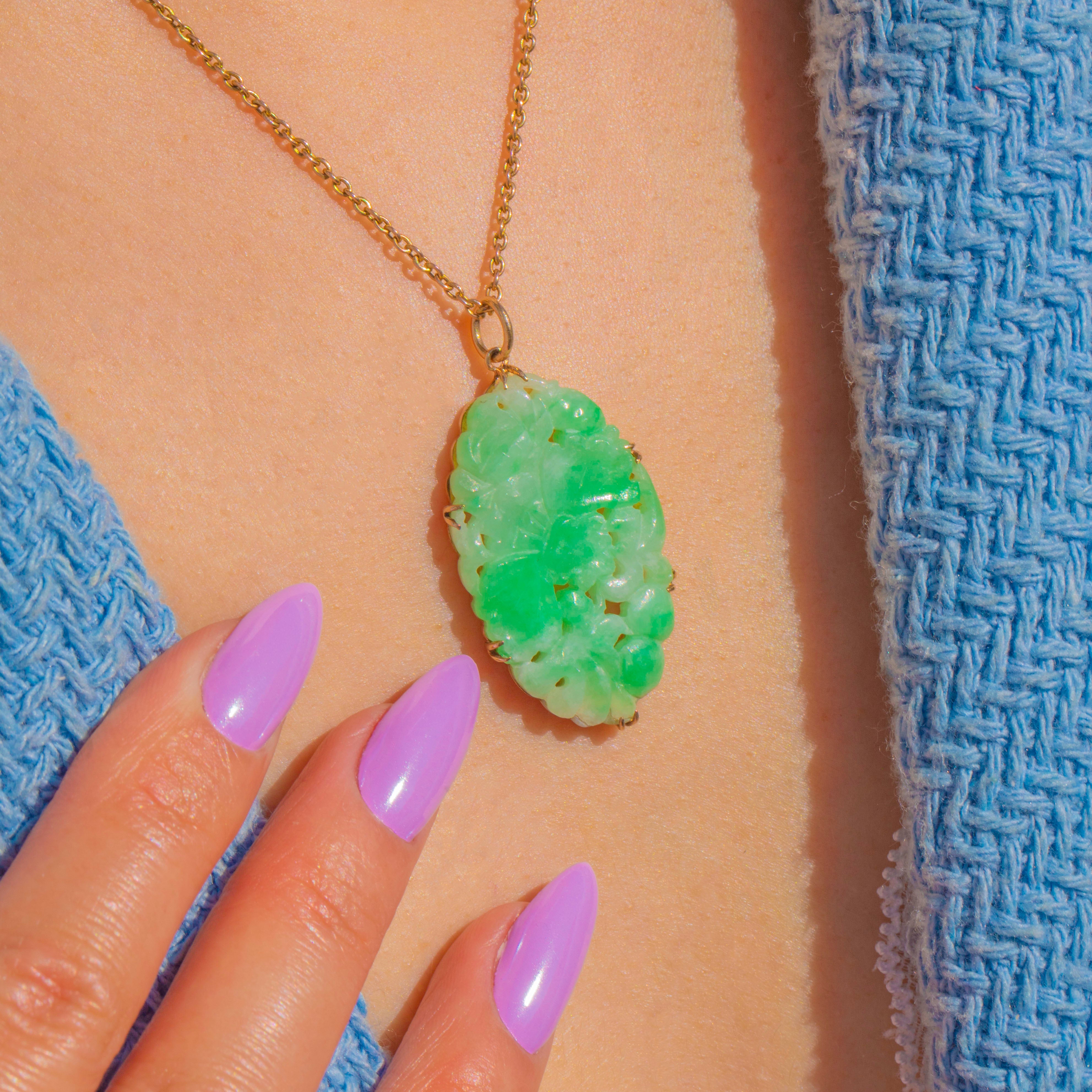 A beautiful Art Deco carved Jade pendant in warm 9ct Gold. The oval Jade plaque is intricately carved with floral and foliate motifs and pierced to create airy openwork, its surface alive with softly mottled celadon to apple-green hues. Framed by a scalloped, claw-set mount with a soldered jump-ring, it’s a timeless, elegant jewel with serene colour and exquisite detail.