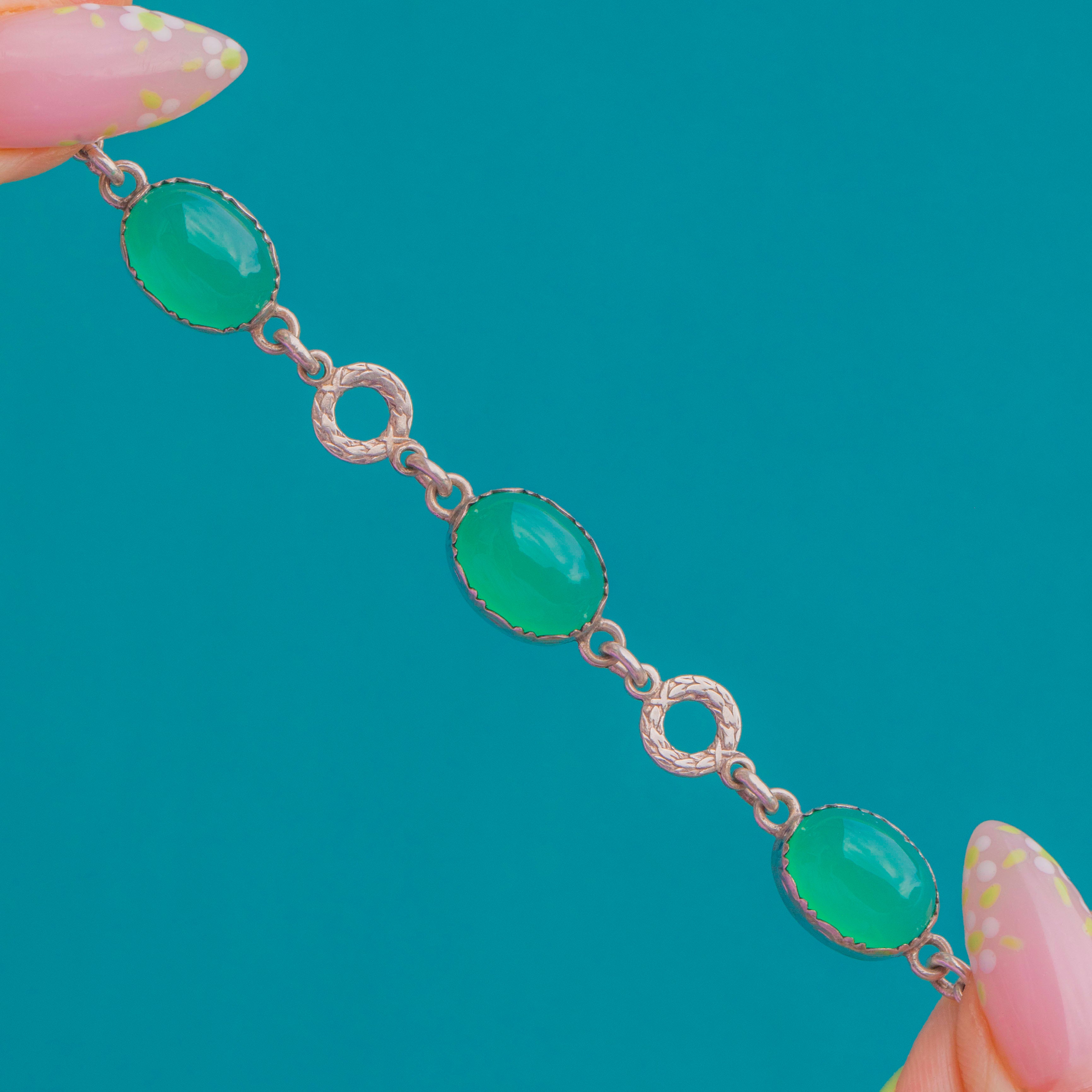 Elegant and unmistakably Art Deco, this Sterling Silver bracelet showcases a rhythmic sequence of bright green Chrysoprase cabochons. Each oval, domed gem is cradled in a scalloped bezel and spaced with engraved circular “wreath” links, creating a refined play of shape and texture as the bracelet moves on the wrist.