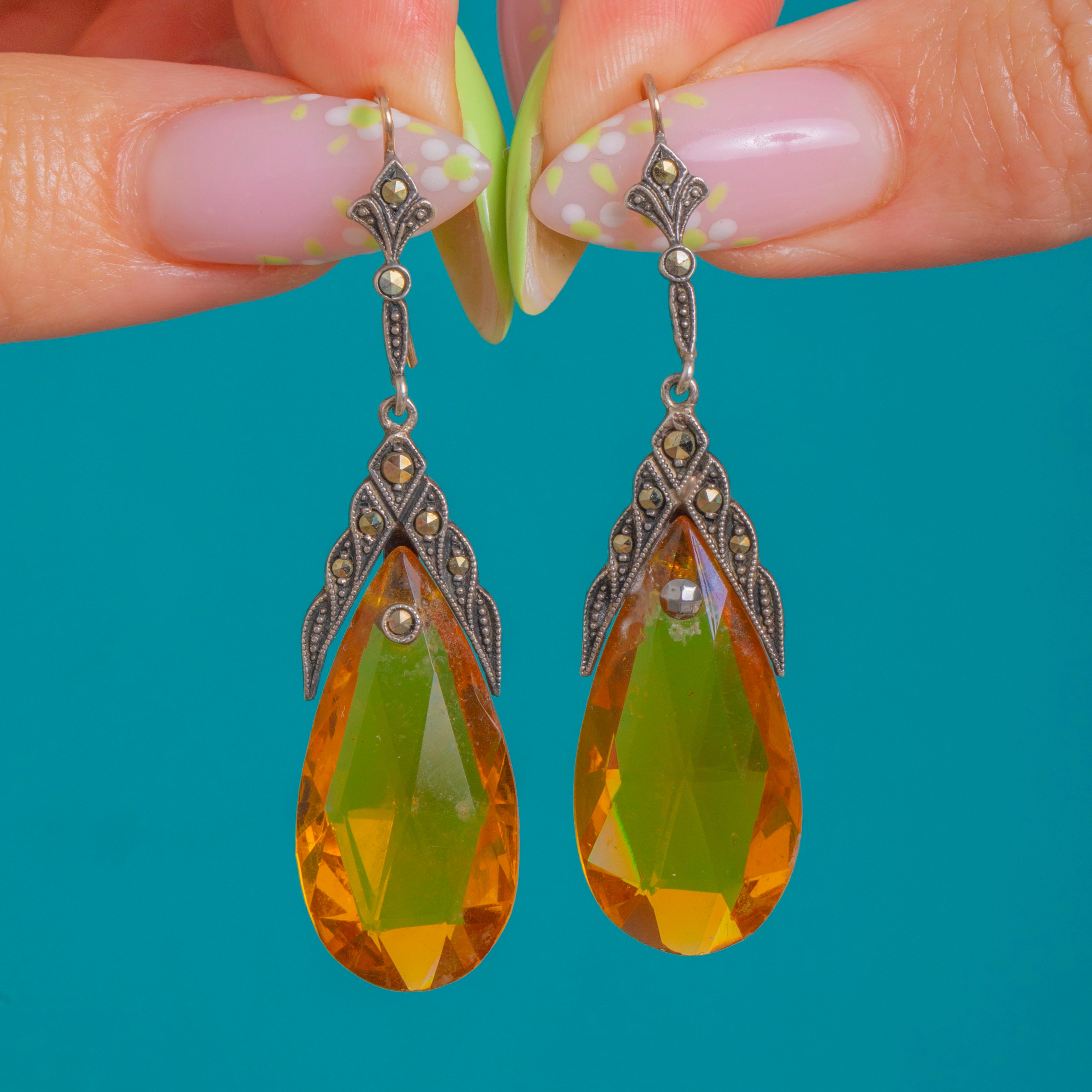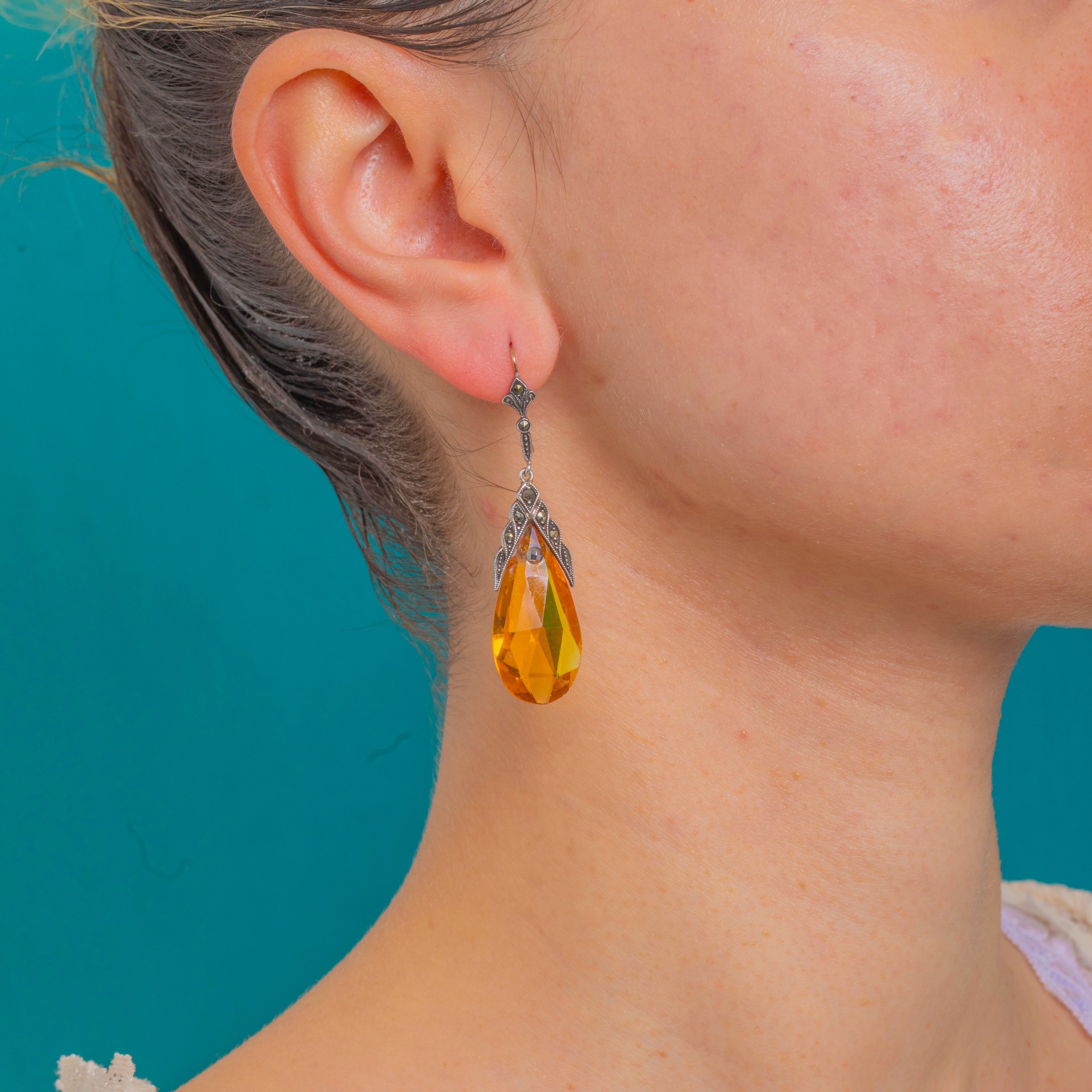 Art Deco Yellow Paste Briolette & Marcasite Drop Earrings, Original 9ct Gold Hooks