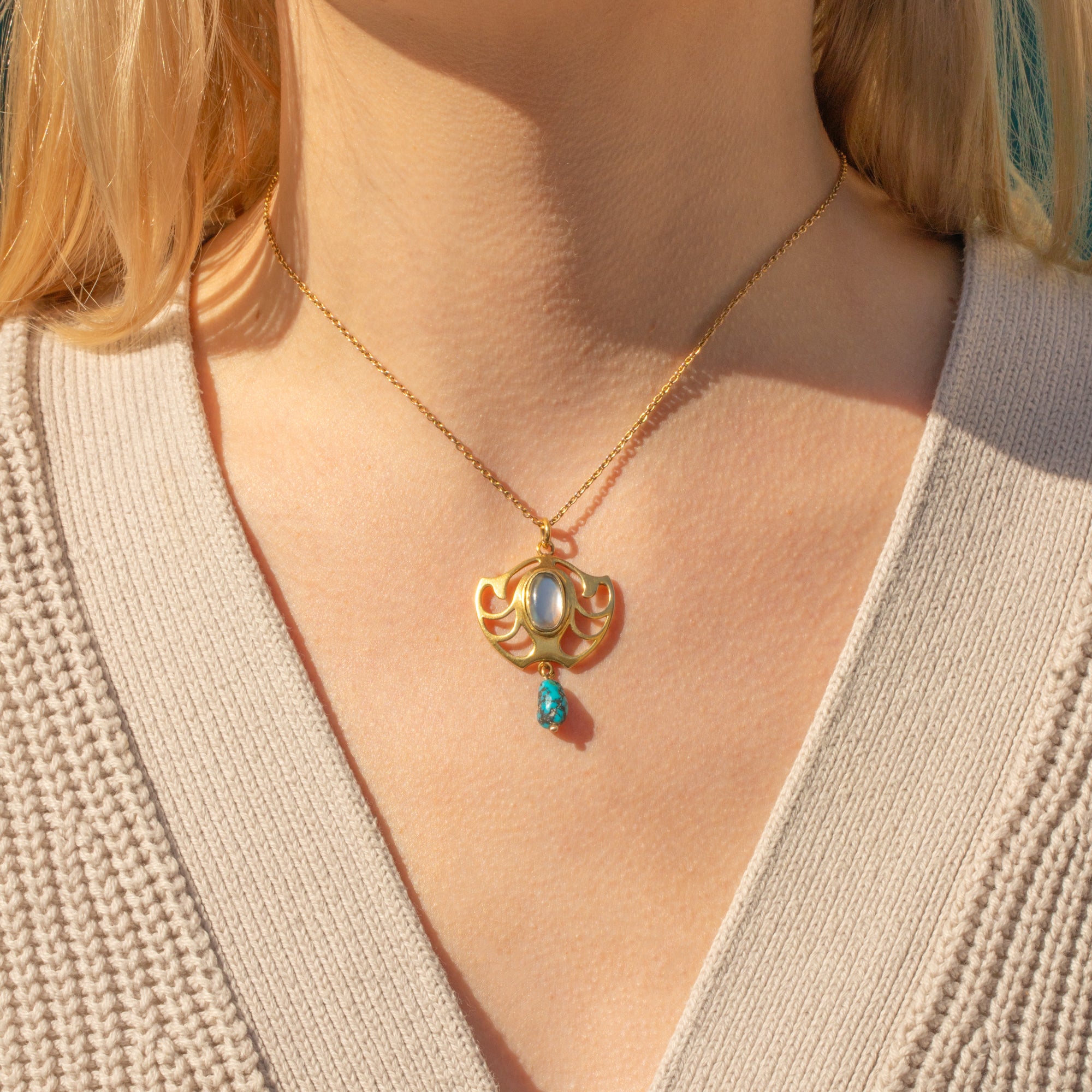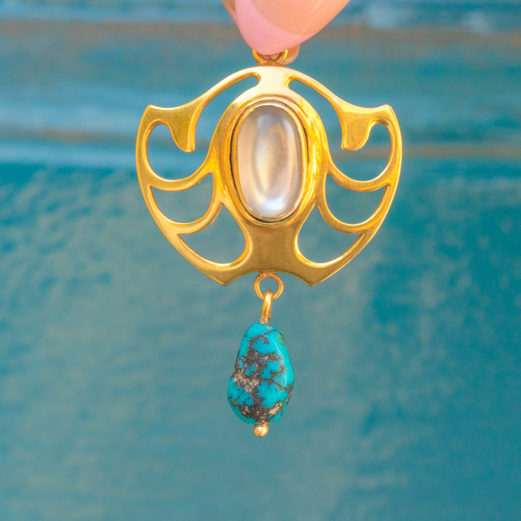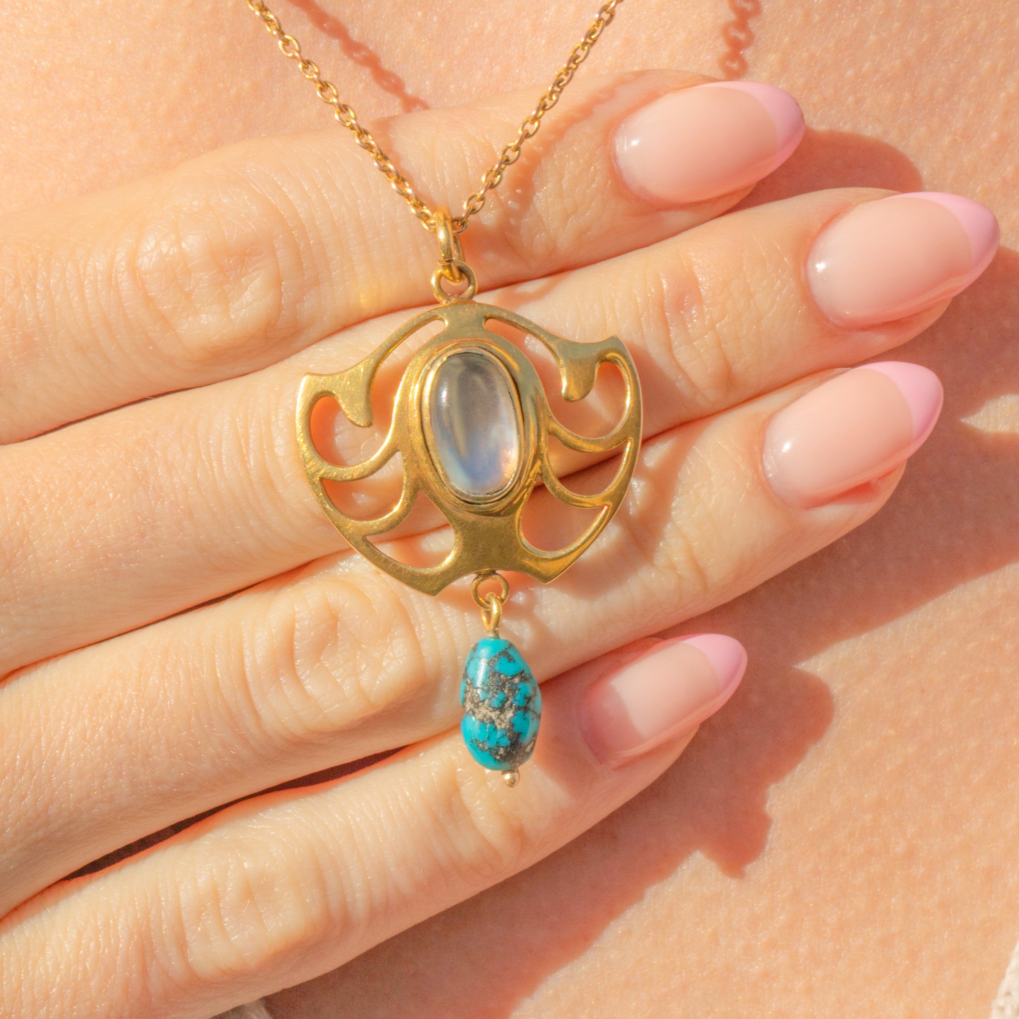 This 15ct Gold pendant takes on a classic Art Nouveau form, with fluid lines and an unmistakable silhouette. We love the choice of gemstones on this Art Nouveau pendant, with a glowing cabochon-cut Moonstone and a vivid Turquoise gemstone boasting its natural matrix!