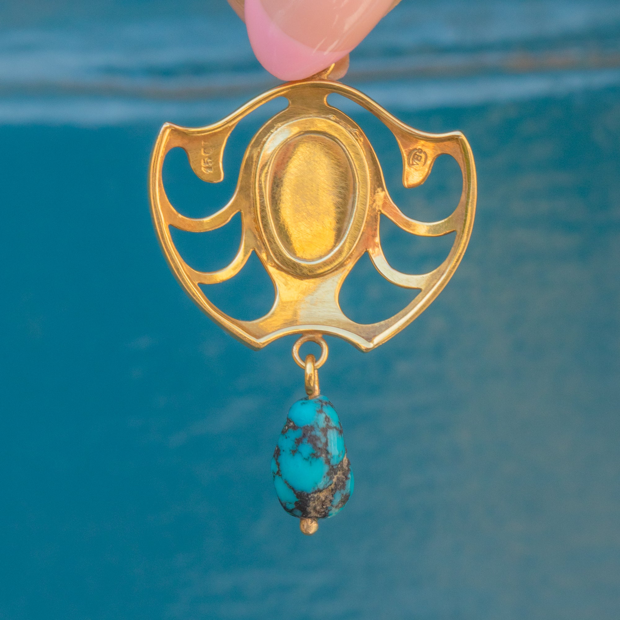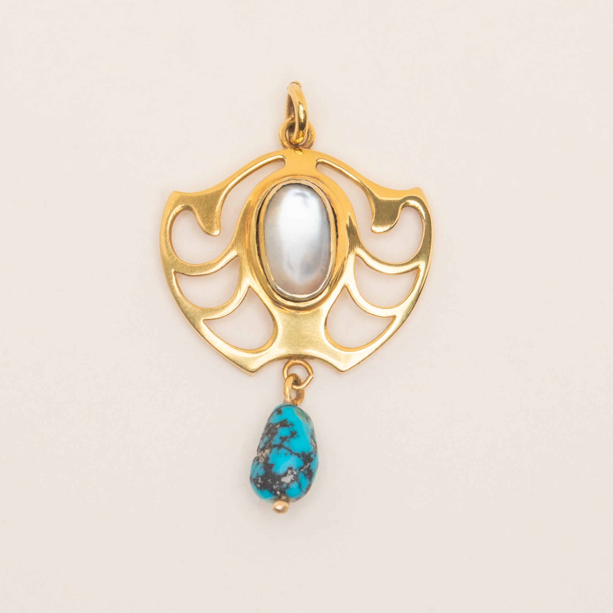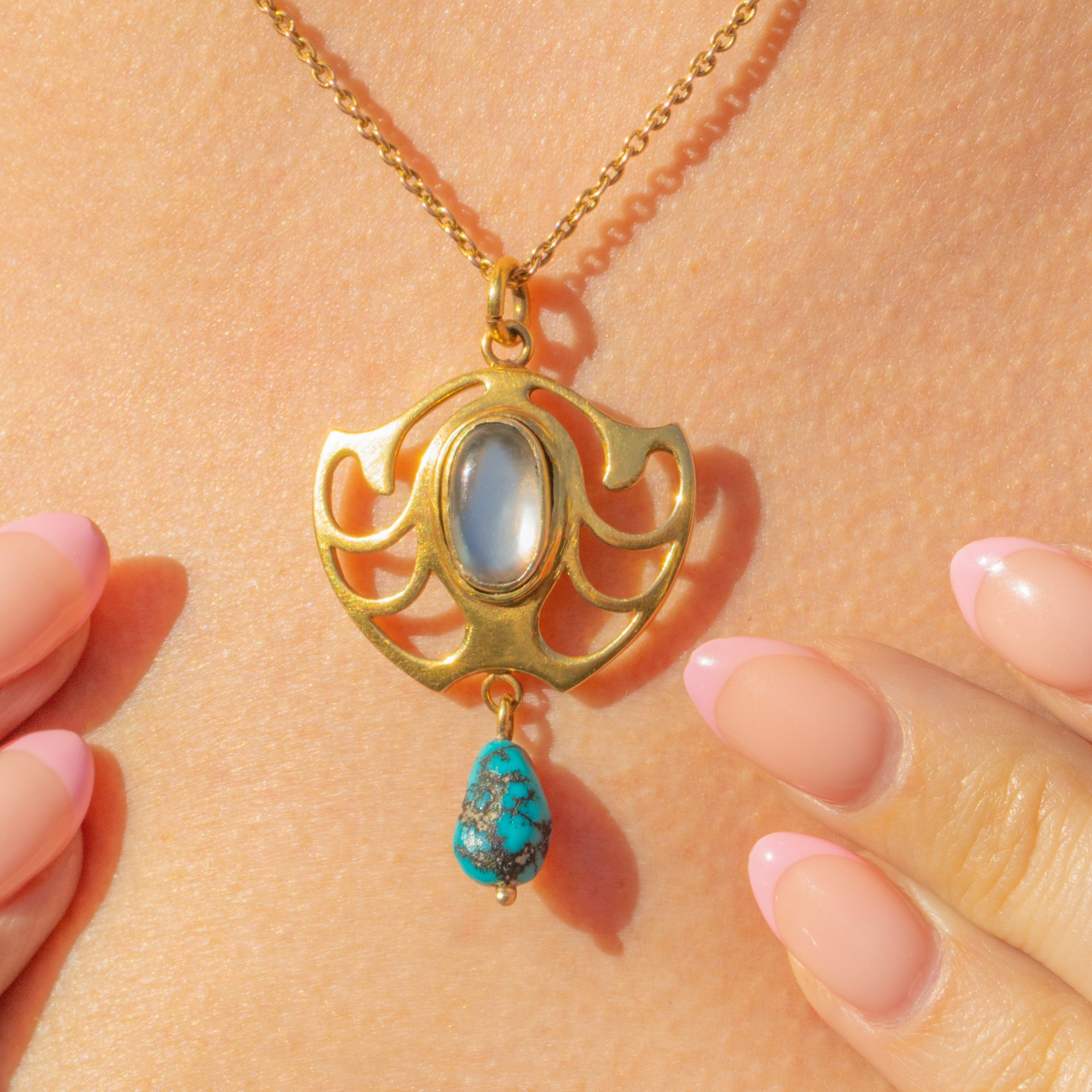This 15ct Gold pendant takes on a classic Art Nouveau form, with fluid lines and an unmistakable silhouette. We love the choice of gemstones on this Art Nouveau pendant, with a glowing cabochon-cut Moonstone and a vivid Turquoise gemstone boasting its natural matrix!