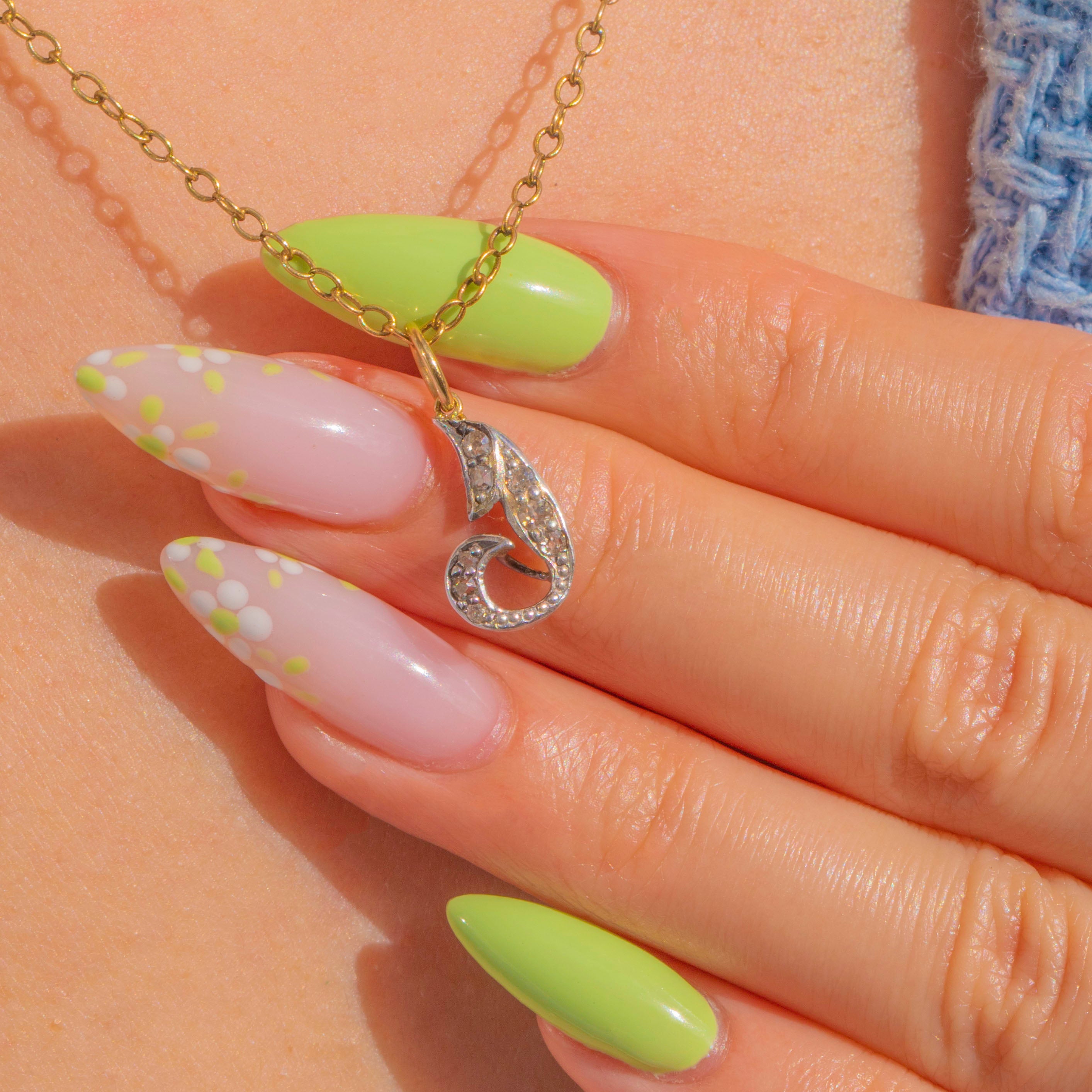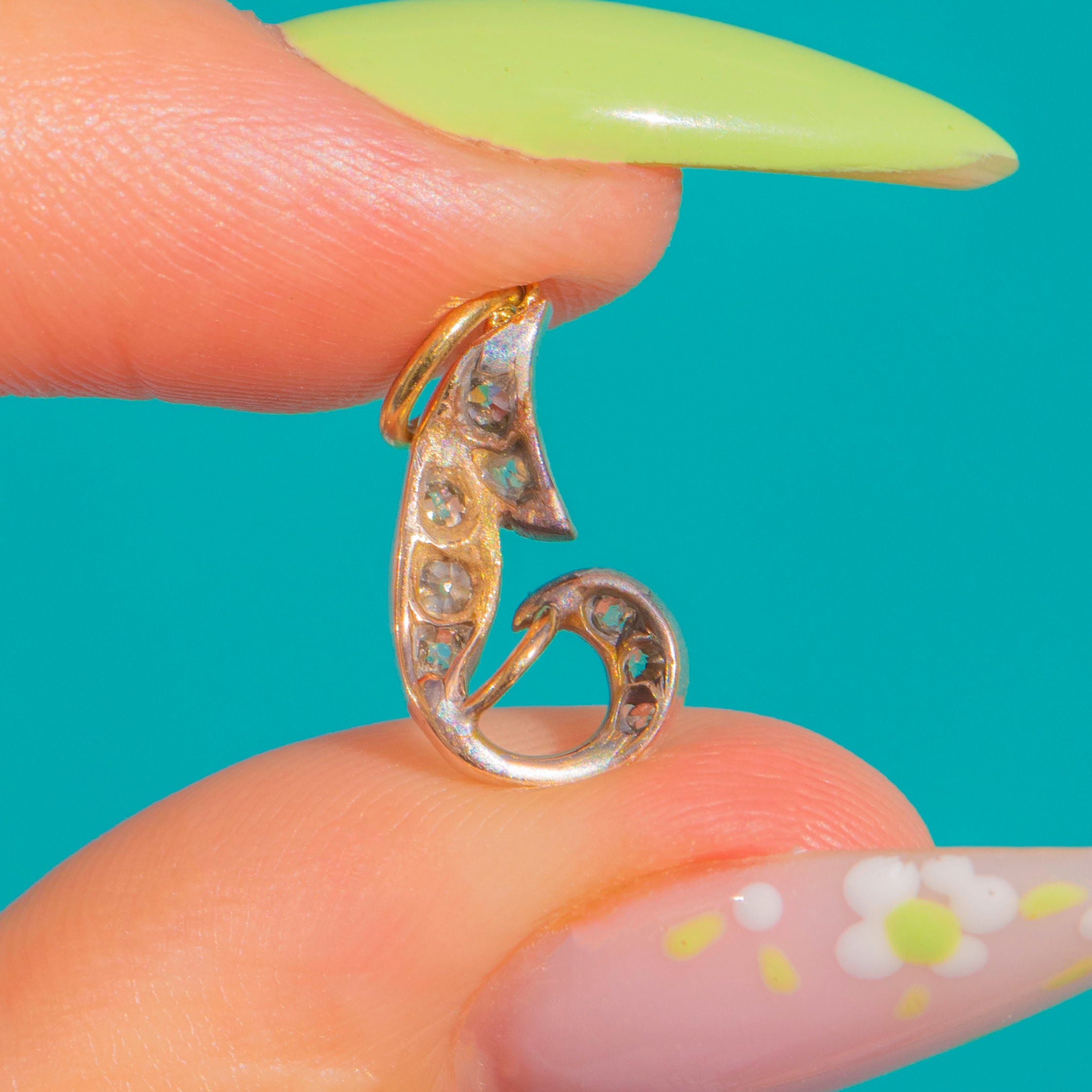 Sensuous Art Nouveau lines meet delicate sparkle in this petite Diamond charm. Shaped as a softly curling foliate scroll, its front is dotted with tiny antique Diamonds that catch the light with a refined, twinkling glow. The elegant two-tone palette of 18ct Gold and Silver enhances the movement of the design, lending depth and contrast to every curve.
