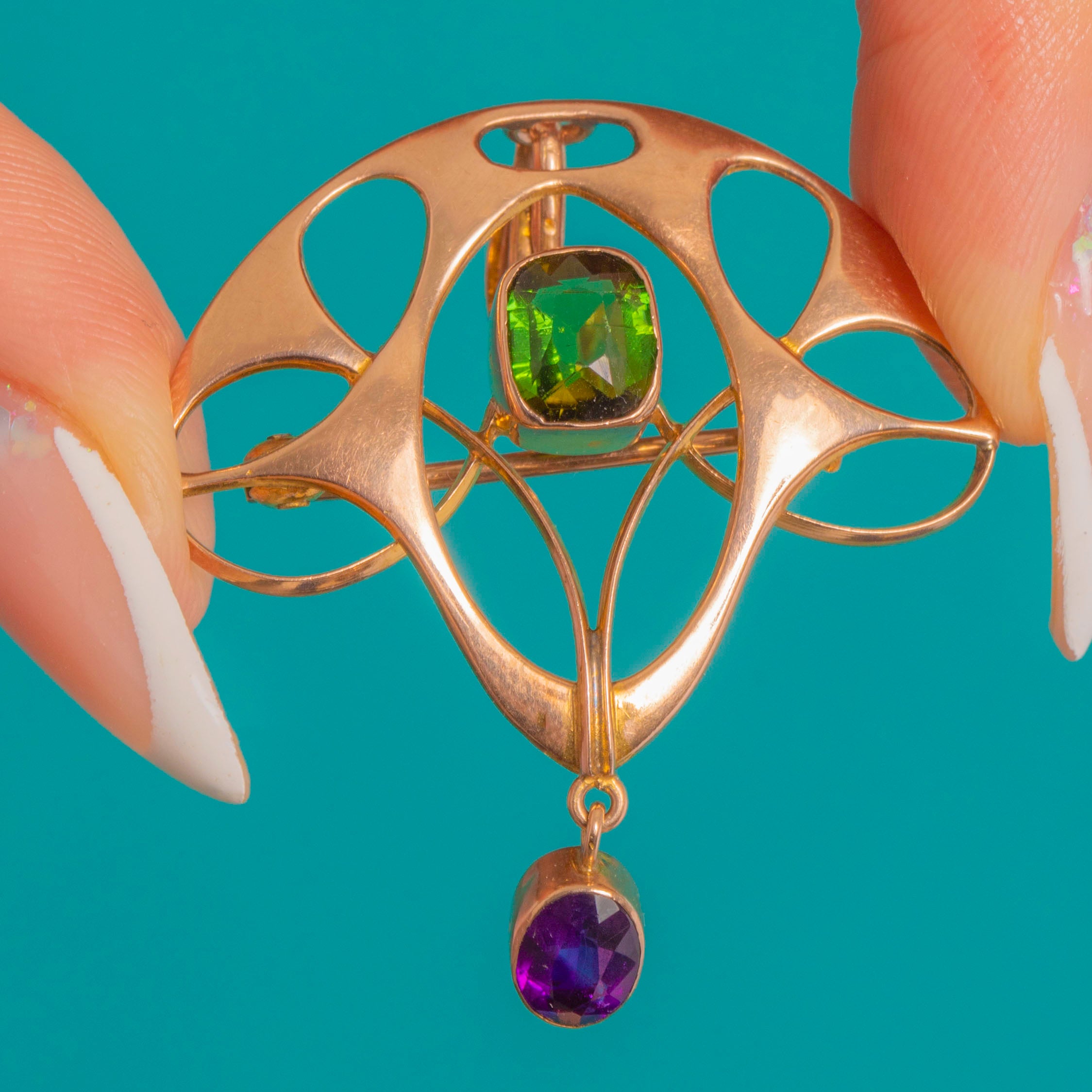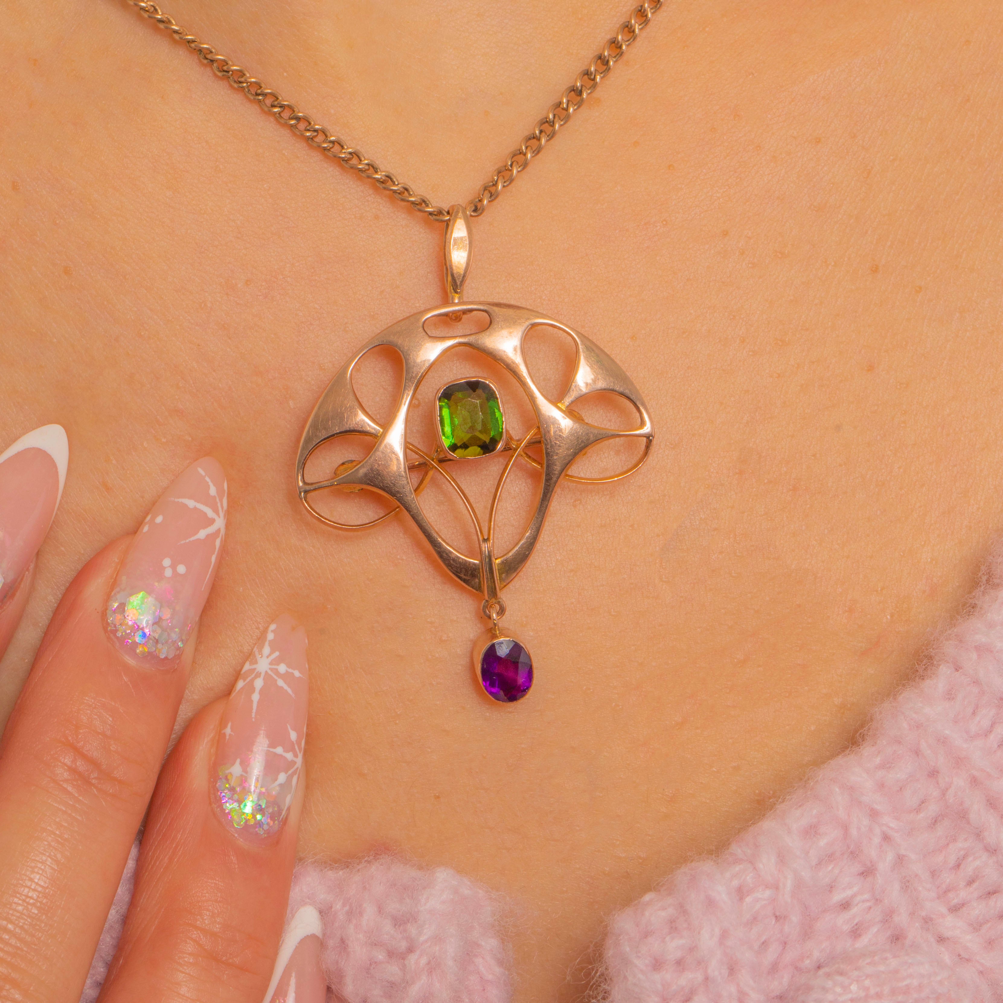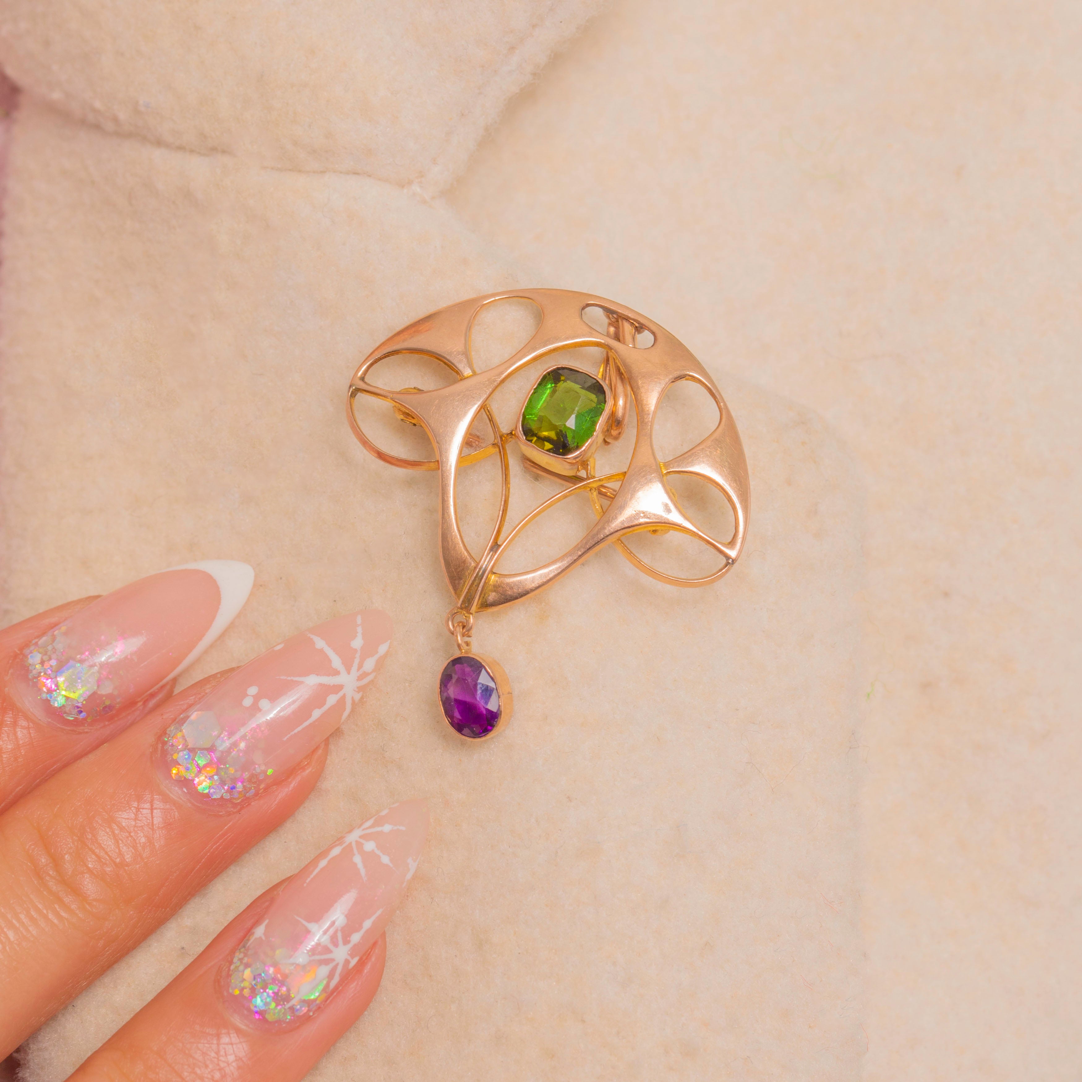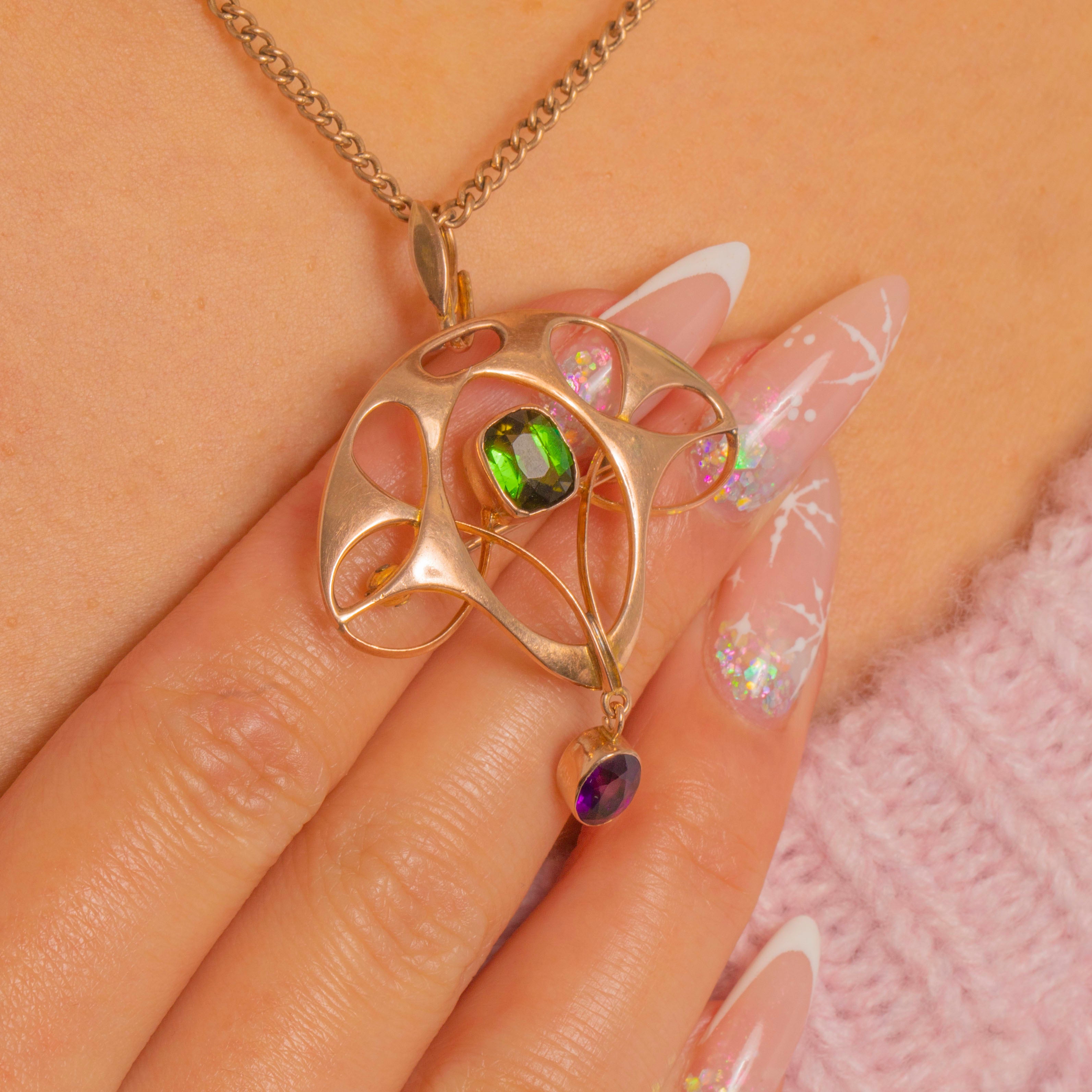 Sinuous and elegant, this Art Nouveau convertible brooch-pendant is crafted in 9ct Gold with beautifully airy openwork and flowing “whiplash” curves. A bright green Tourmaline sits at the heart in a neat bezel, while an articulated oval Amethyst drop lends a graceful movement and a final kiss of colour.