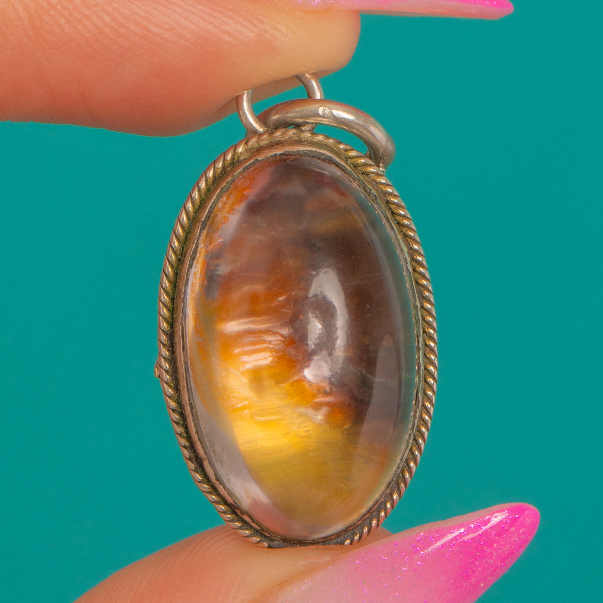 Glowing with serene clarity, this Art Nouveau pendant centres on a high oval Rock Crystal cabochon. A subtle, time-softened foil behind the Crystal lends a gentle, honeyed warmth to the otherwise transparent dome, while a hand-worked rope-twist border frames the stone with artisanal charm.