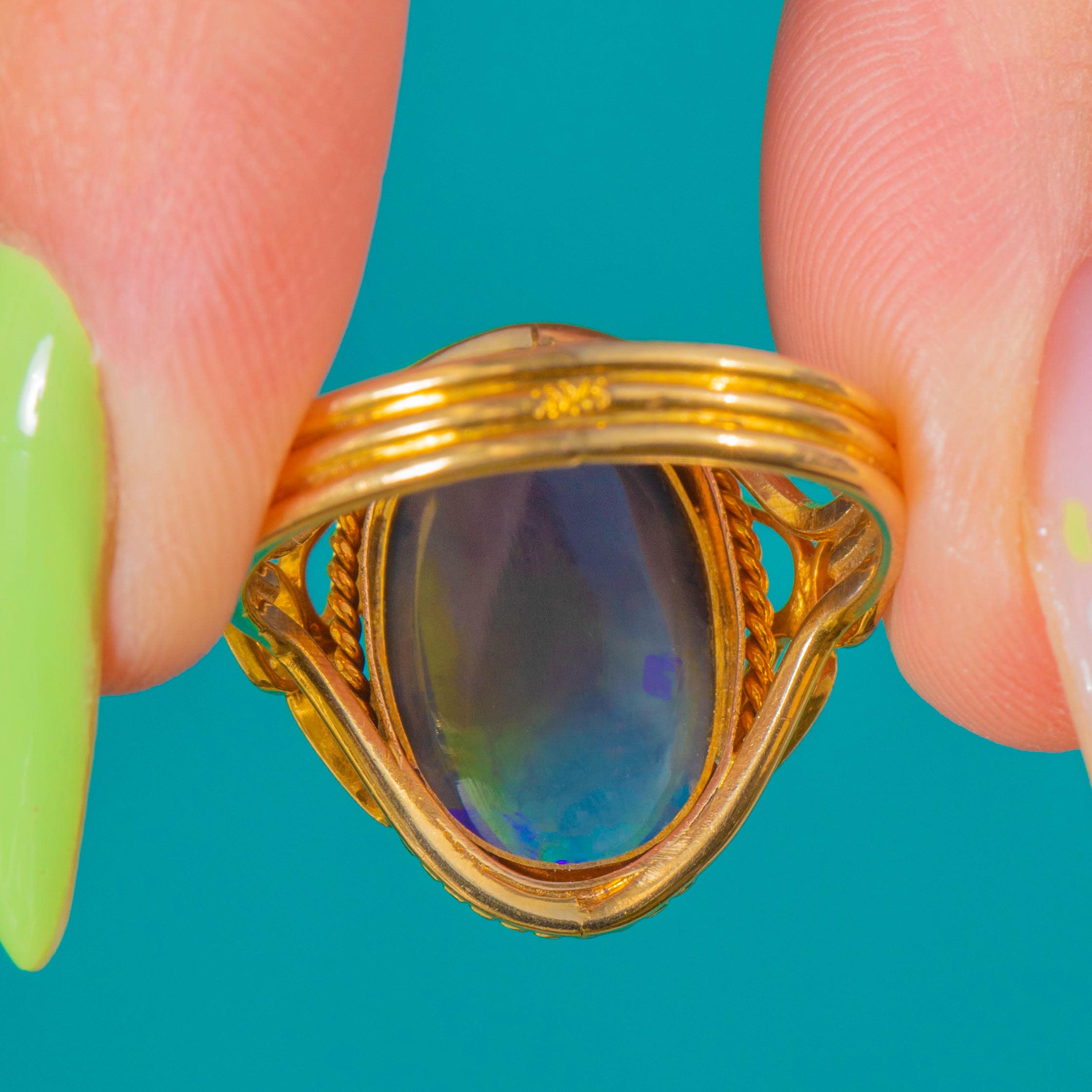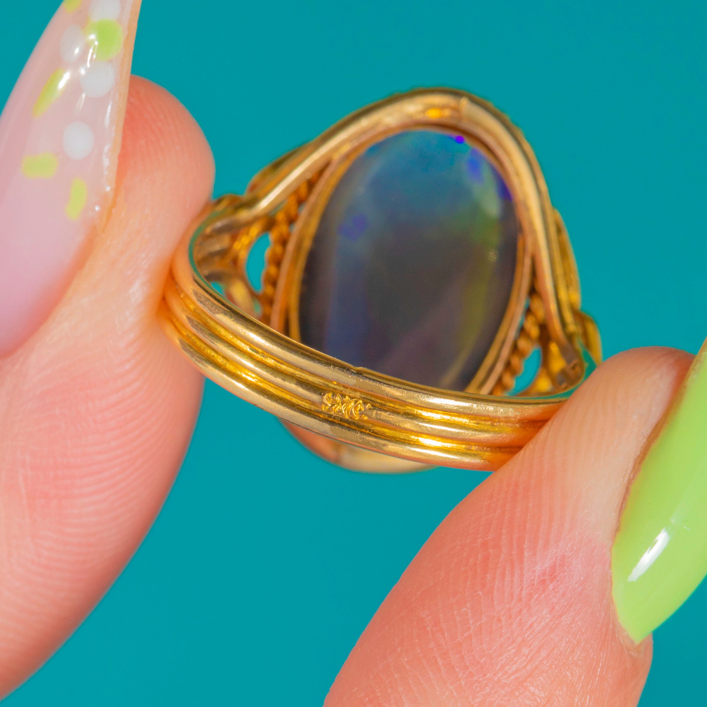 EXCELLENT: The 2.60ct Black Opal is secure with bright, lively play of colour and only minor surface abrasions visible under close inspection. The 9ct Gold bezel, rope border, and pierced shoulders are crisp with light surface wear and fine scratches commensurate with age; the split, triple-wire shank is sturdy and in round. No obvious chips, cracks, losses, repairs, or resizing marks.