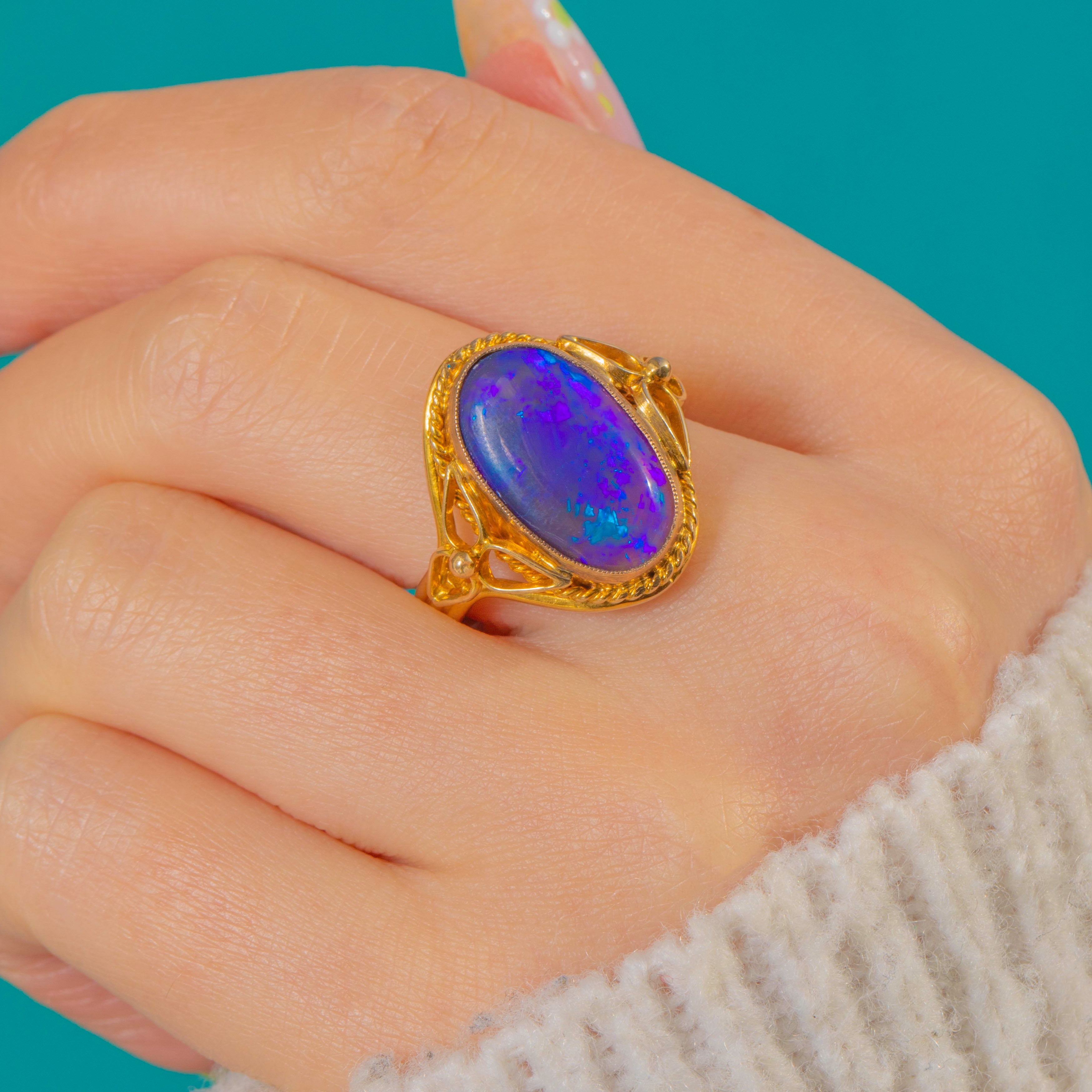 Glowing with an electric play-of-colour, this Arts and Crafts ring showcases a 2.60ct solid Black Opal in rich 9ct Gold. The high-domed oval cabochon shimmers violet-blue with vivid flashes of green, captured in a protective bezel framed by an applied twisted-rope border. Pierced foliate and scrollwork shoulders lead to a sculptural split, triple-wire shank, lending the piece its romantic, hand-wrought character.