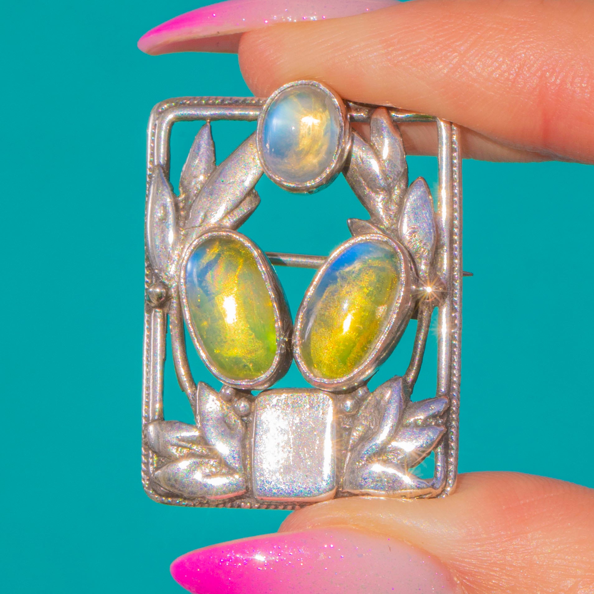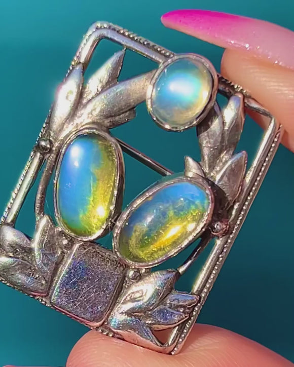 Arts & Crafts Era Silver Foiled Moonstone Brooch