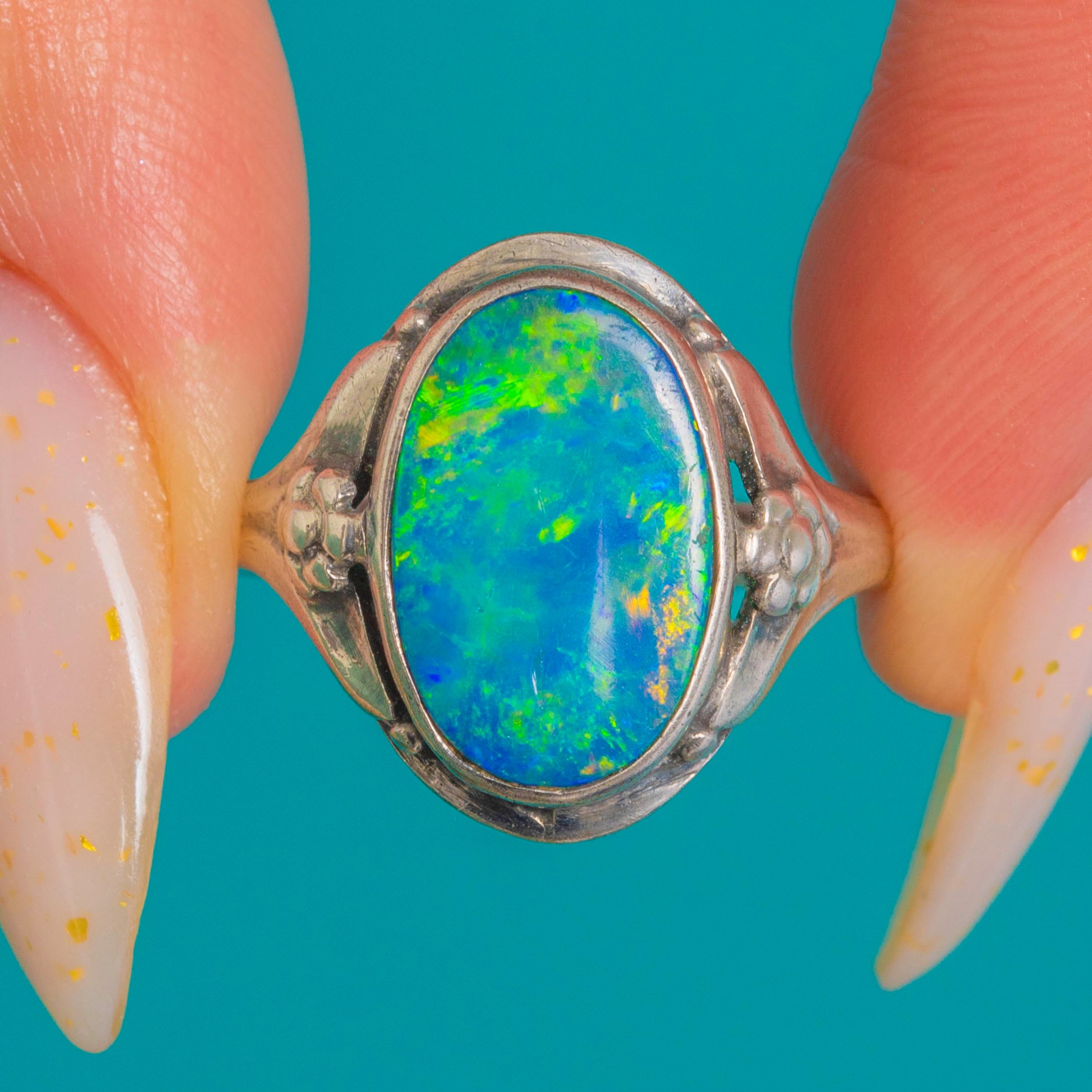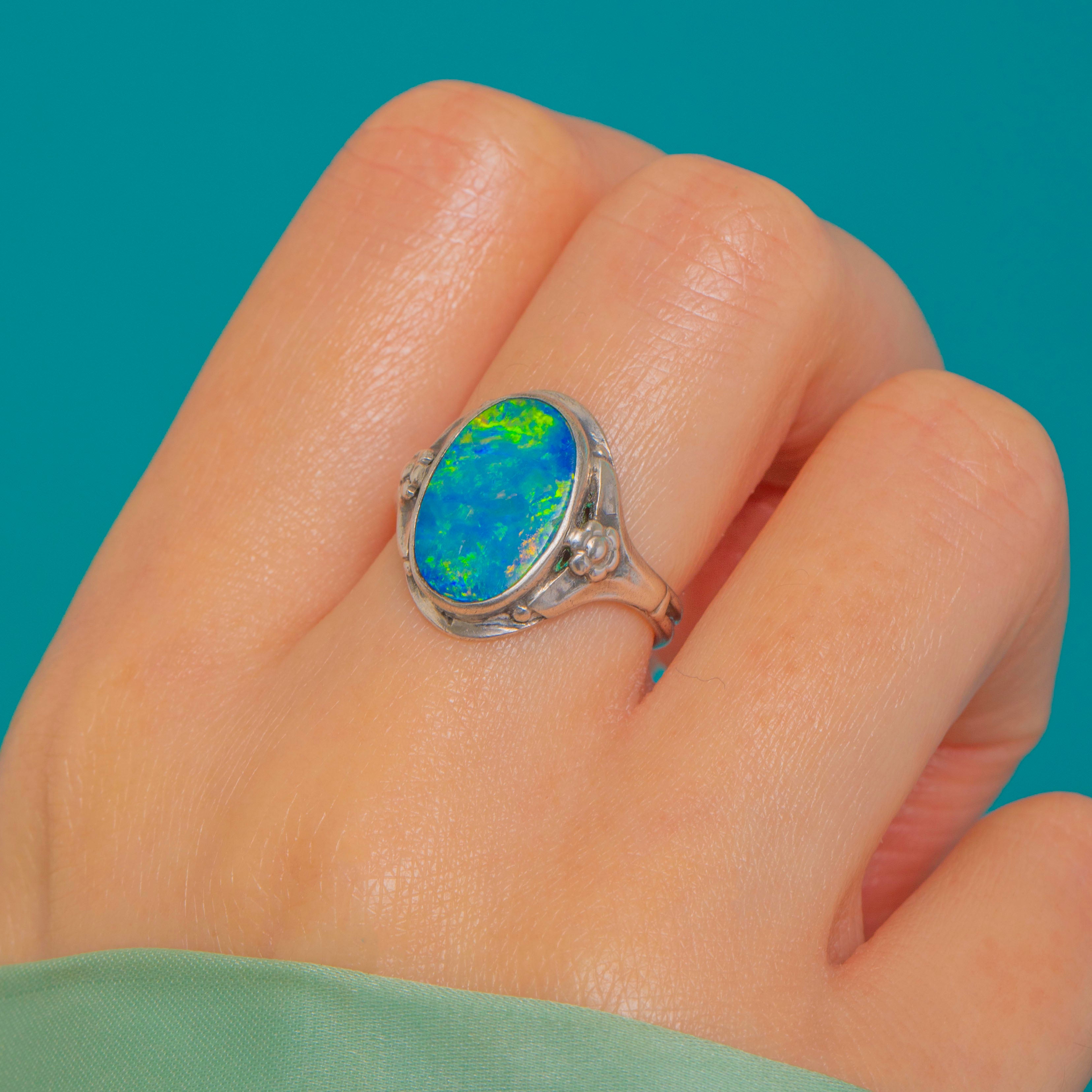 Alive with vibrant blue-green iridescence and flashes of yellow and orange, this Opal doublet ring captures the organic romance of the Arts and Crafts era. The oval cabochon is framed by a smooth rub-over bezel, creating a sleek silhouette that sits low to medium on the finger for effortless, everyday elegance.