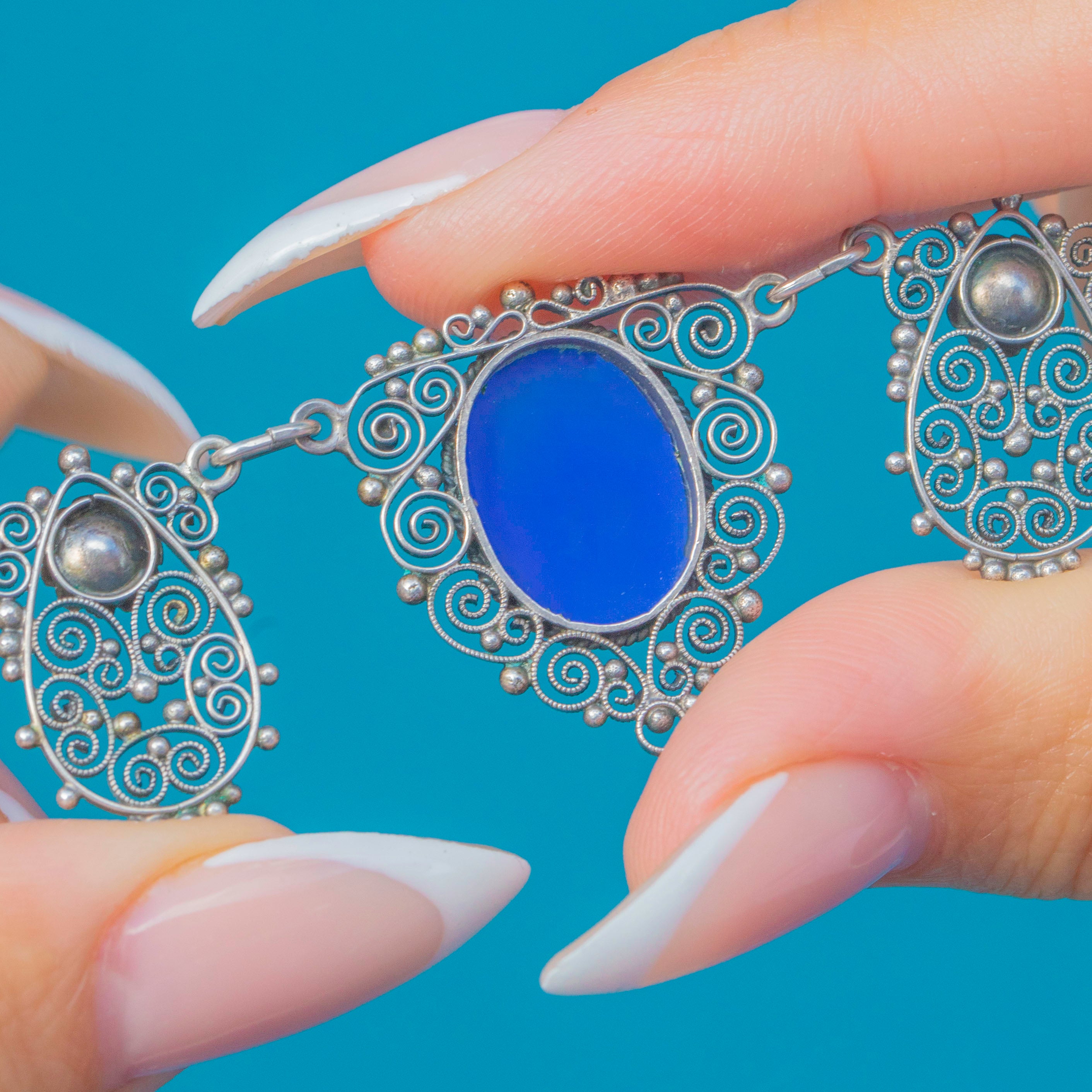 The chalcedony ovals are bright and even in colour, set in secure collet settings and linked by delicate filigree drops. Finished with a classic bolt-ring clasp, this is a gorgeous example of late 19th–early 20th century craftsmanship.