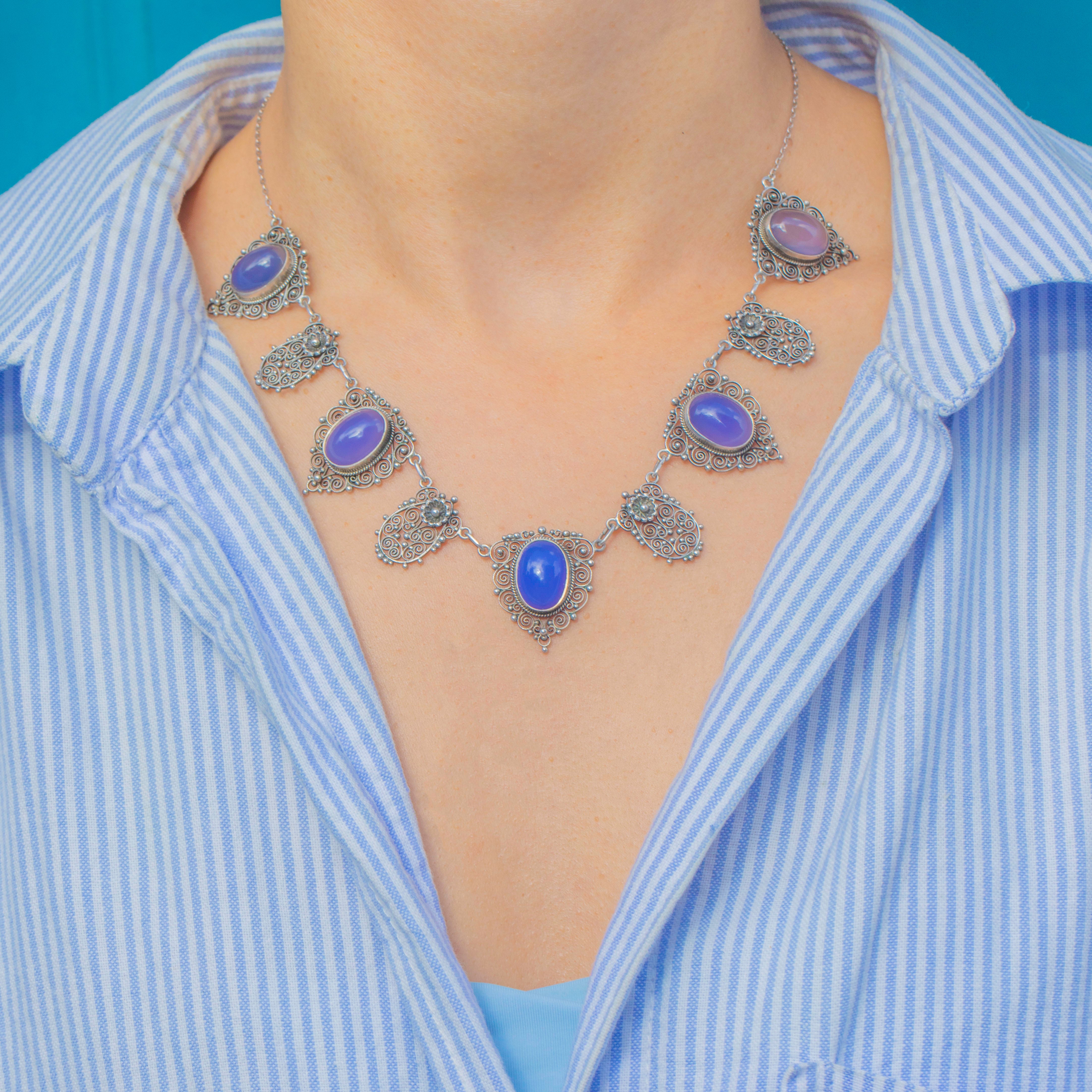 A dreamy Arts & Crafts necklace with five luminous Blue Chalcedony cabochons framed by ornate Silver filigree. The hand-worked scrolls and granulated details give wonderful movement and texture, while the cool blue stones glow beautifully on the skin. Elegant and wearable at 18", it’s a striking piece of period design that sits effortlessly with both everyday shirts and evening dresses.