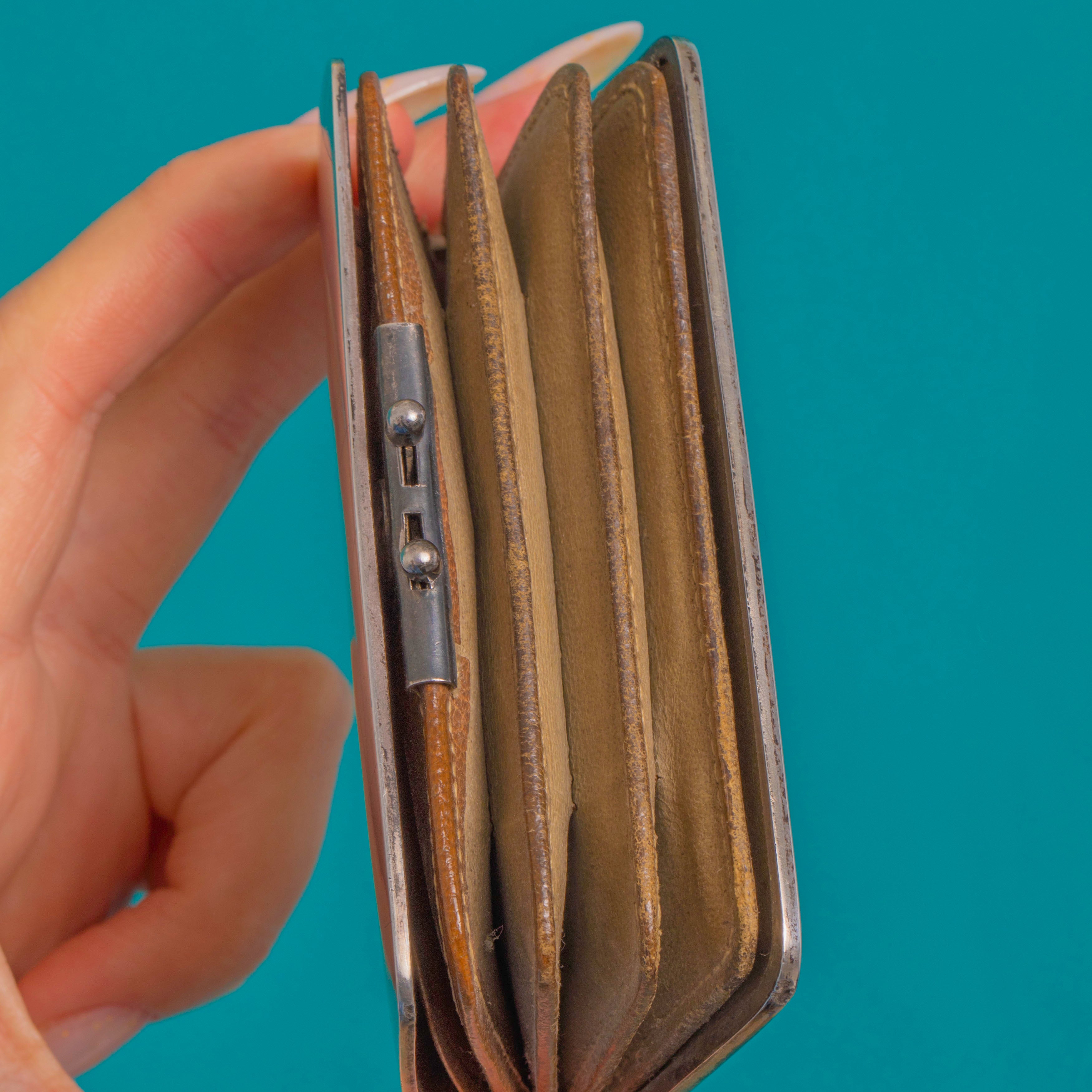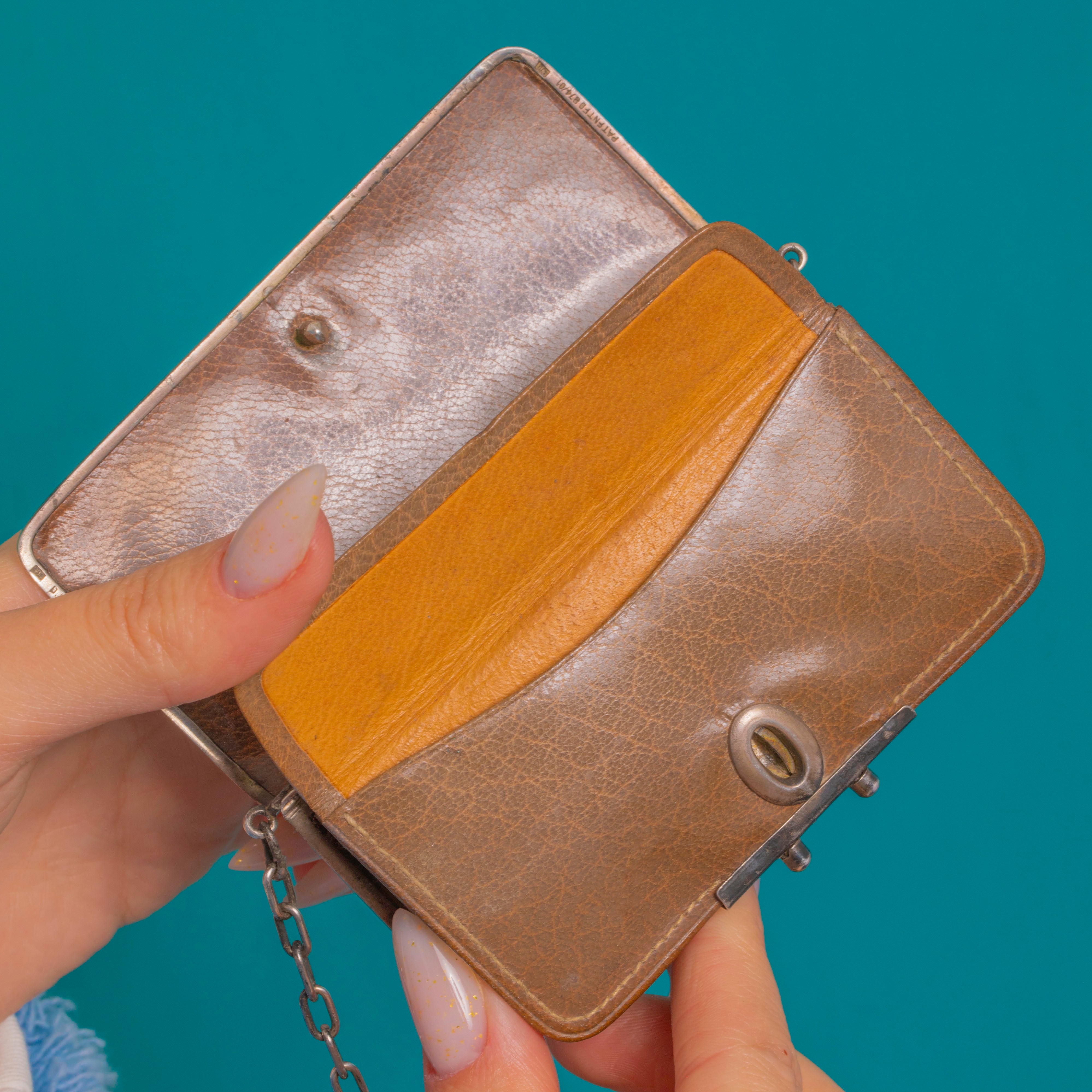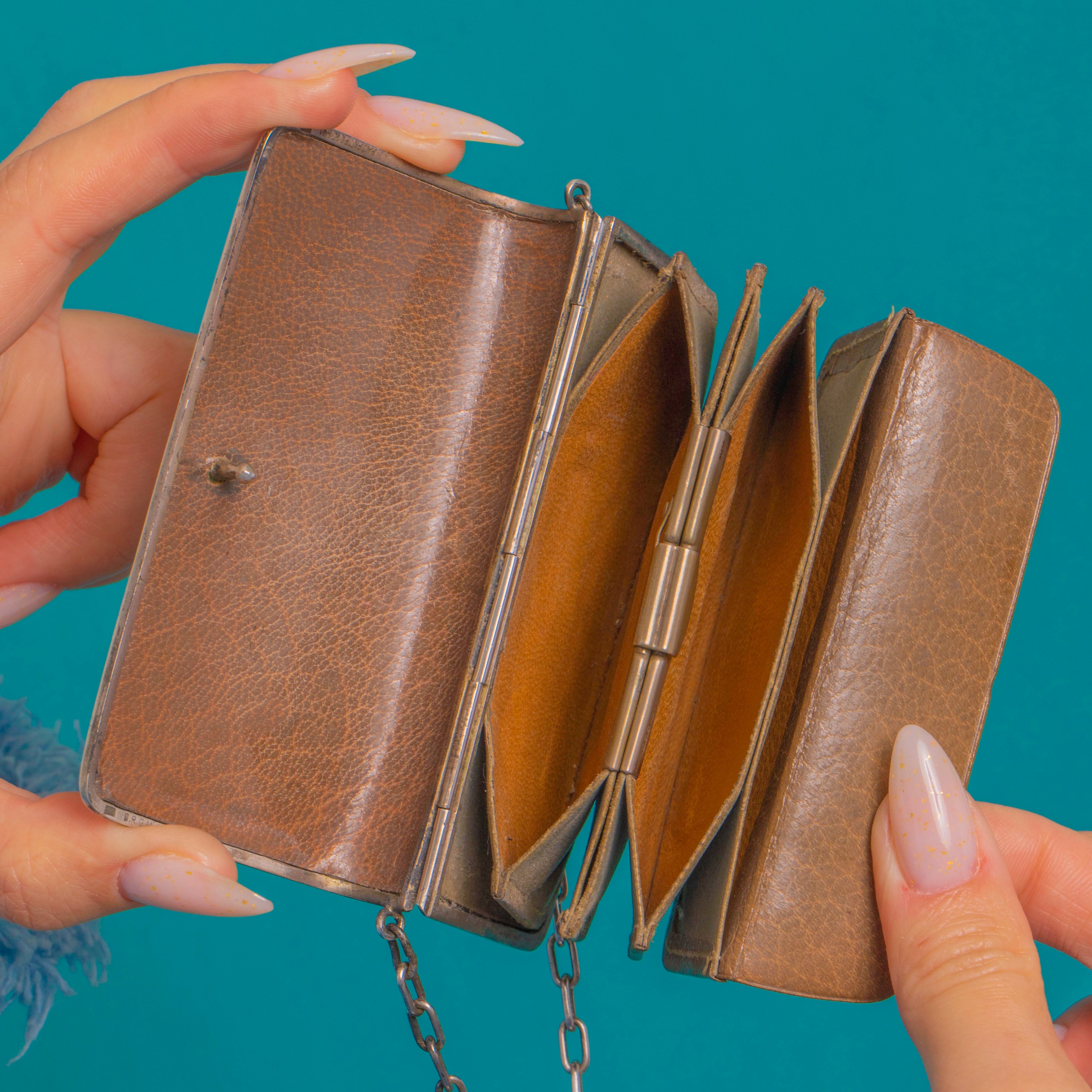 EXCELLENT: The Blue Sapphire and Red Paste cabochons are secure and free from obvious chips, with bright colour. Silver surfaces show light age-appropriate wear and a graceful patina; the long hinge and twin push-button latch operate well. The interior leather bellows are intact with mild creasing and edge rubbing from age, with a tiny spot of verdigris at one interior rivet and no visible repairs.